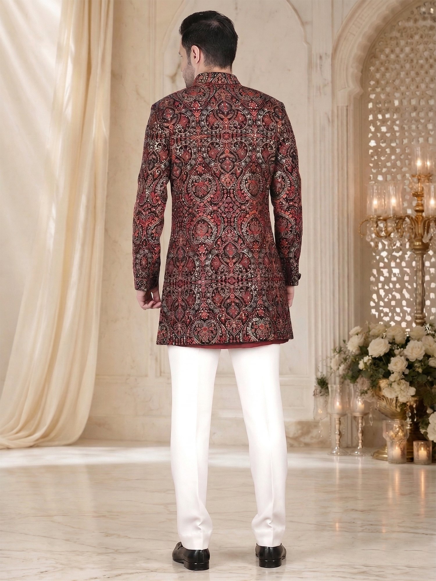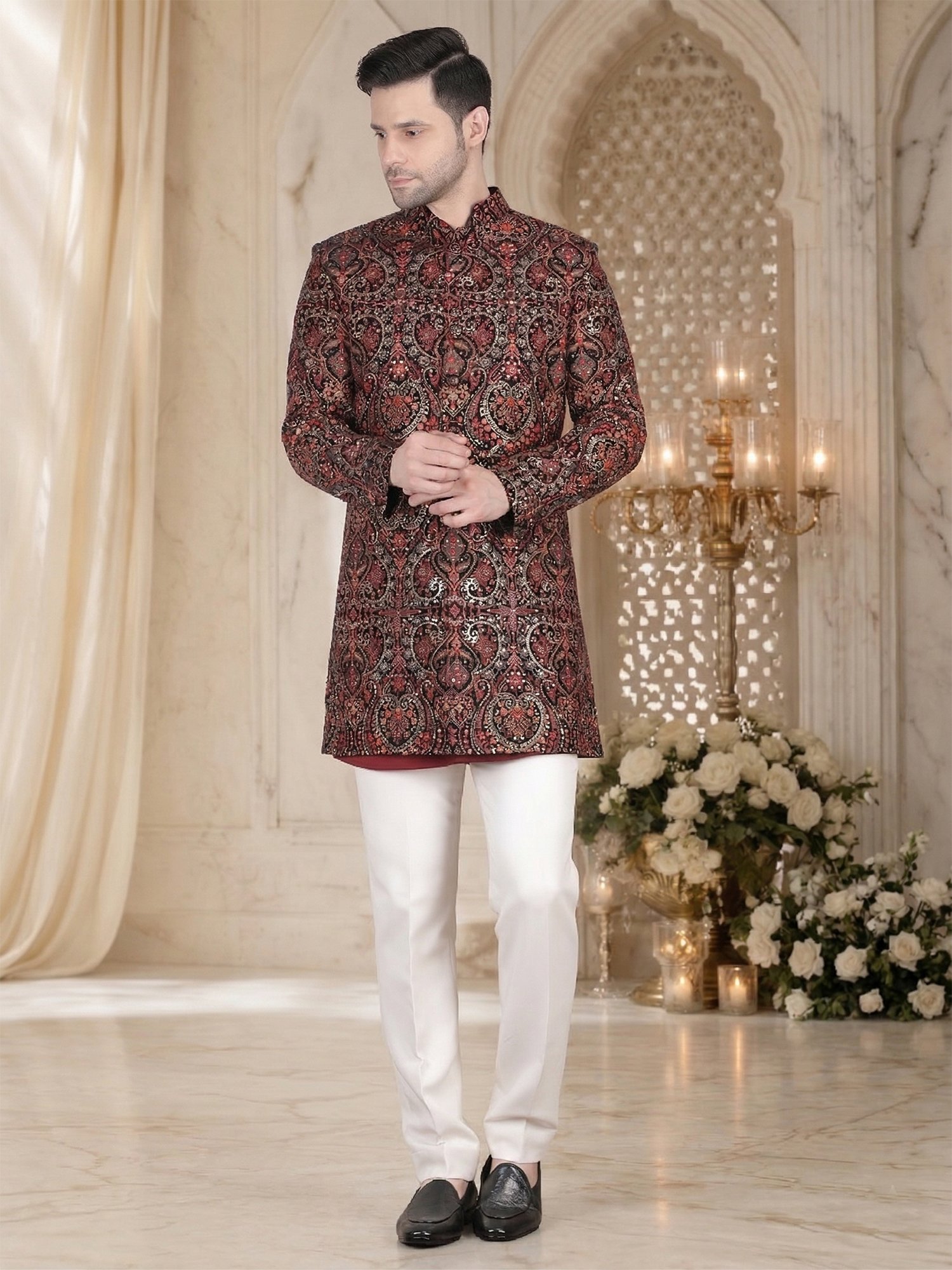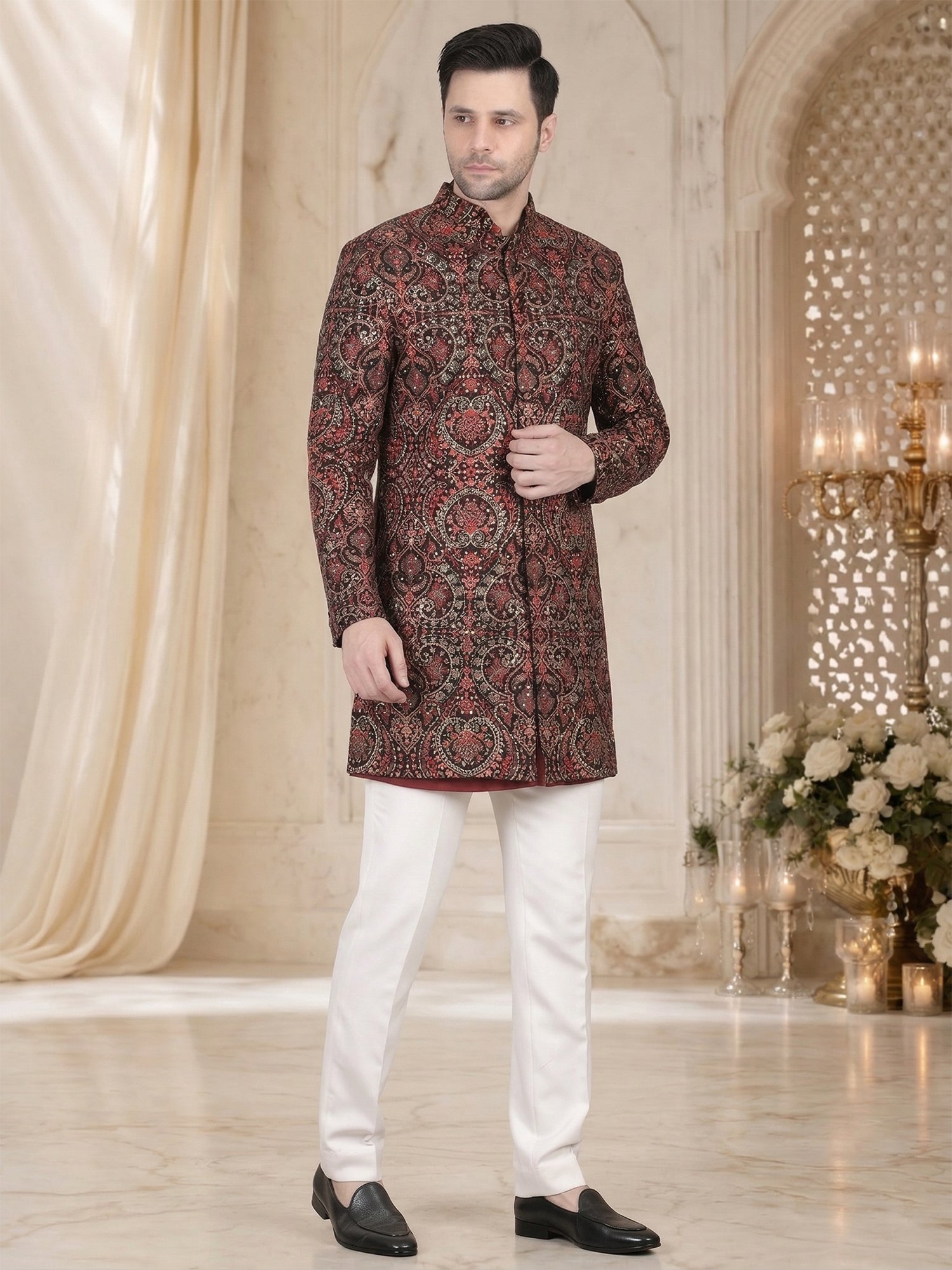 Pair this sherwani with ivory or off-white churidar pants for a balanced contrast. You can also add a statement brooch or pocket square for a royal touch. Traditional mojris or embroidered juttis will complete the outfit perfectly.