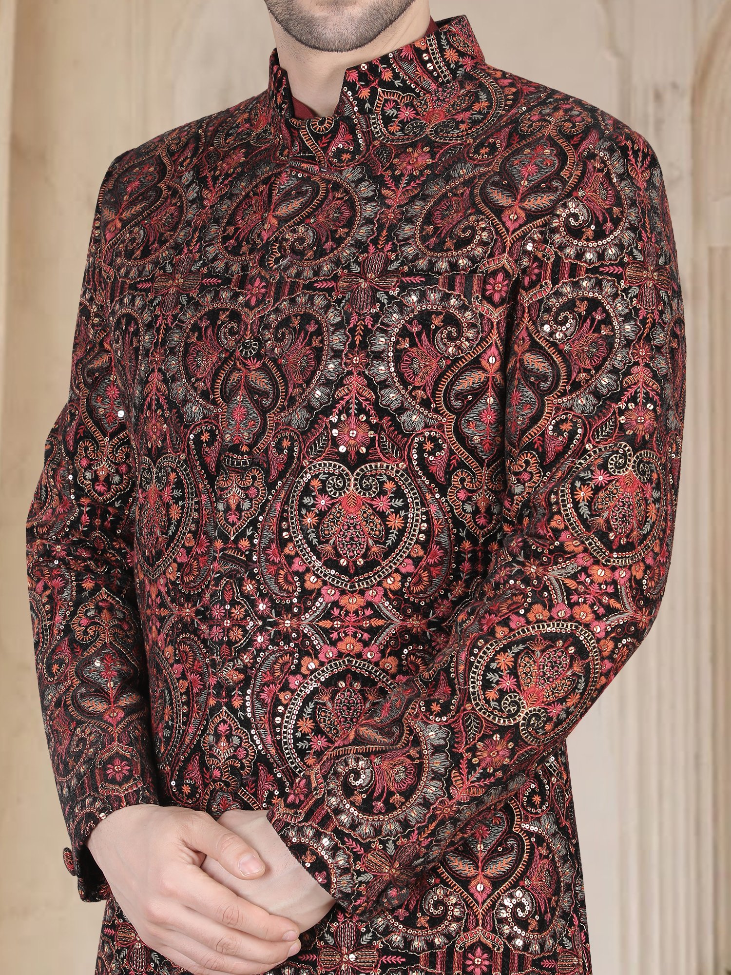 We craft this sherwani using premium velvet base fabric, which gives a rich texture and a luxurious feel. The surface features heavy multi-thread and sequin embroidery arranged in a detailed paisley heritage pattern. Also, the embroidery spreads evenly across the fabric, creating a dense and regal look without compromising comfort. Moreover, skilled artisans complete each piece with precision and attention to detail, ensuring a flawless and premium finish.