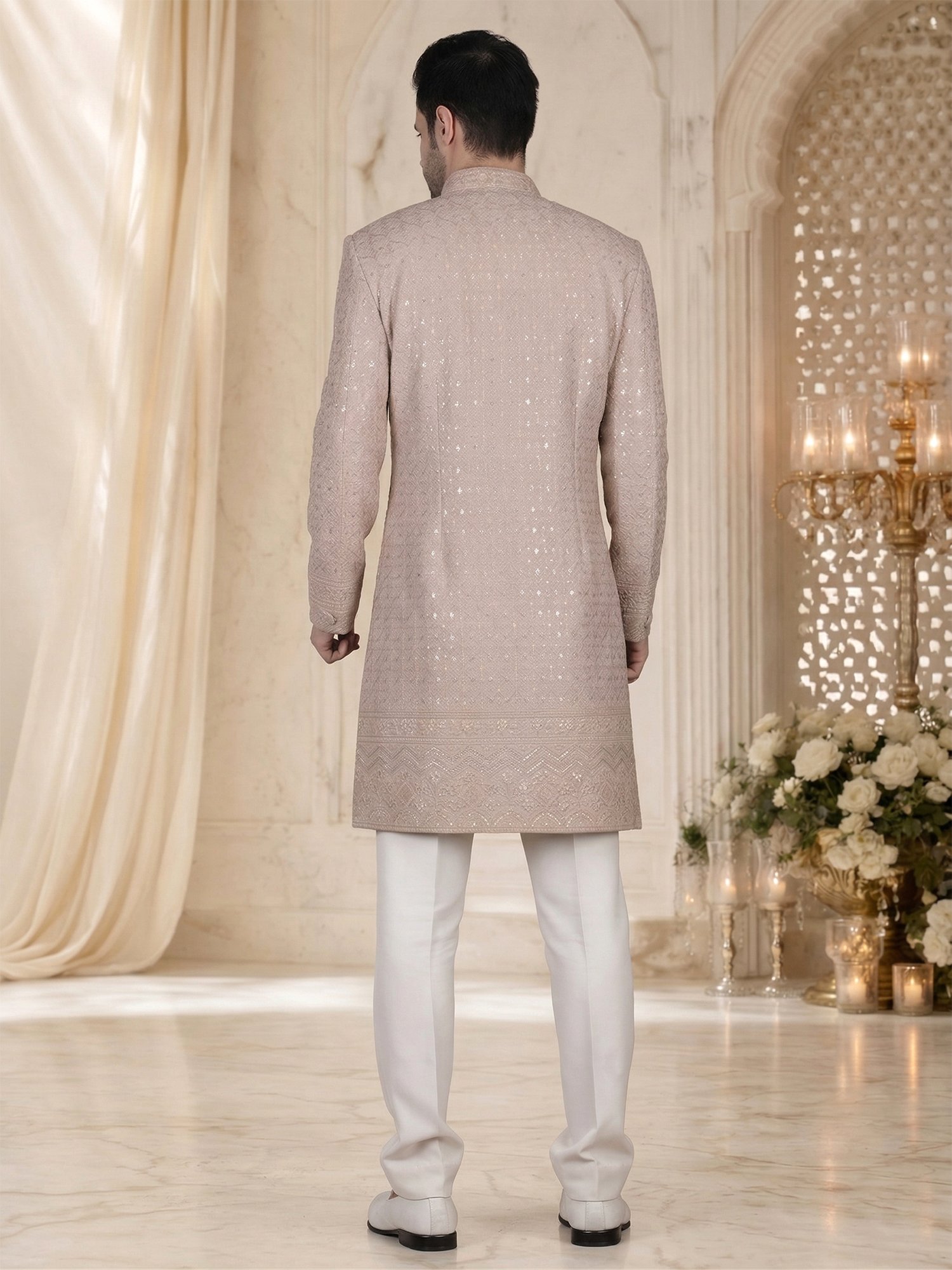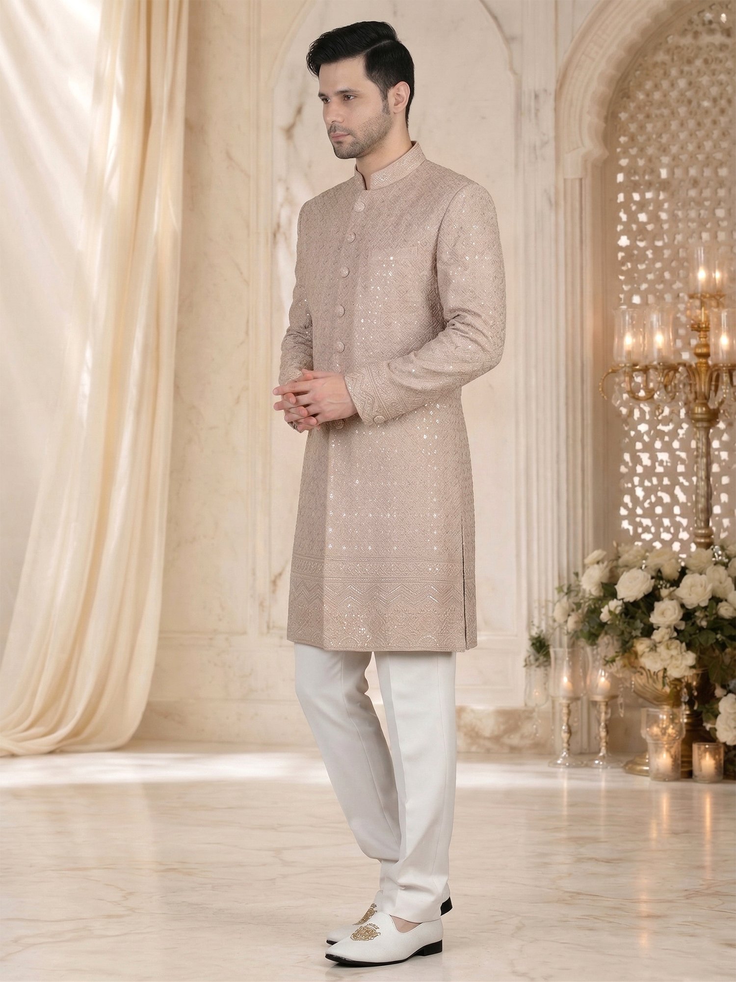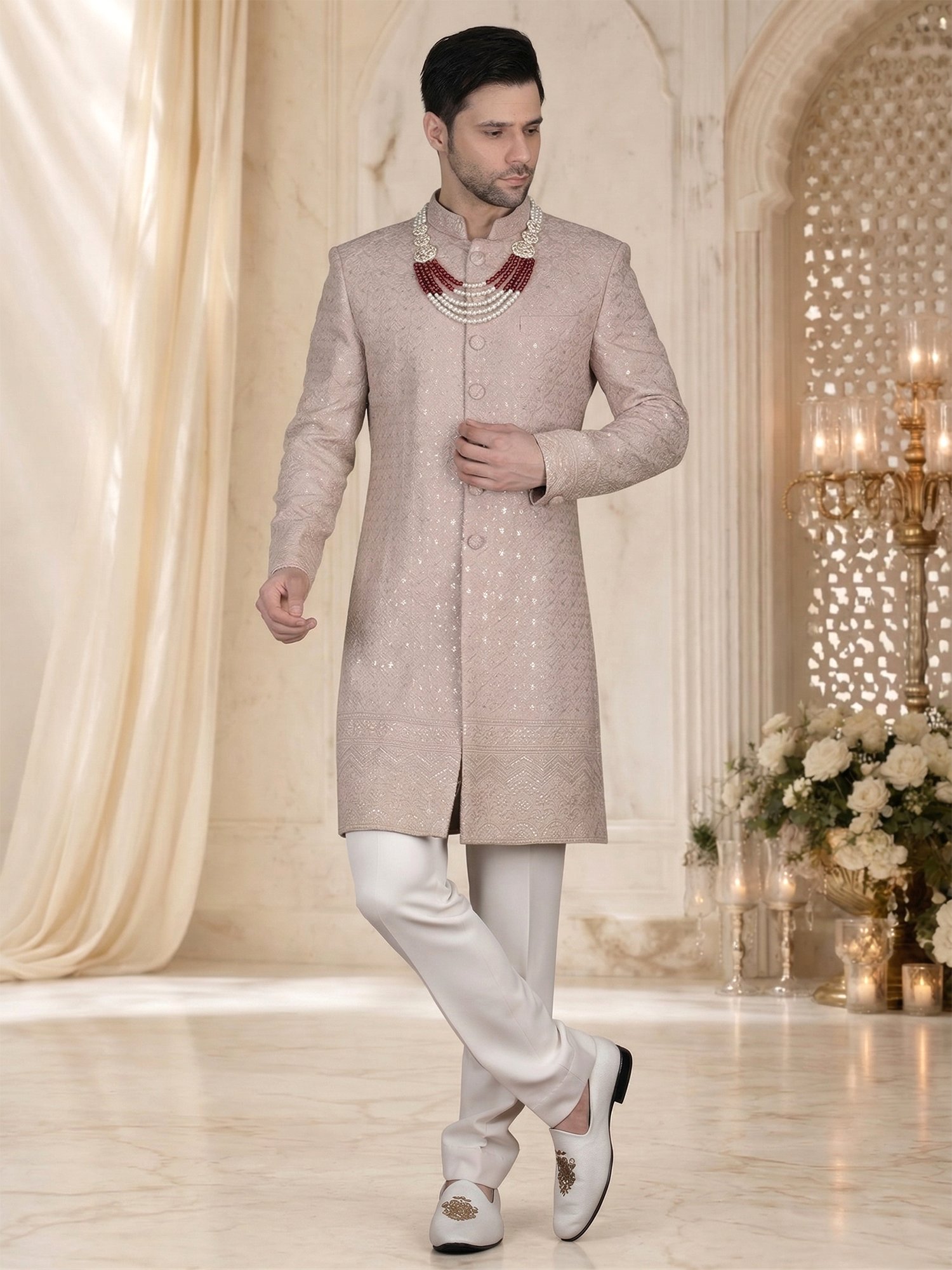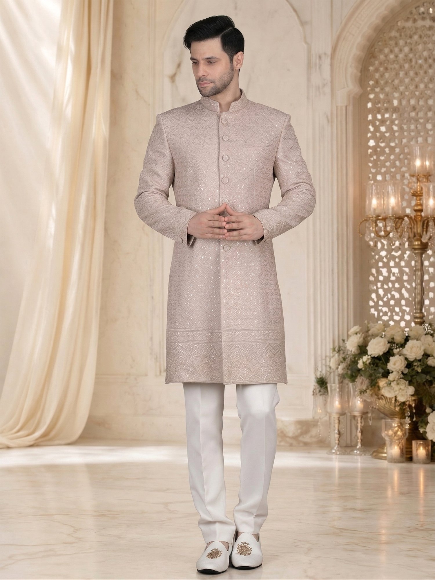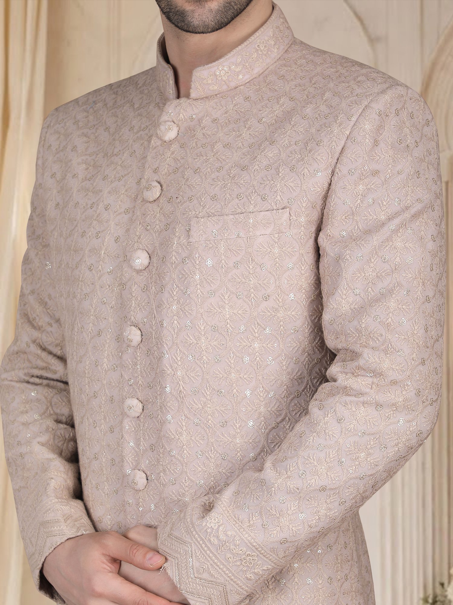 Peach Embroidered Sherwani for Men – Fabric & Craftsmanship