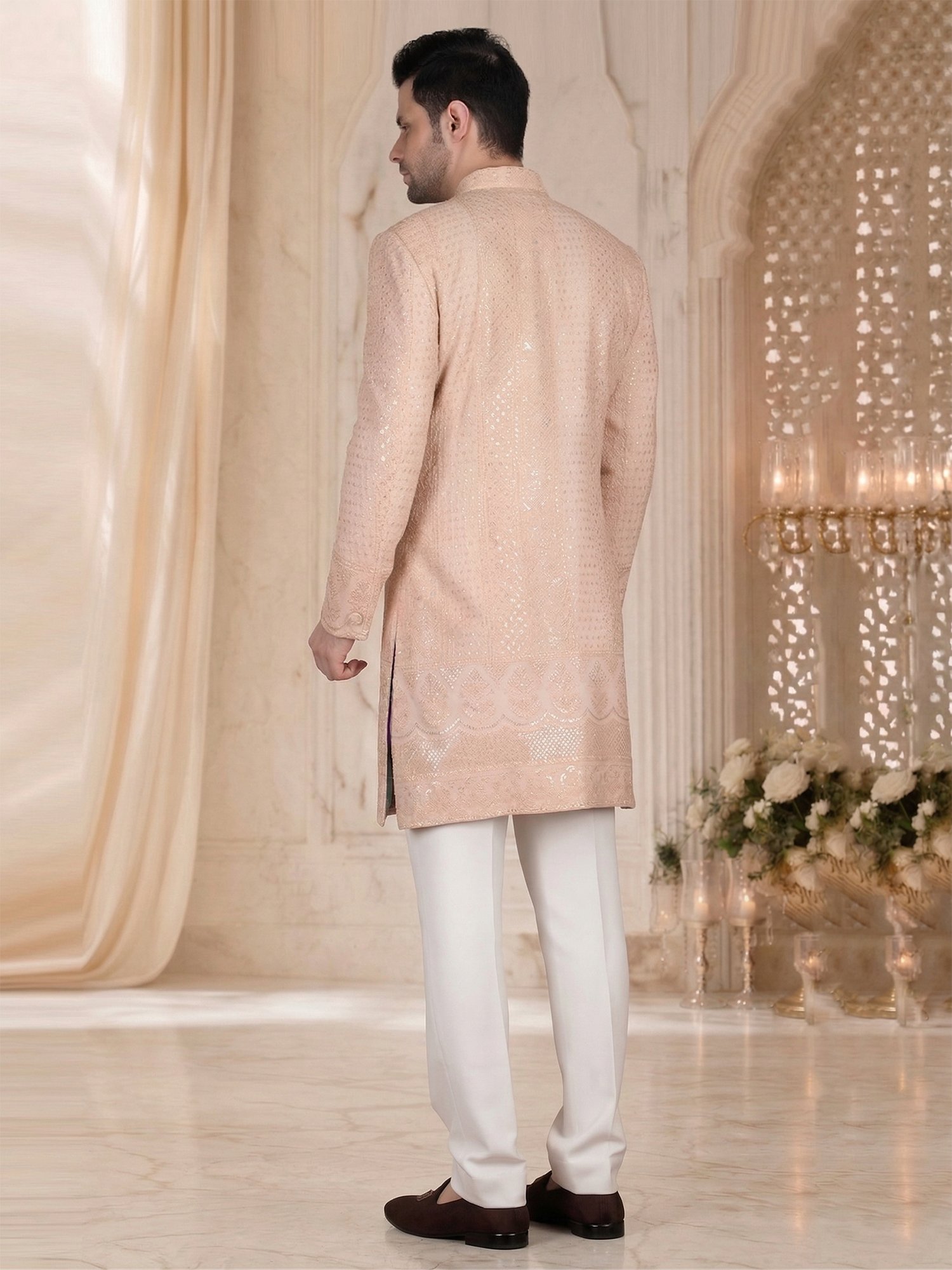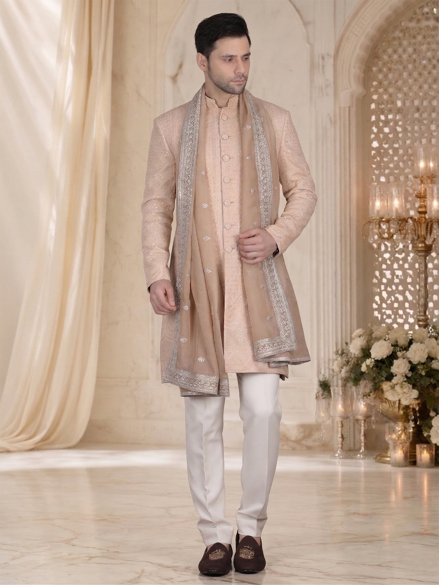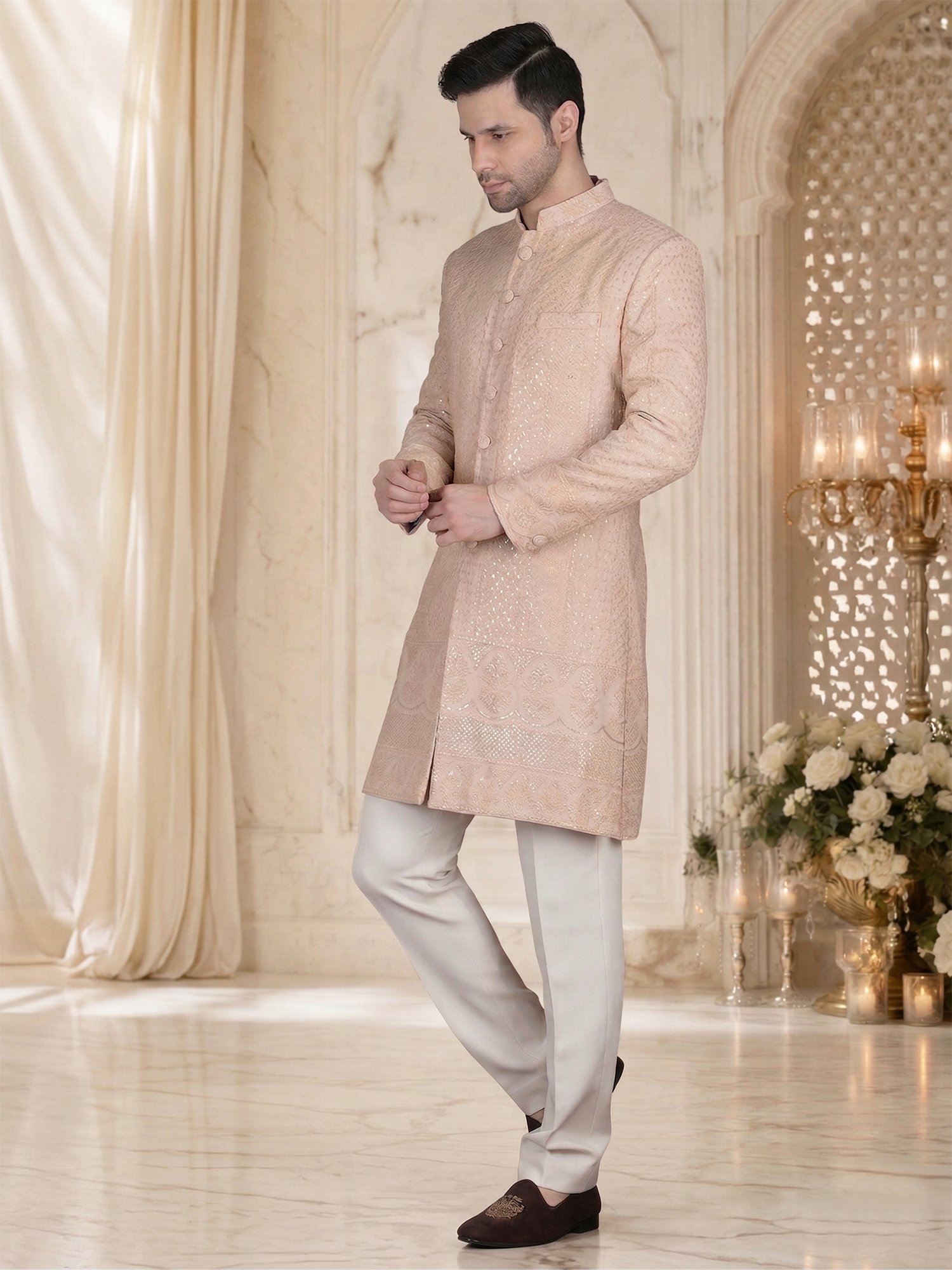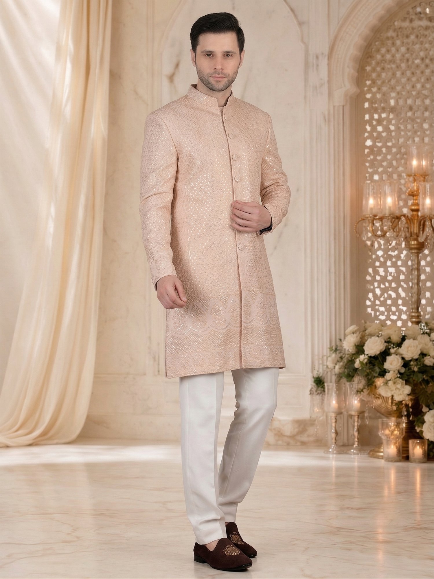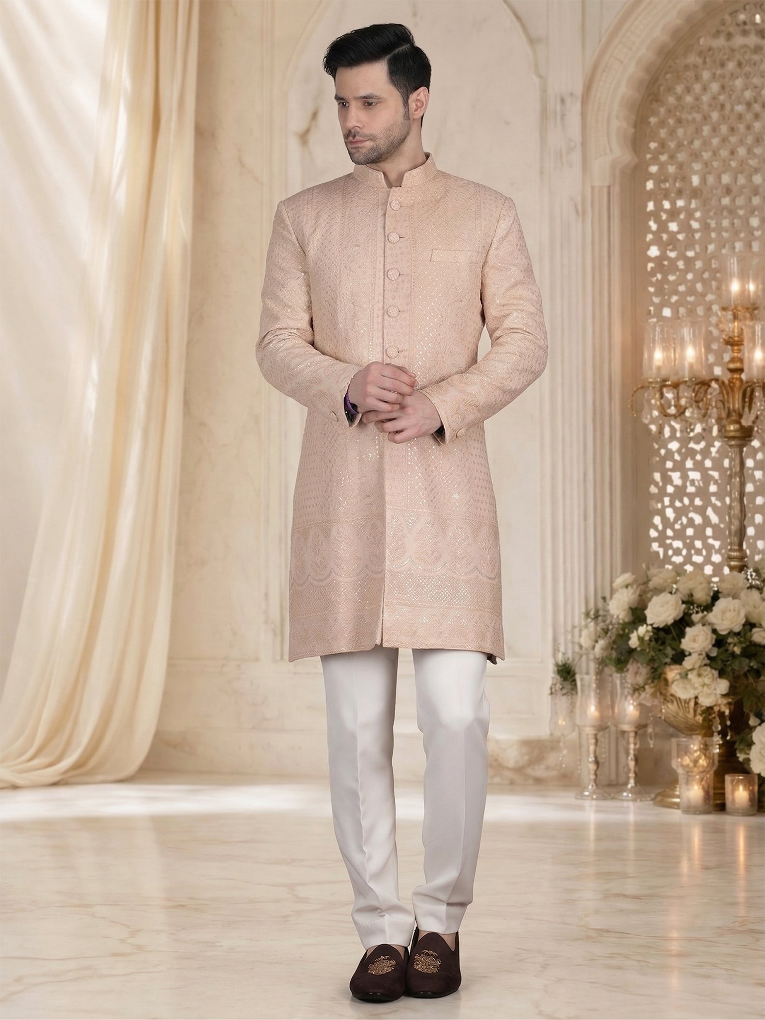 Pair this sherwani with white or ivory churidar for a seamless look. Add minimal accessories like a brooch for a refined touch. Complete the outfit with classic mojris or formal loafers.