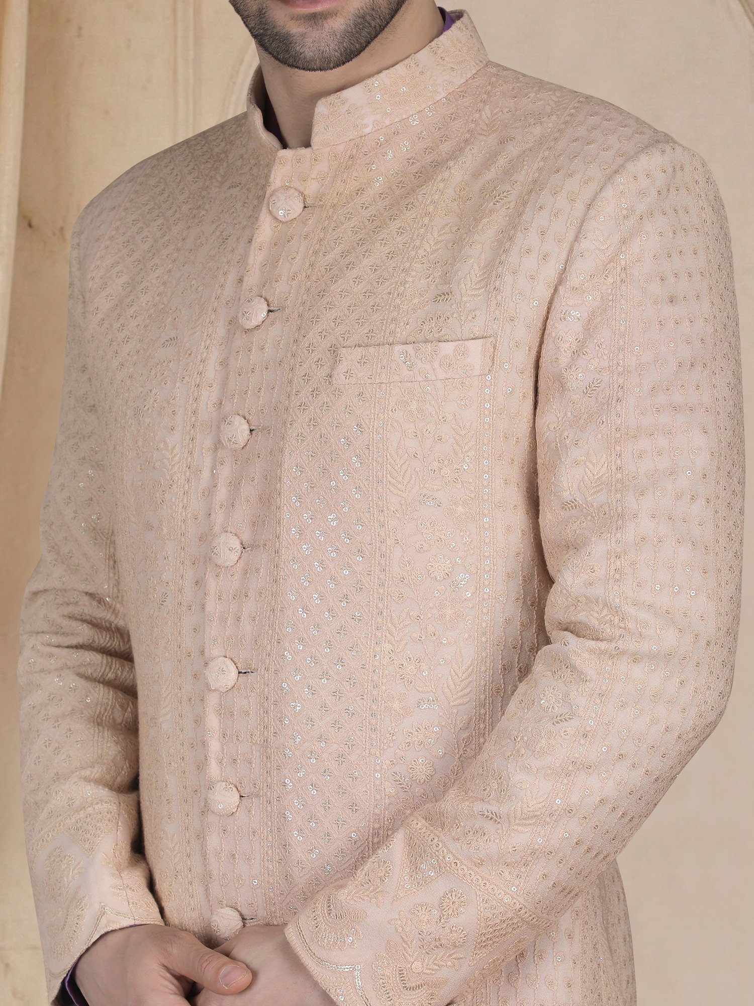 We craft this sherwani using premium fabric that supports fine self embroidery while maintaining comfort and structure. The embroidery is evenly distributed across the outfit, creating a consistent and balanced design. Each motif is carefully crafted using matching thread, ensuring a smooth and refined finish. The tonal embroidery technique adds depth to the fabric without introducing shine or heavy contrast. You can clearly notice the precision and neatness of the work, which reflects skilled craftsmanship. Also, the clean front panel and minimal detailing add to its modern appeal. Moreover, the stitching and tailored construction ensure durability and a sharp fit.