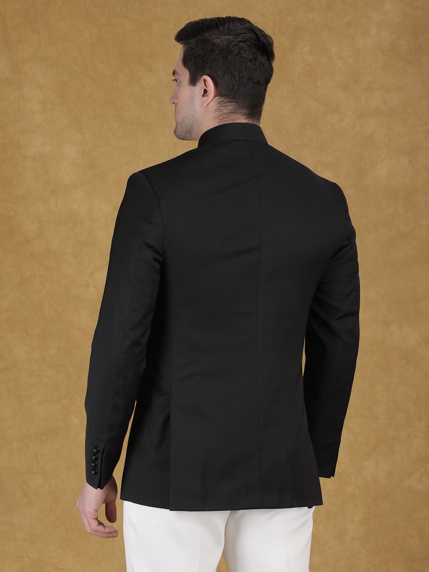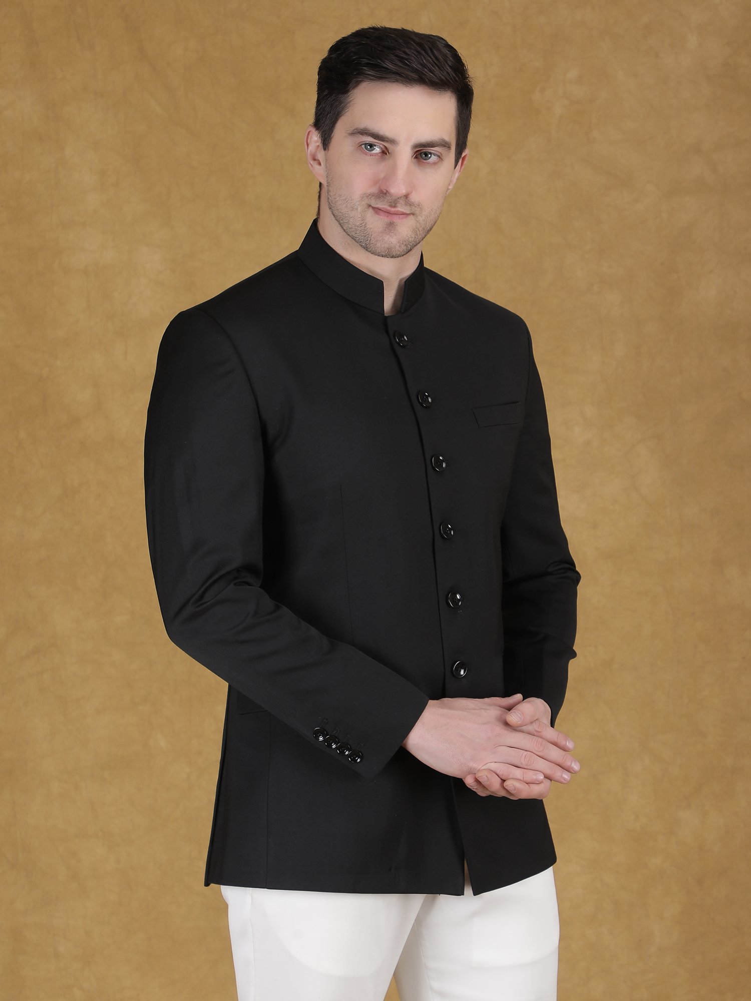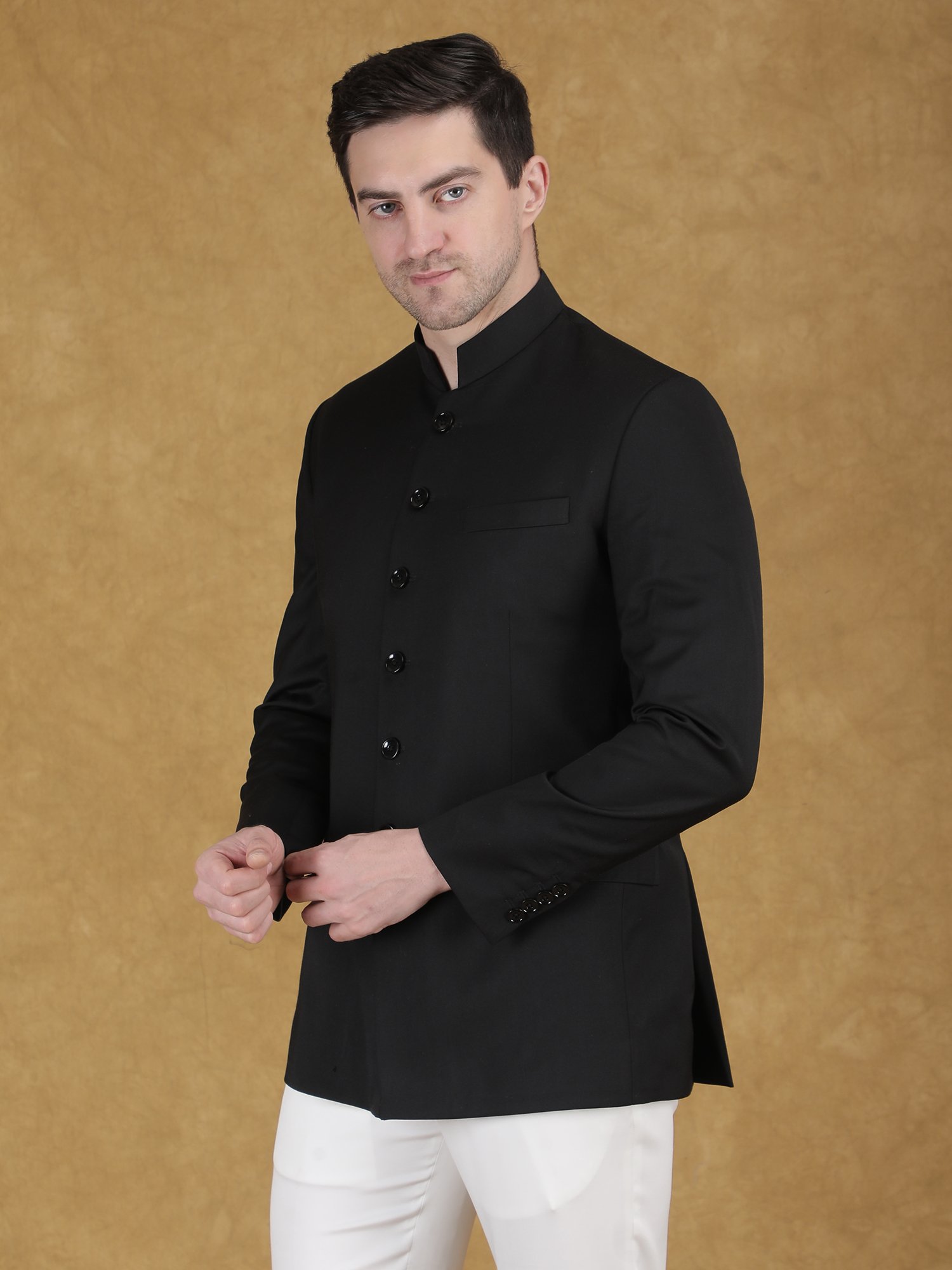 Pair this bandhgala with ivory or white trousers for a classic contrast. Keep accessories minimal for a clean and elegant look. Complete the outfit with formal shoes or classic loafers.