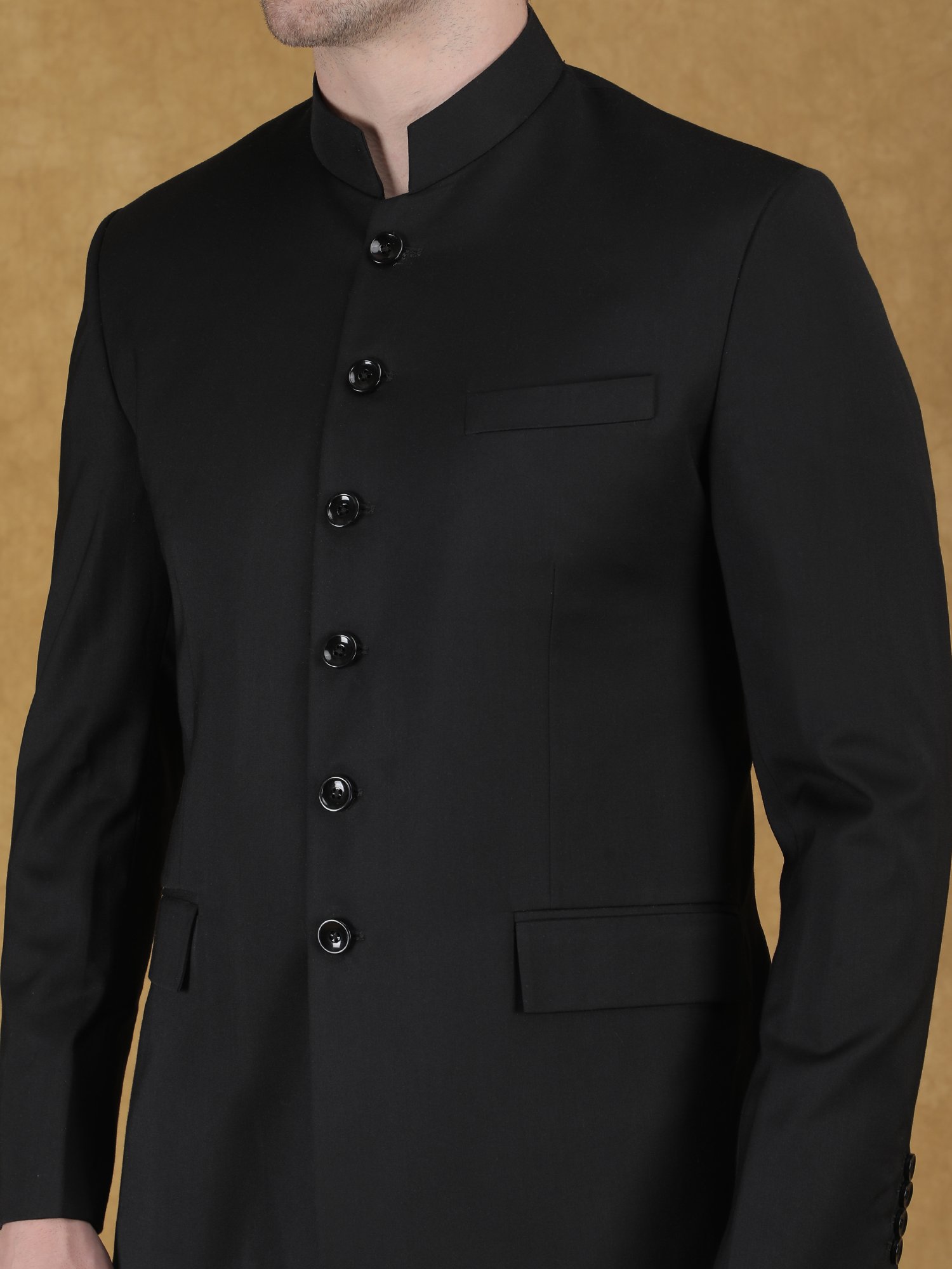 We craft this bandhgala using premium wool blend fabric that offers a structured fall, durability, and long-lasting comfort. The fabric provides a smooth surface with a refined matte finish, ensuring a clean and formal appearance. The absence of embroidery highlights the precision of tailoring and the quality of the material. You can clearly observe the sharp cuts, clean seams, and balanced proportions, reflecting high-quality craftsmanship. The buttons are neatly aligned, and the structured collar adds to its formal elegance. Also, the minimal detailing ensures that the design remains timeless and versatile. Moreover, the stitching and construction ensure durability and a perfect tailored fit.