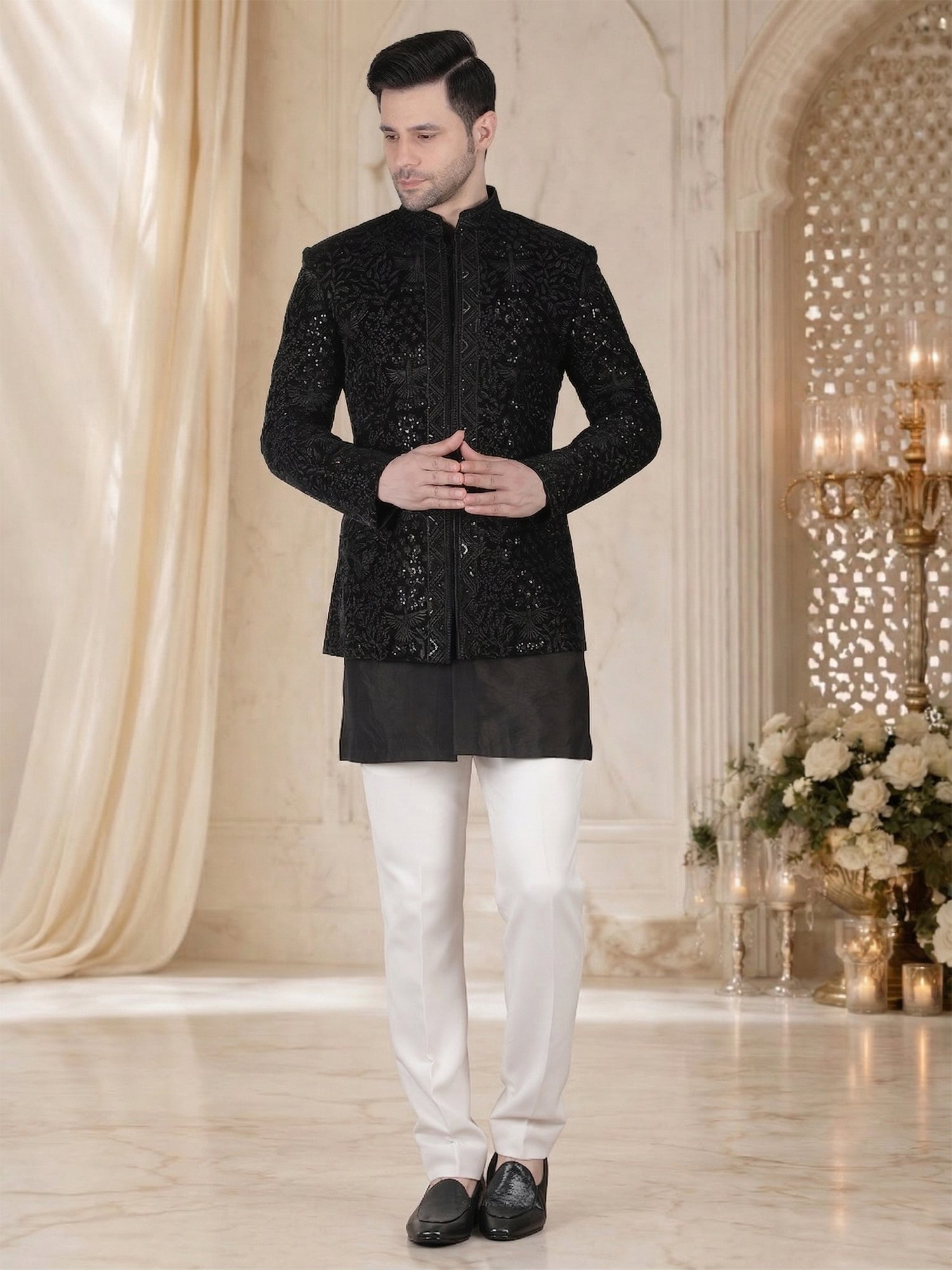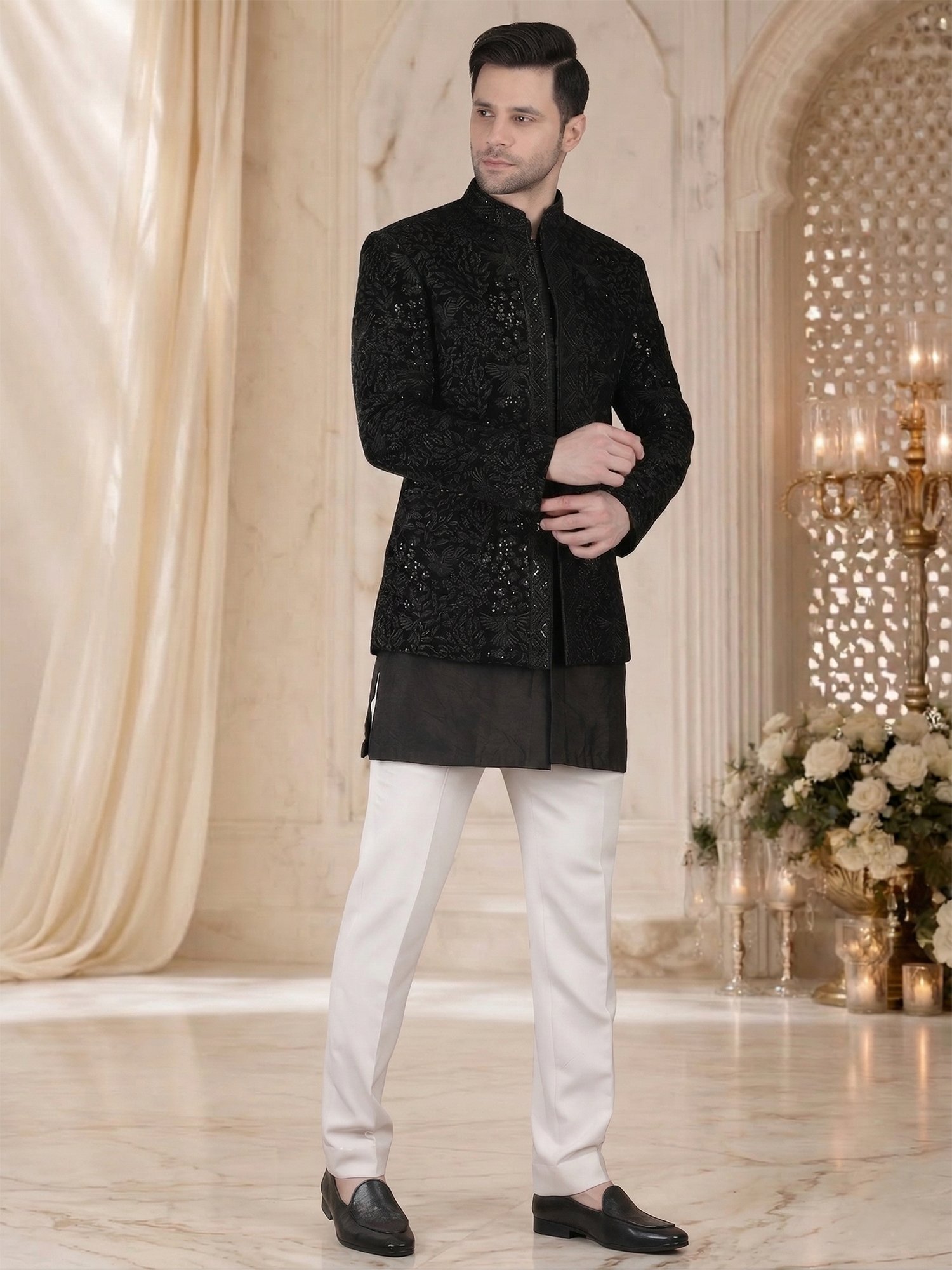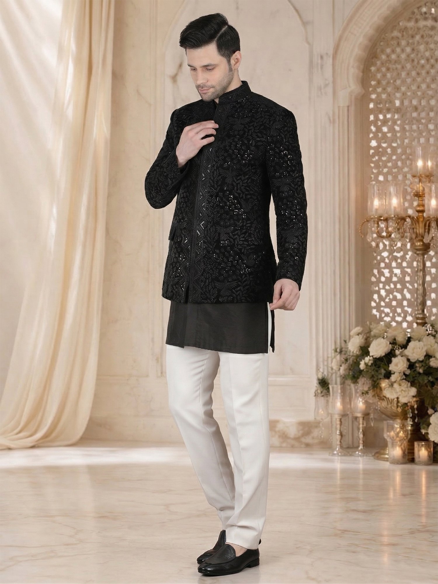 Pair this bandhgala with black trousers for a sleek monochrome look or ivory trousers for contrast. Keep accessories minimal to highlight the embroidery. Complete the look with formal shoes or loafers.