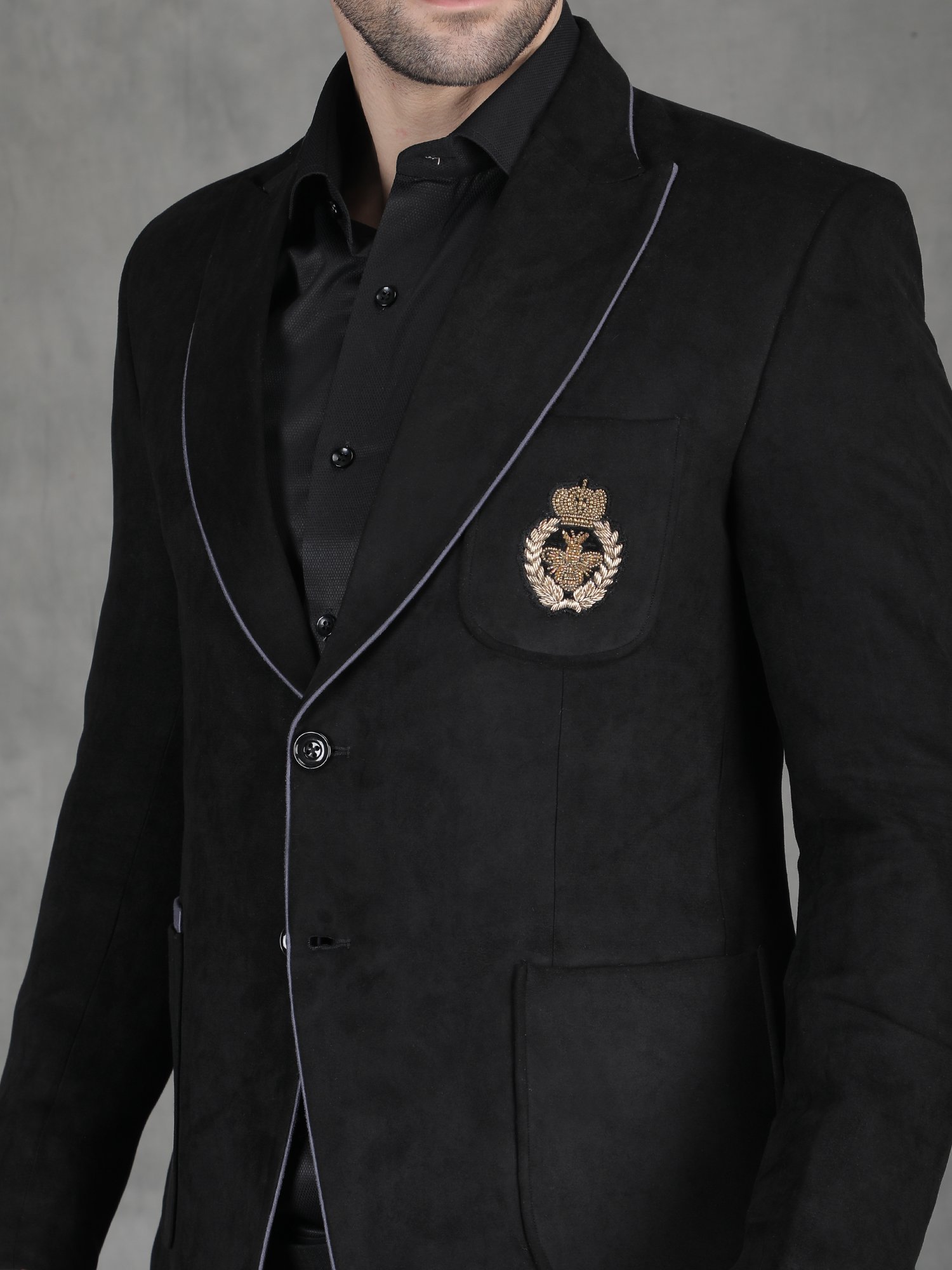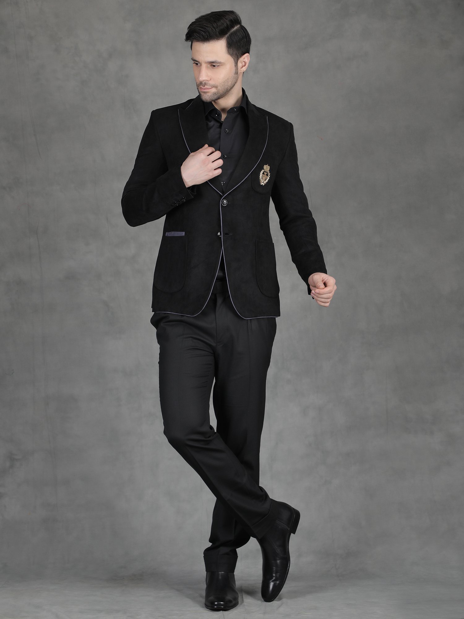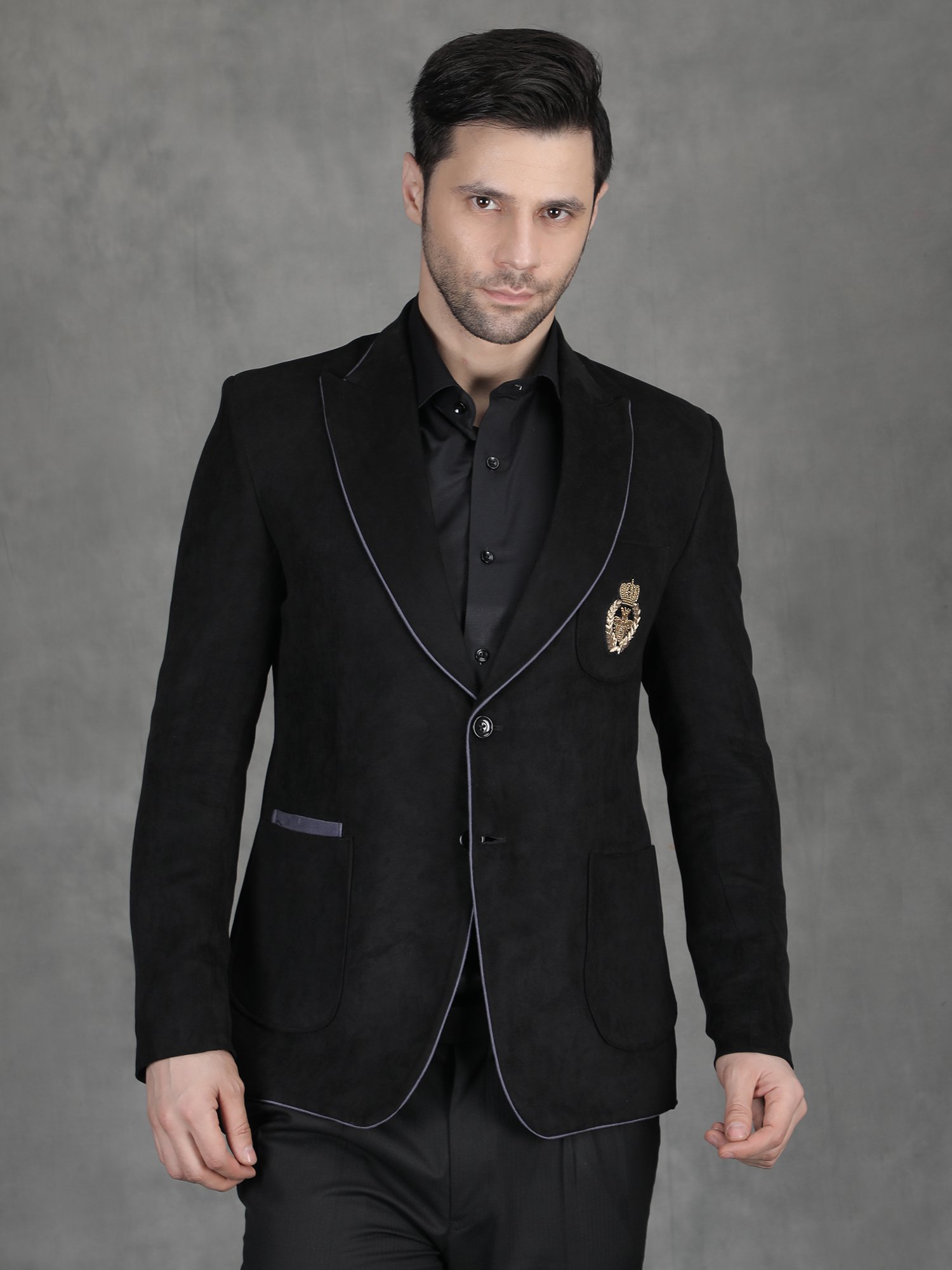 This Black Suede Embroidery Blazer presents a bold and luxurious look designed for reception and evening occasions. The rich black base combined with detailed hand motif embroidery creates a strong and refined presence. The embroidery is carefully placed to highlight the chest area, adding a royal accent without overwhelming the design. Therefore, this Black Suede Embroidery Blazer becomes an ideal choice for men who want a statement outfit with controlled elegance. Moreover, the deep tone enhances the overall sharpness, making it perfect for night events and formal gatherings.