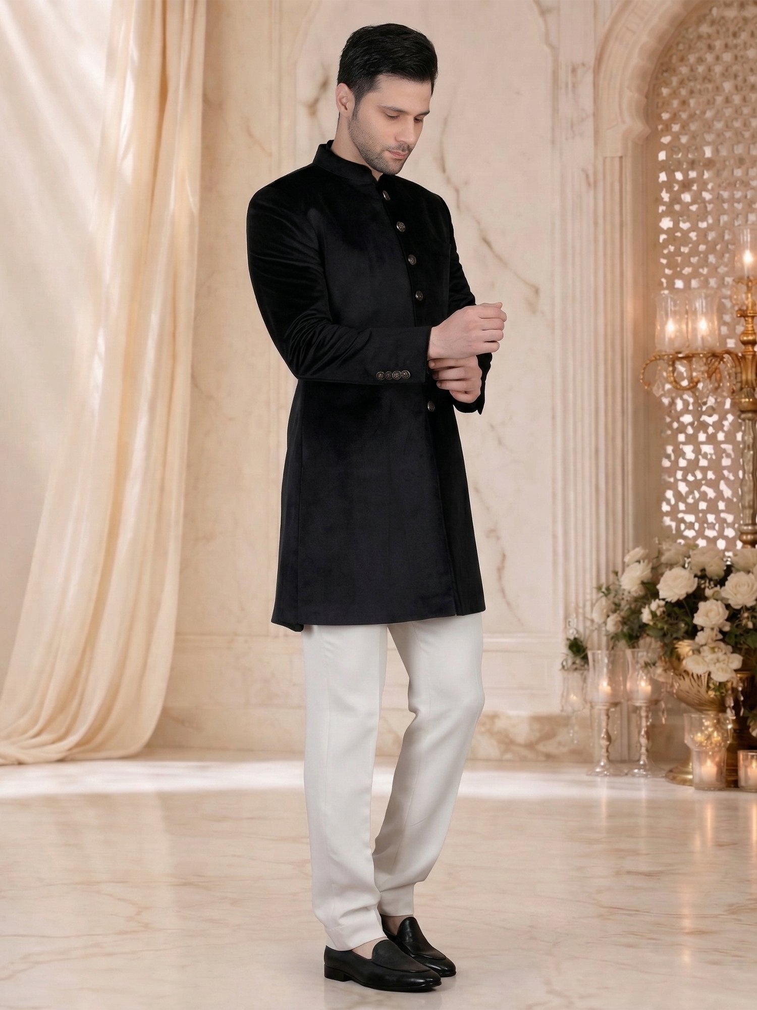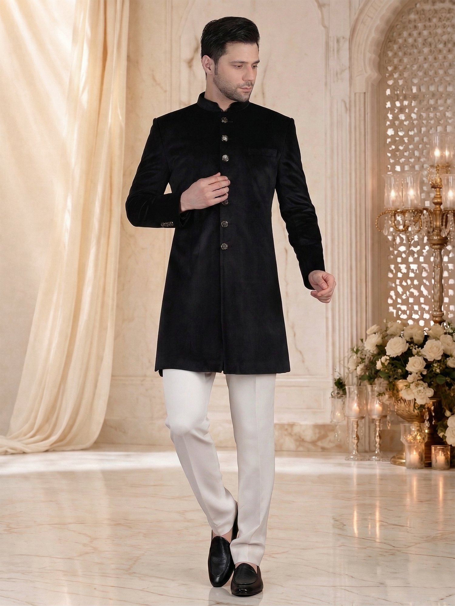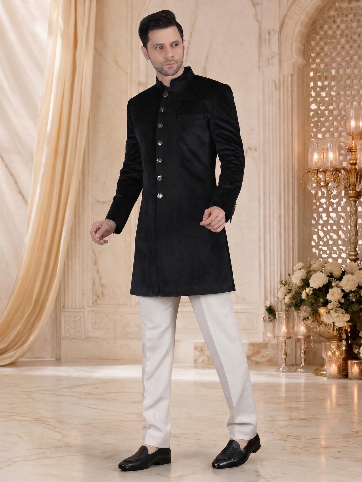 Pair this sherwani with ivory or off-white churidar for a classic contrast. Add a statement brooch or pocket accessory if you want a slight highlight. Complete the outfit with formal loafers or classic mojris.