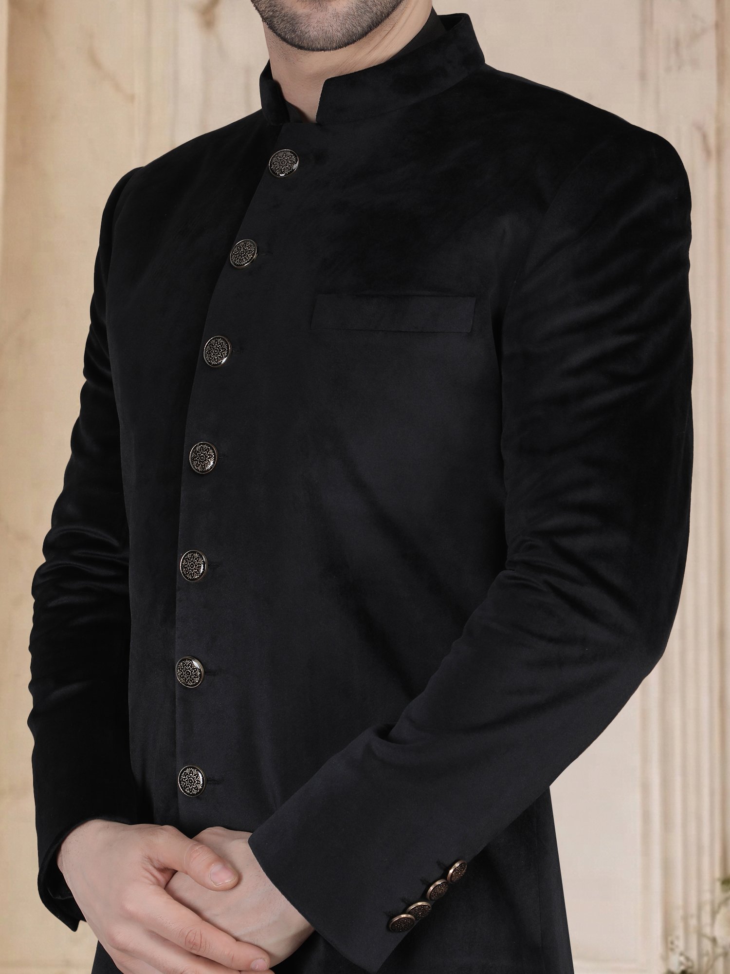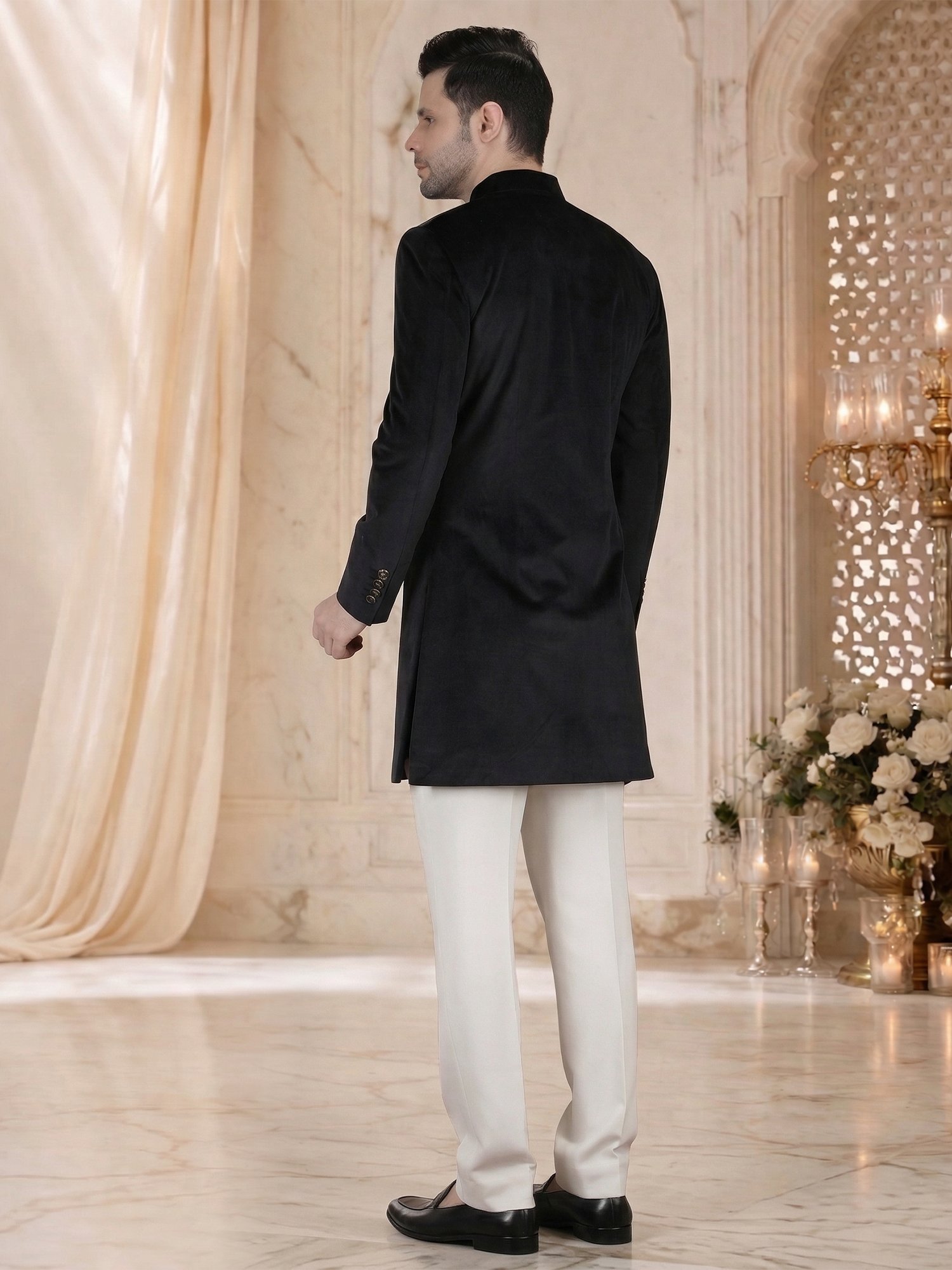 We craft this sherwani using high-quality cotton velvet fabric that provides a smooth texture and structured fall. The fabric has a natural depth that changes slightly under light, giving it a subtle richness without shine. The clean surface highlights the precision of tailoring, where every seam, button placement, and cut is clearly visible. Also, the minimal design ensures versatility, allowing the outfit to adapt to different styling choices. Moreover, the stitching and structured construction ensure durability, comfort, and a sharp fit that maintains its form throughout the event.