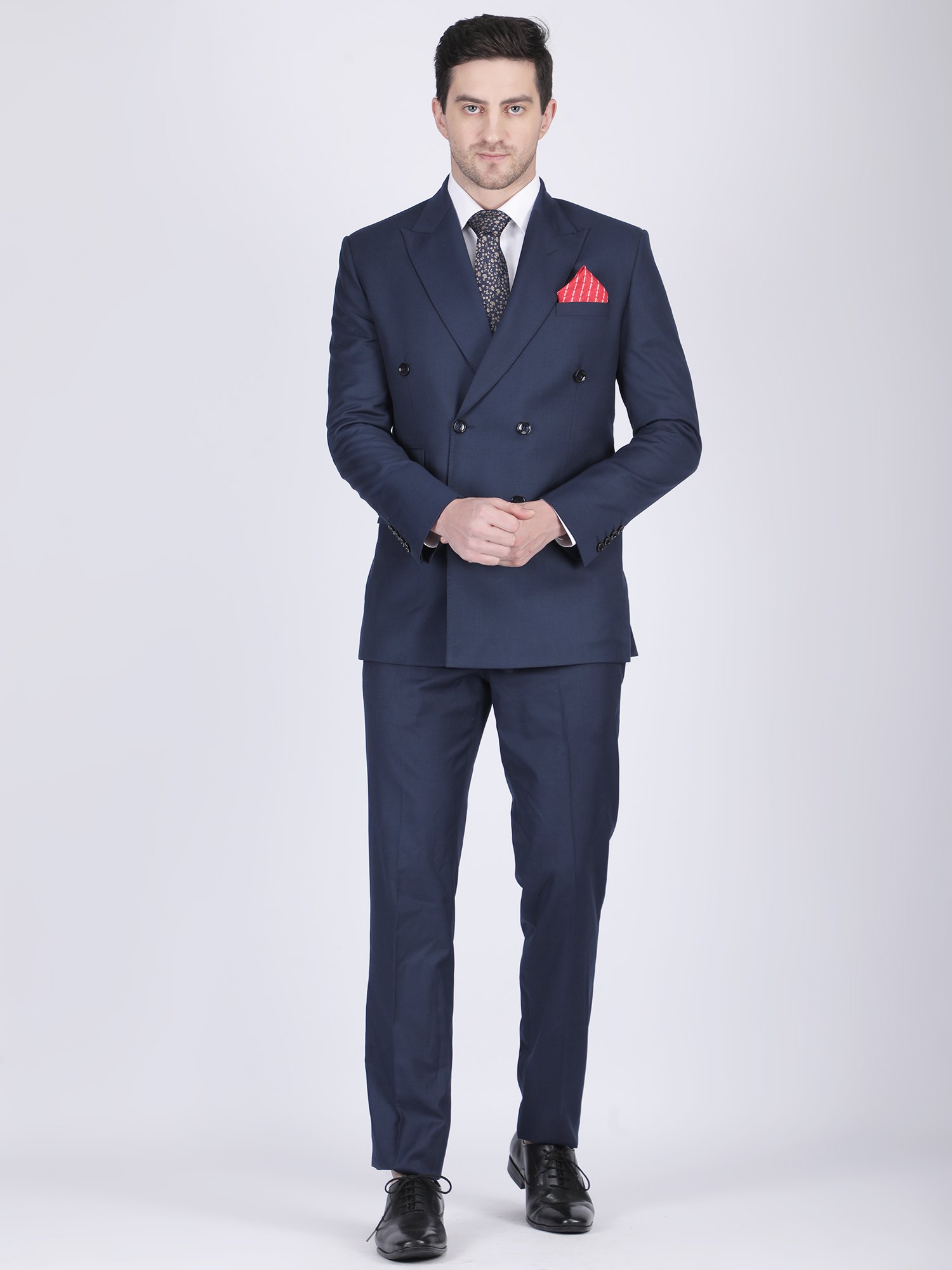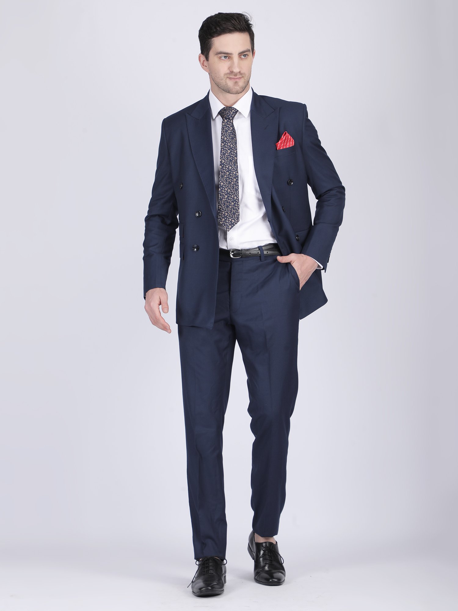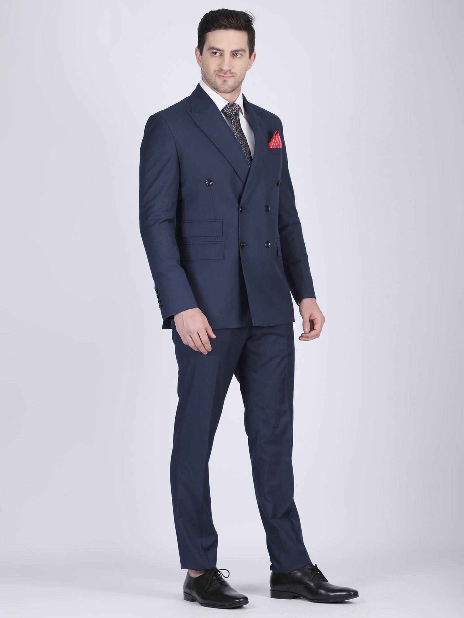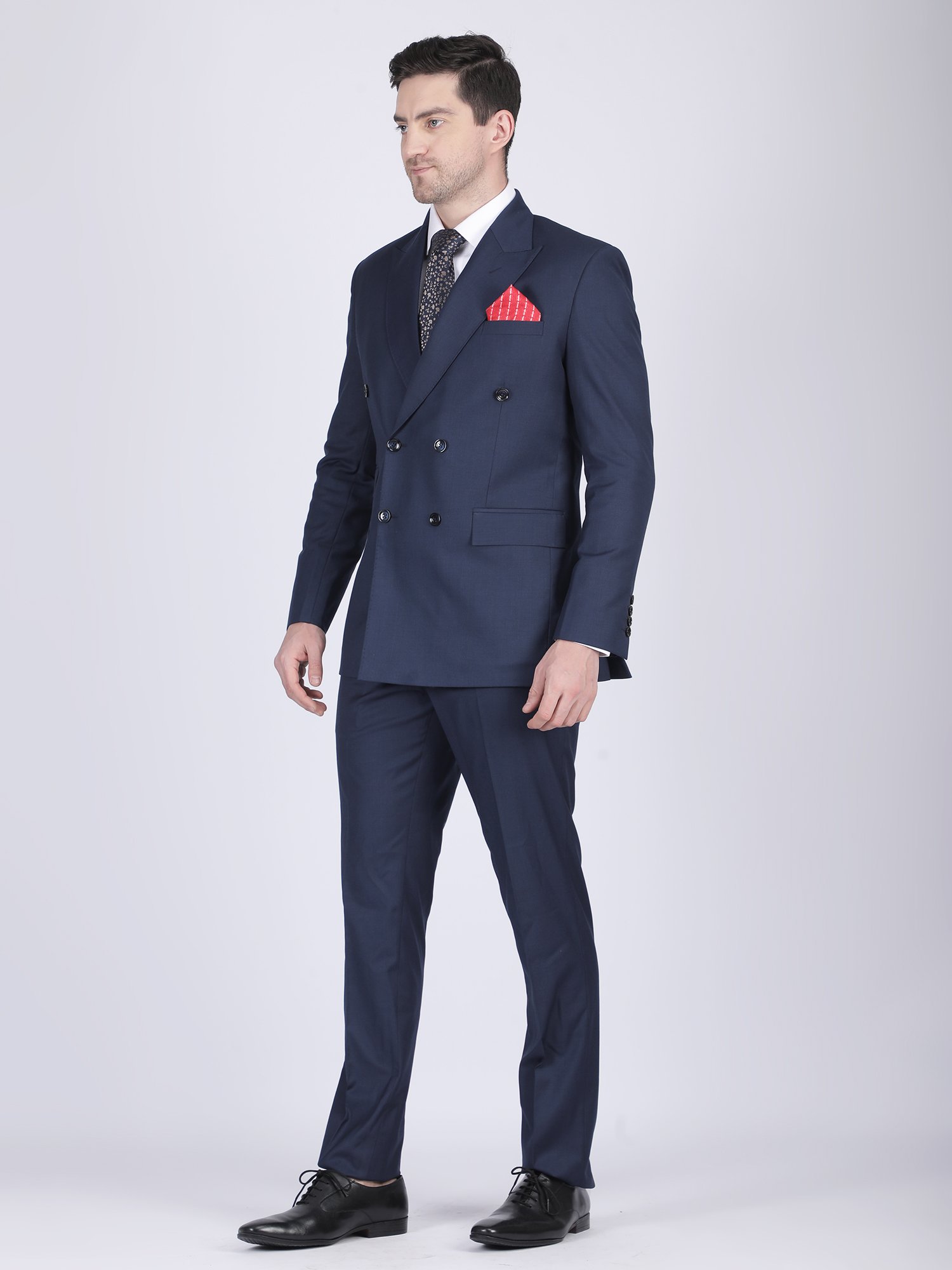We craft this suit using premium suiting fabric that offers a smooth texture, structured fall, and long-lasting comfort. The double-breasted design requires precision in panel alignment and button placement, ensuring a symmetrical and clean look. The peak lapel enhances the upper body frame, adding to the formal character of the suit. The stitching remains sharp and controlled, maintaining the blazer’s structure throughout wear. Instead of heavy detailing, the design highlights craftsmanship through construction, fit, and finishing. Moreover, the trousers complement the blazer perfectly, creating a balanced and cohesive outfit.