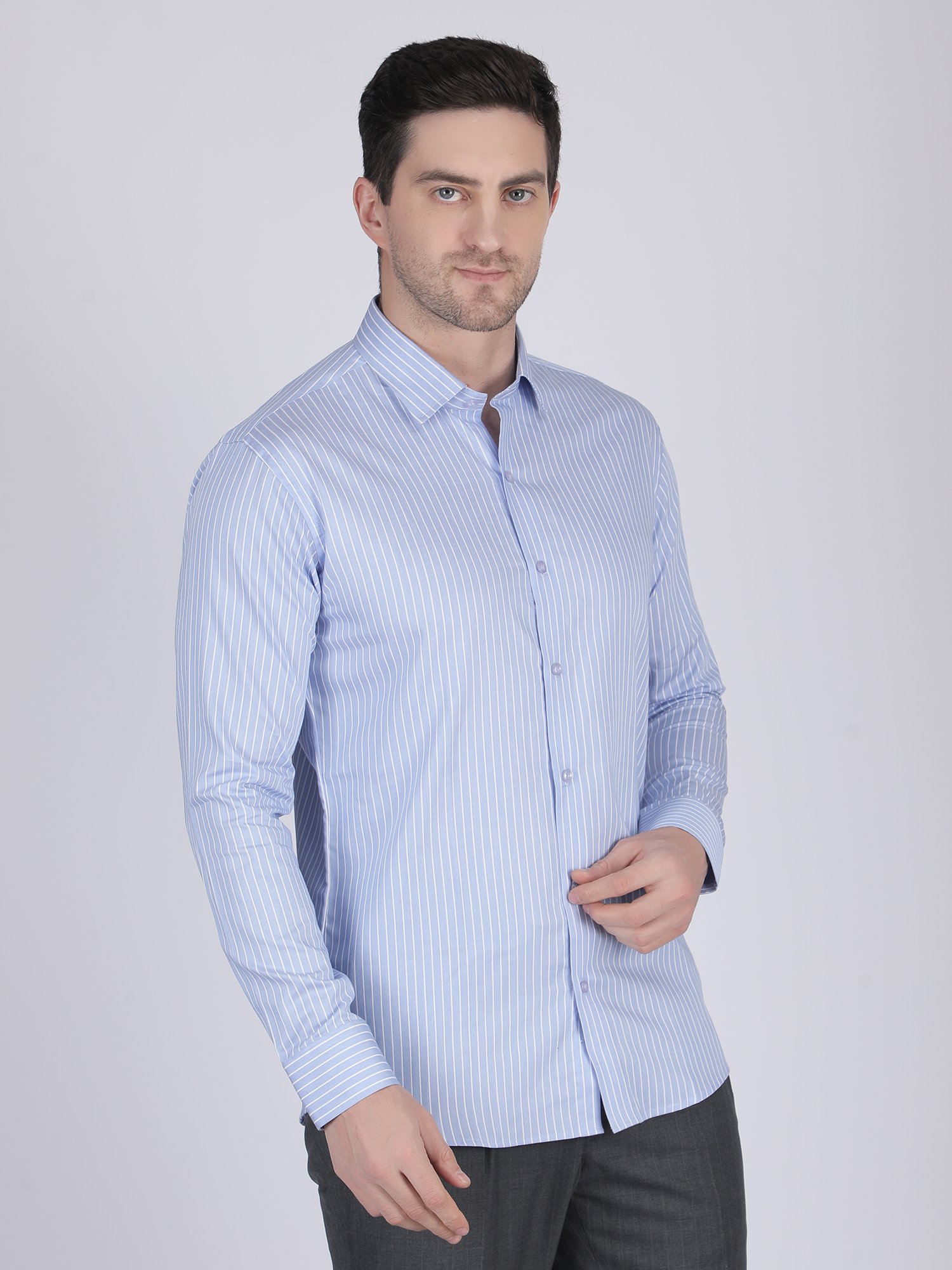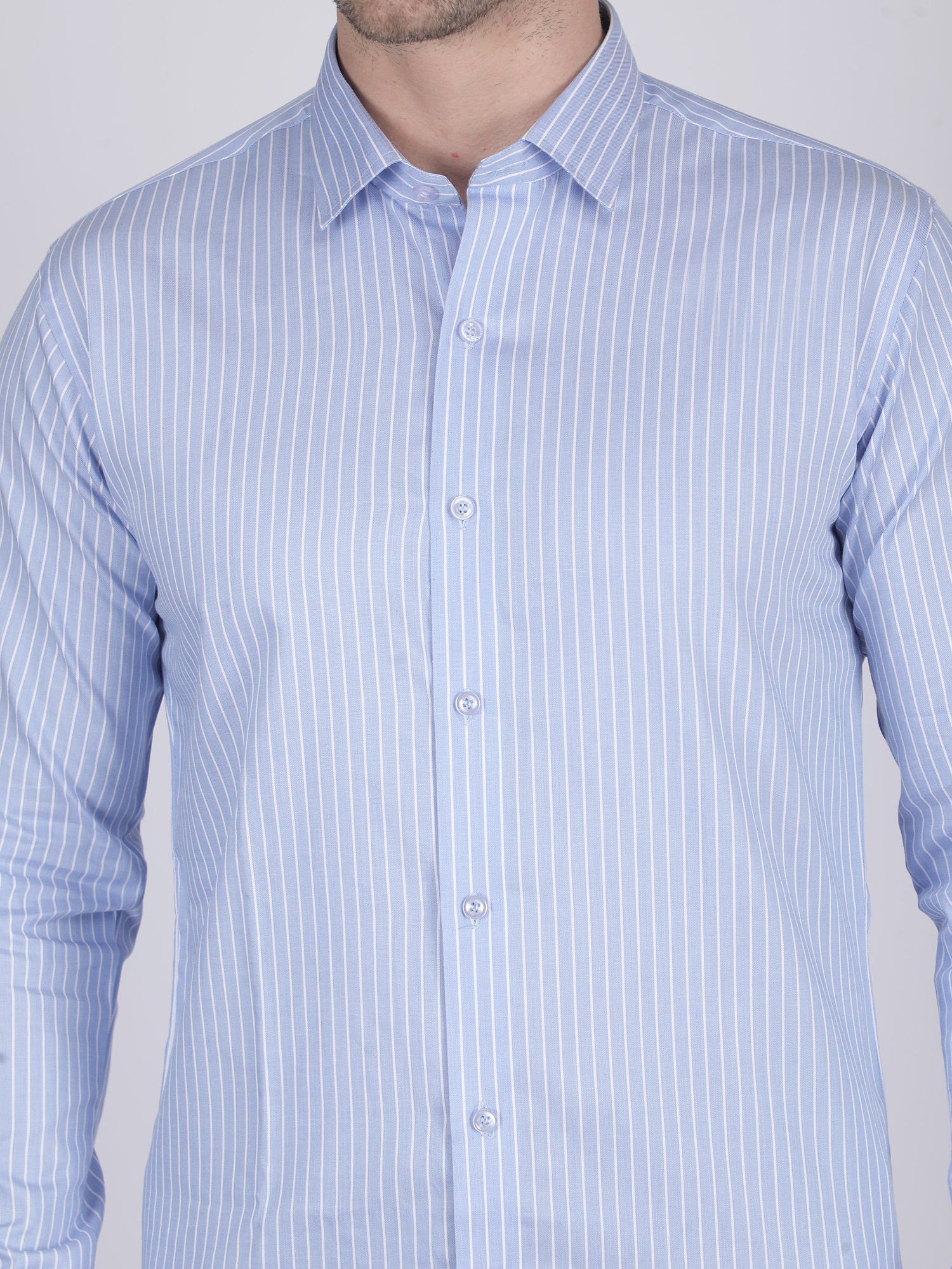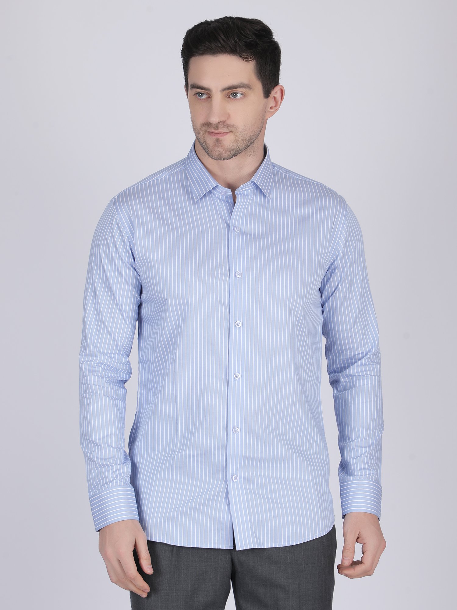 This shirt works perfectly for office wear, business meetings, reception events, and evening occasions. The blue stripe design adds a subtle statement while keeping the look formal. The tailored fit adds confidence and structure. Therefore, you can wear it across professional and social settings with ease.