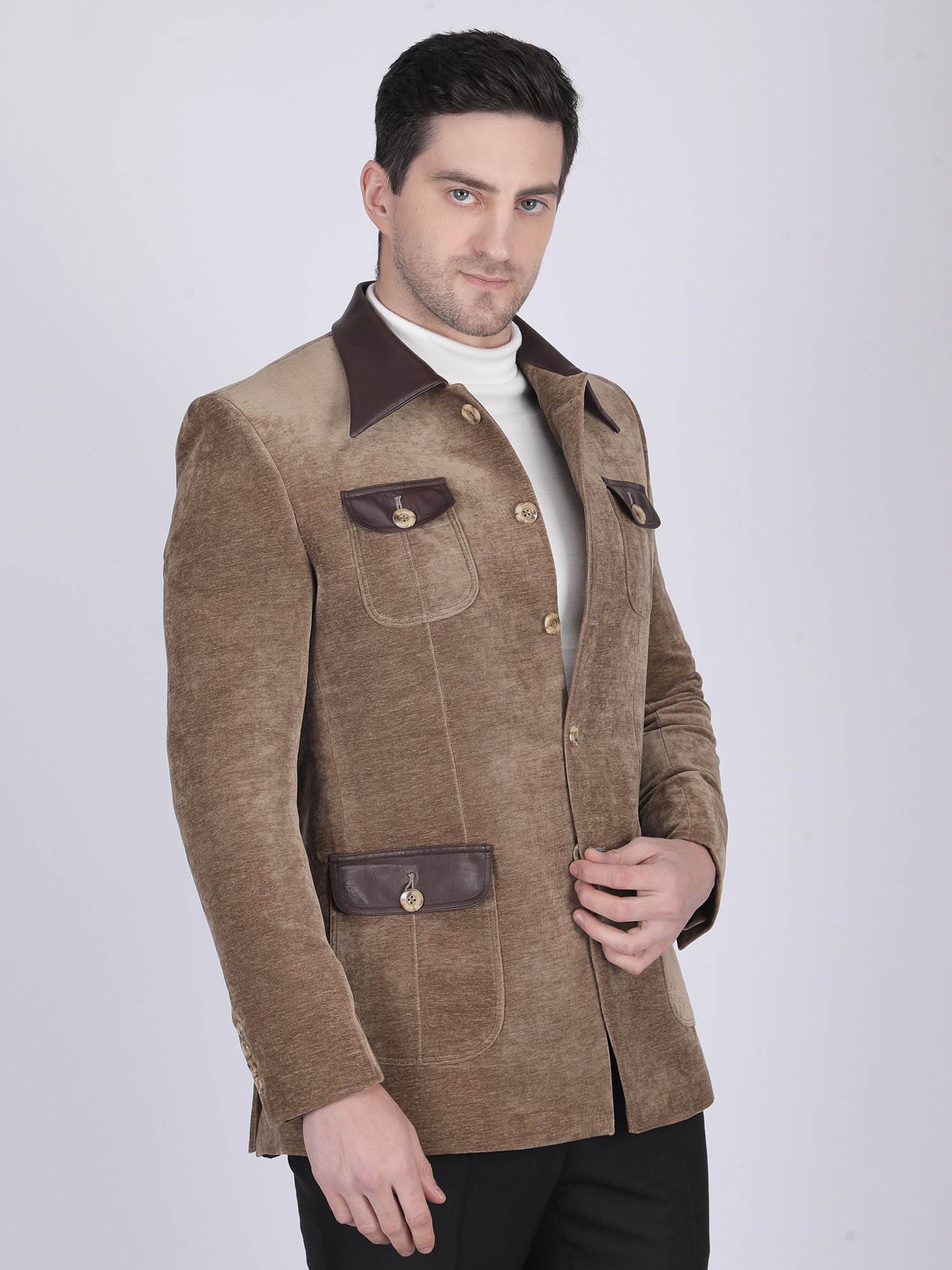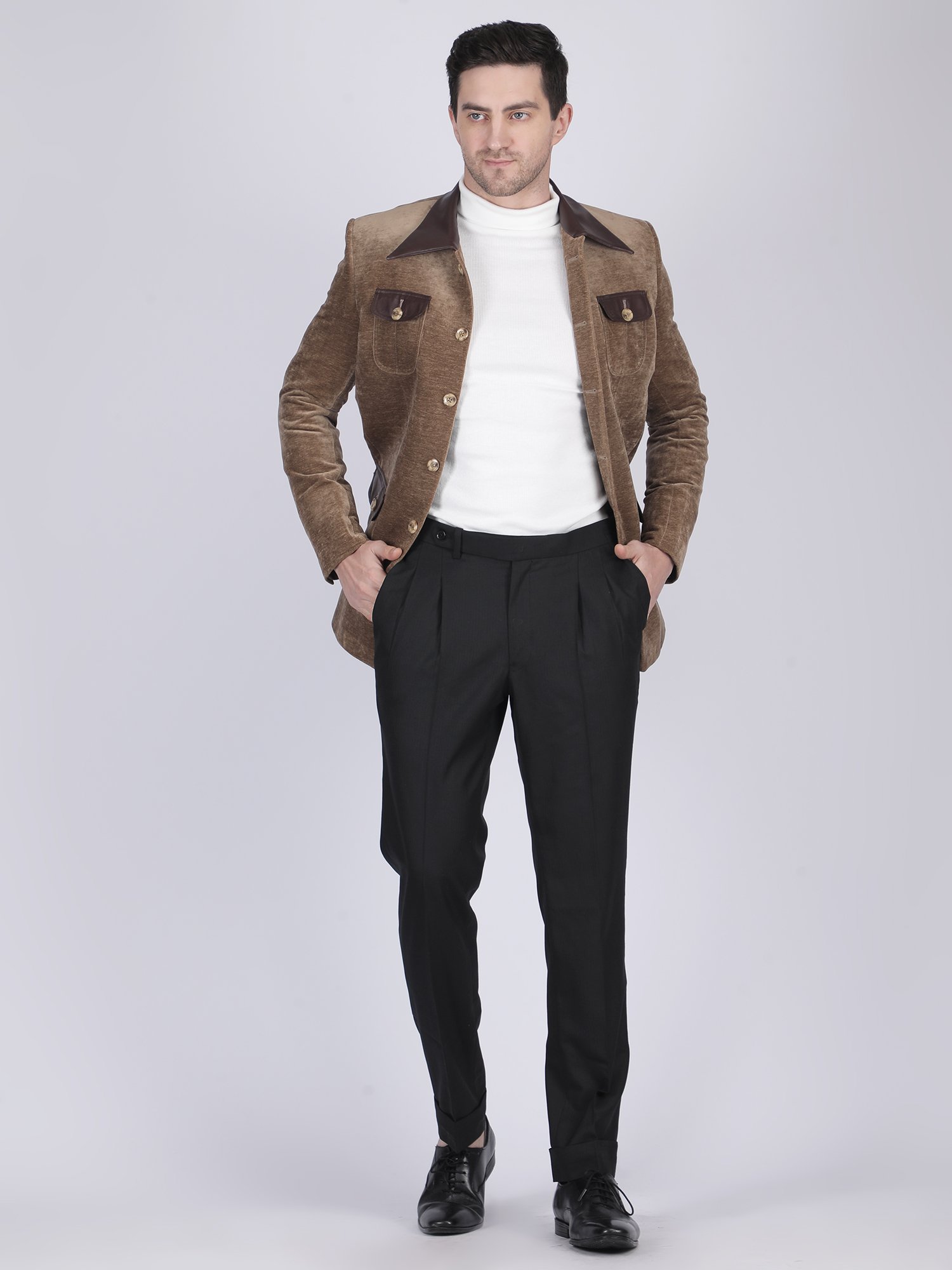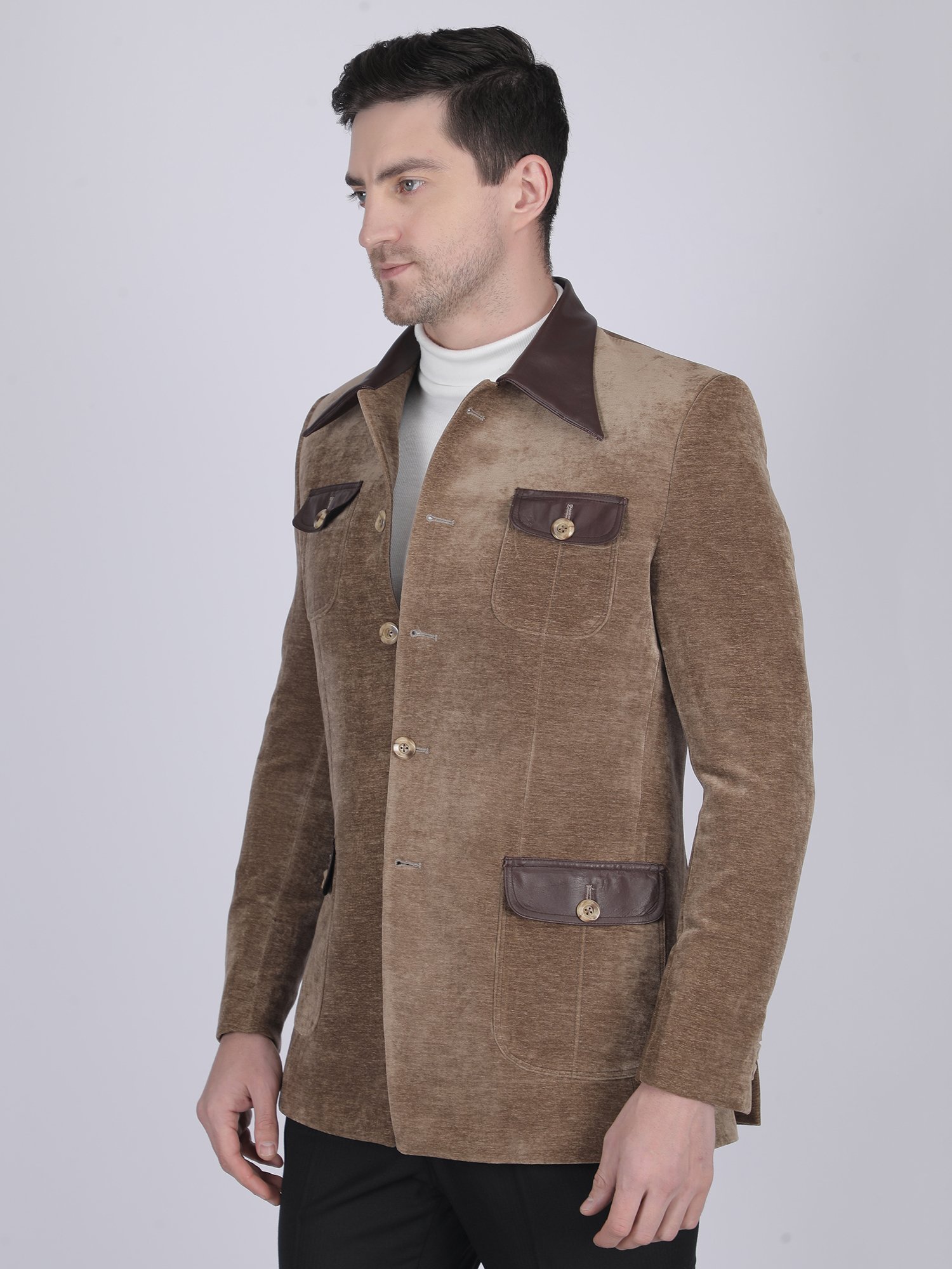 This Brown Suede Leather Trim Blazer suits receptions, evening gatherings, cocktail events, and premium casual occasions. The textured fabric and leather accents create a standout look. Therefore, it allows you to present a confident and stylish appearance effortlessly.