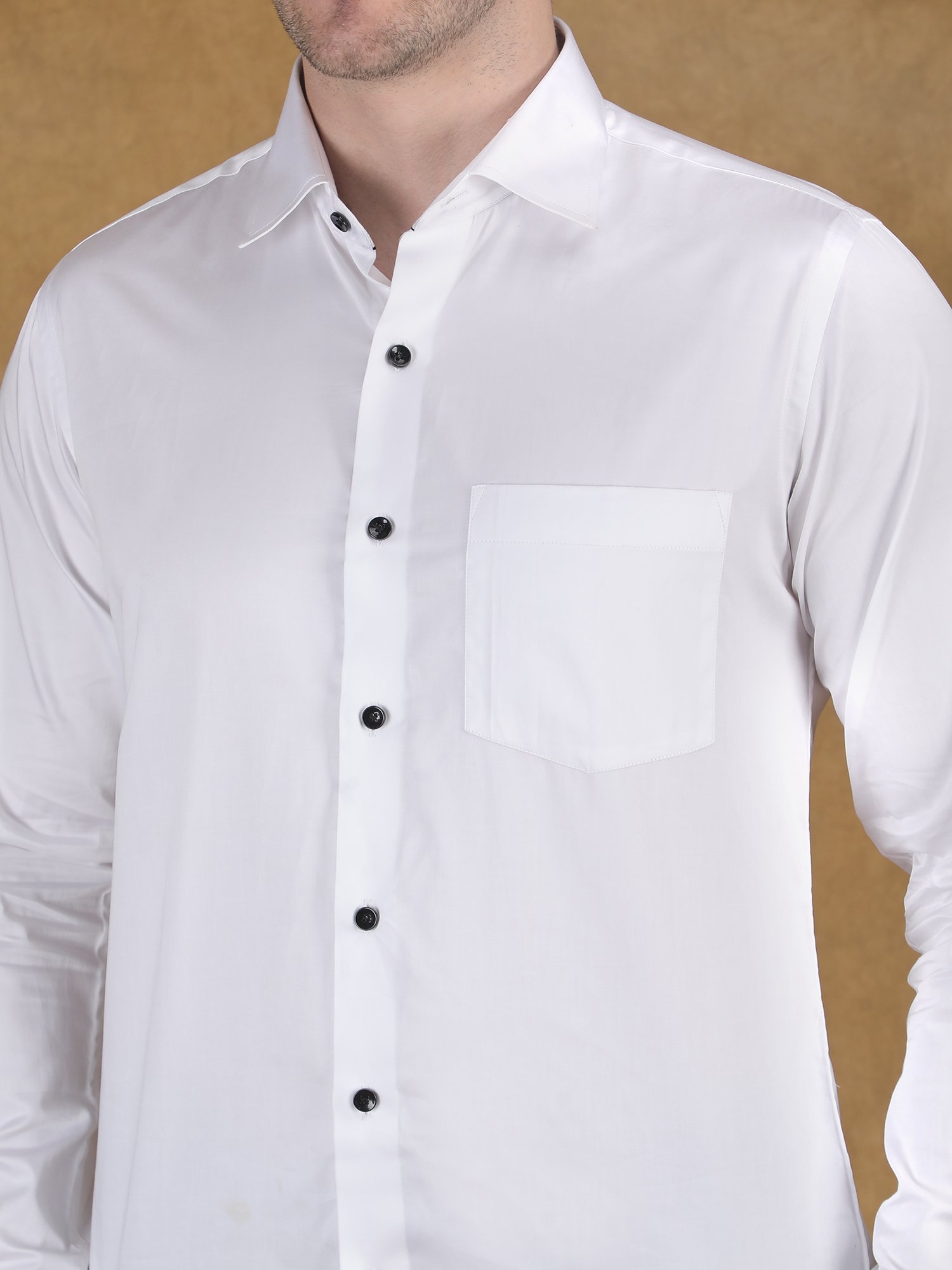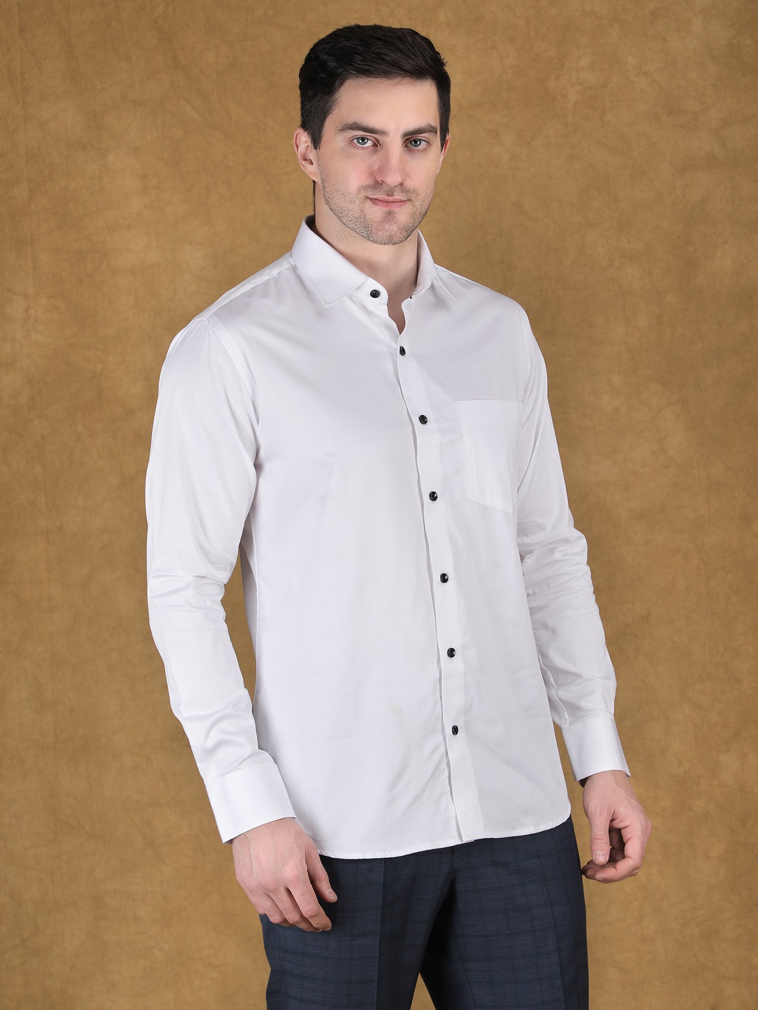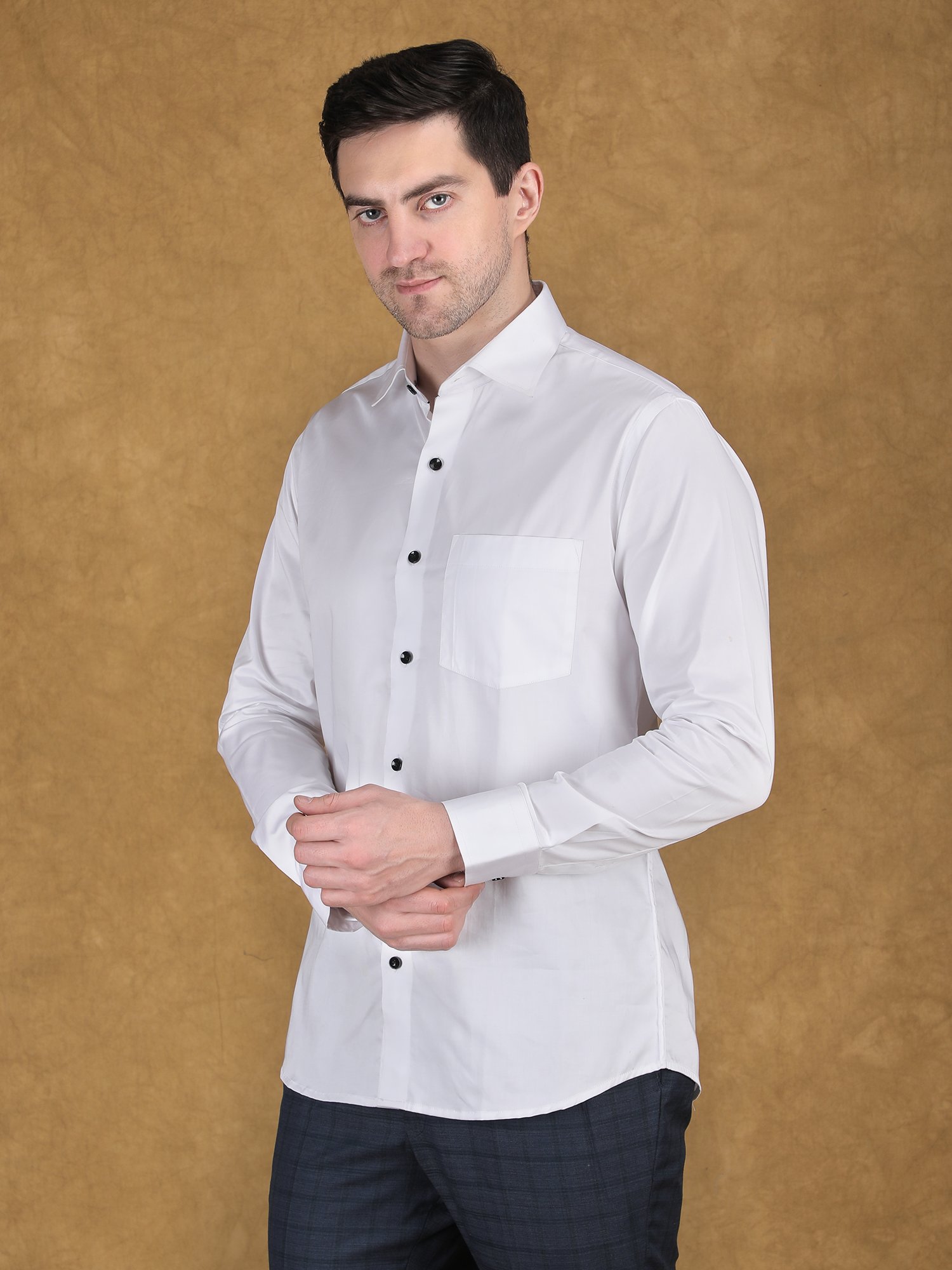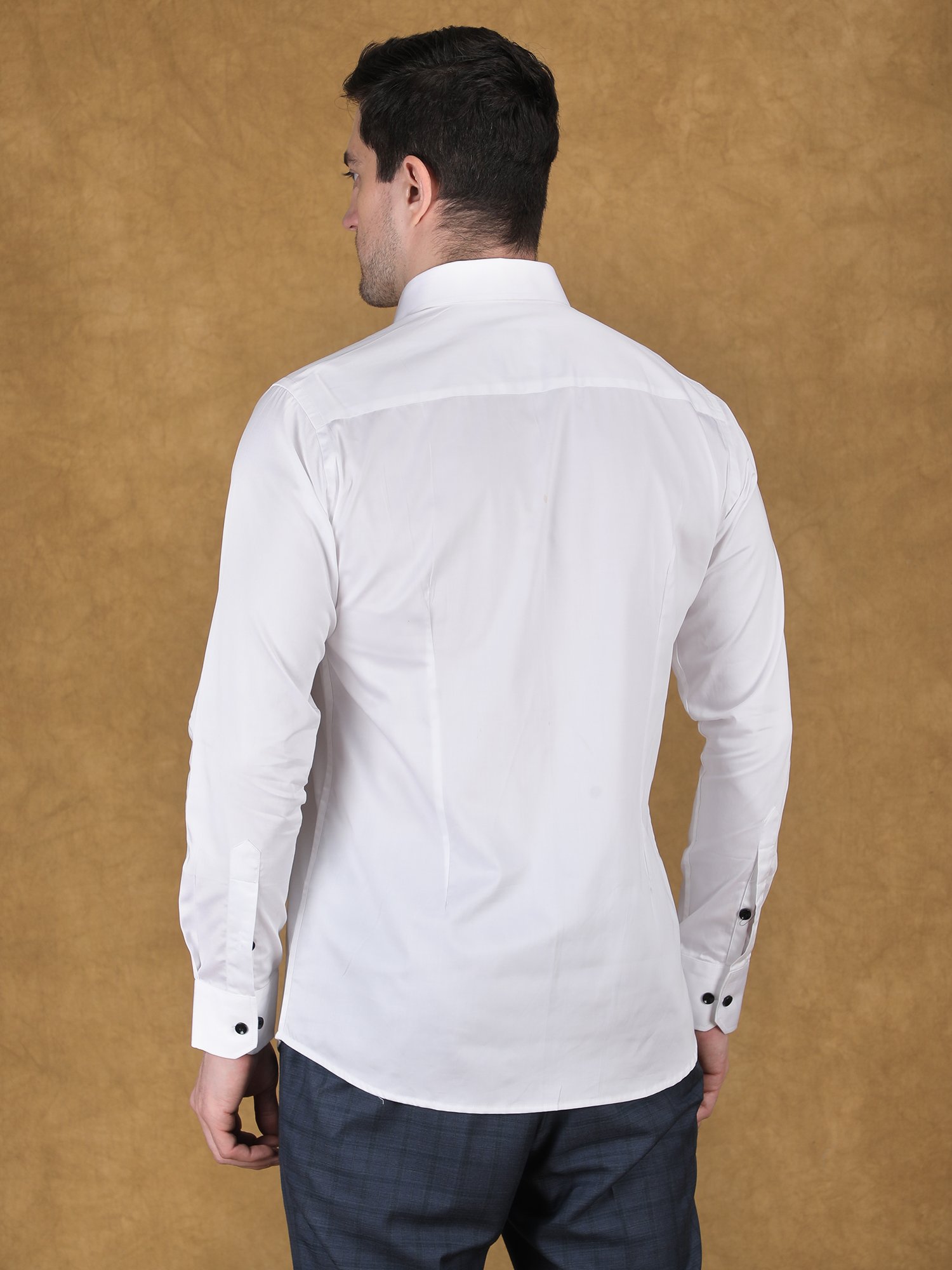 This White Cotton Shirt with Tailored Fit is designed for office wear, reception events, and evening occasions where clean styling creates a strong impression. It features a structured silhouette with a classic spread collar and a sharp front placket enhanced with contrast buttons, adding a subtle modern detail to the overall look.