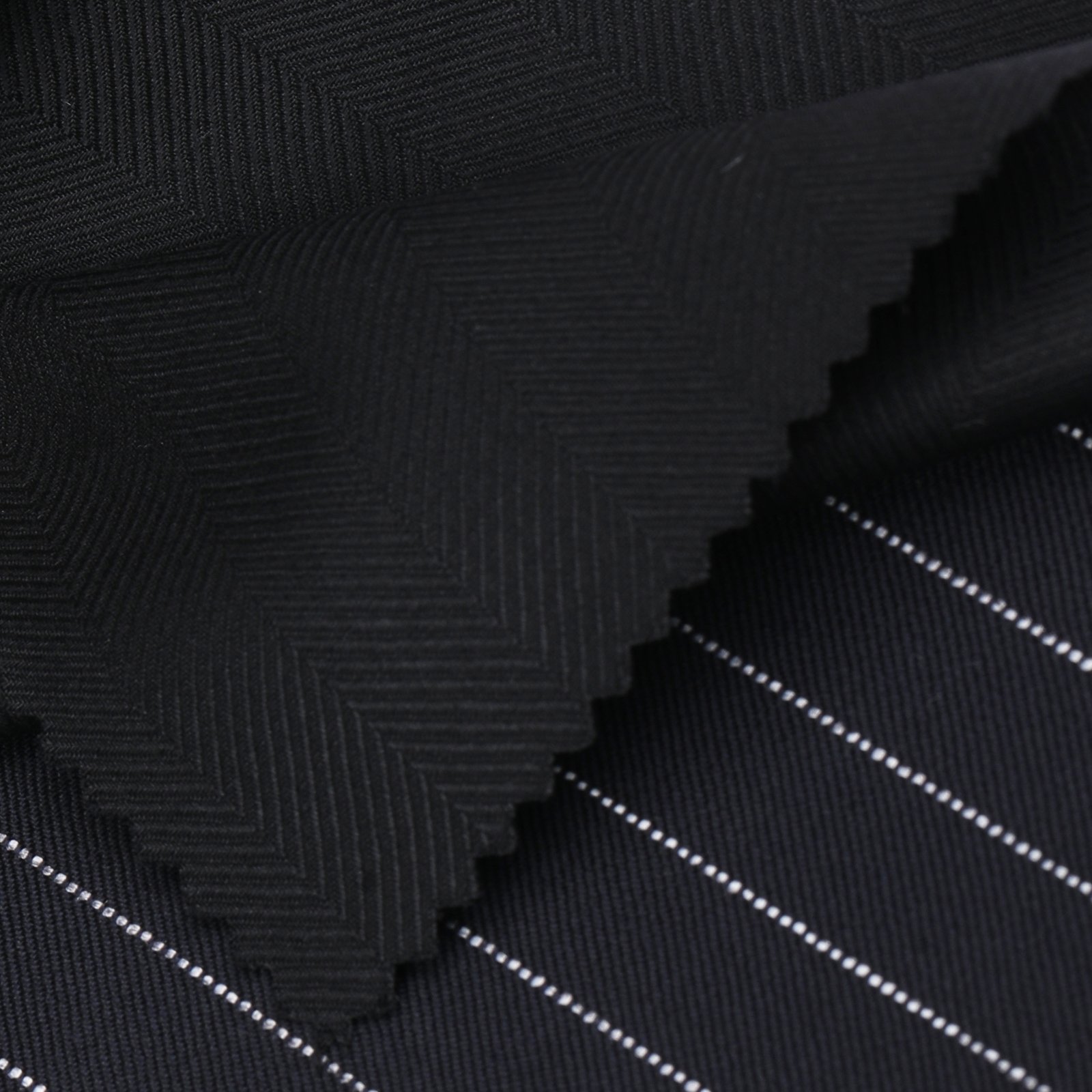 A striking expression of authority and modern luxury, this deep charcoal-black fabric is defined by its bold contrast pinstripes that create a powerful and elongated visual impact. Crafted for elite tailoring, its rich tone and superior drape deliver a commanding silhouette, making it an exceptional choice for executive suits and high-end formal occasions.