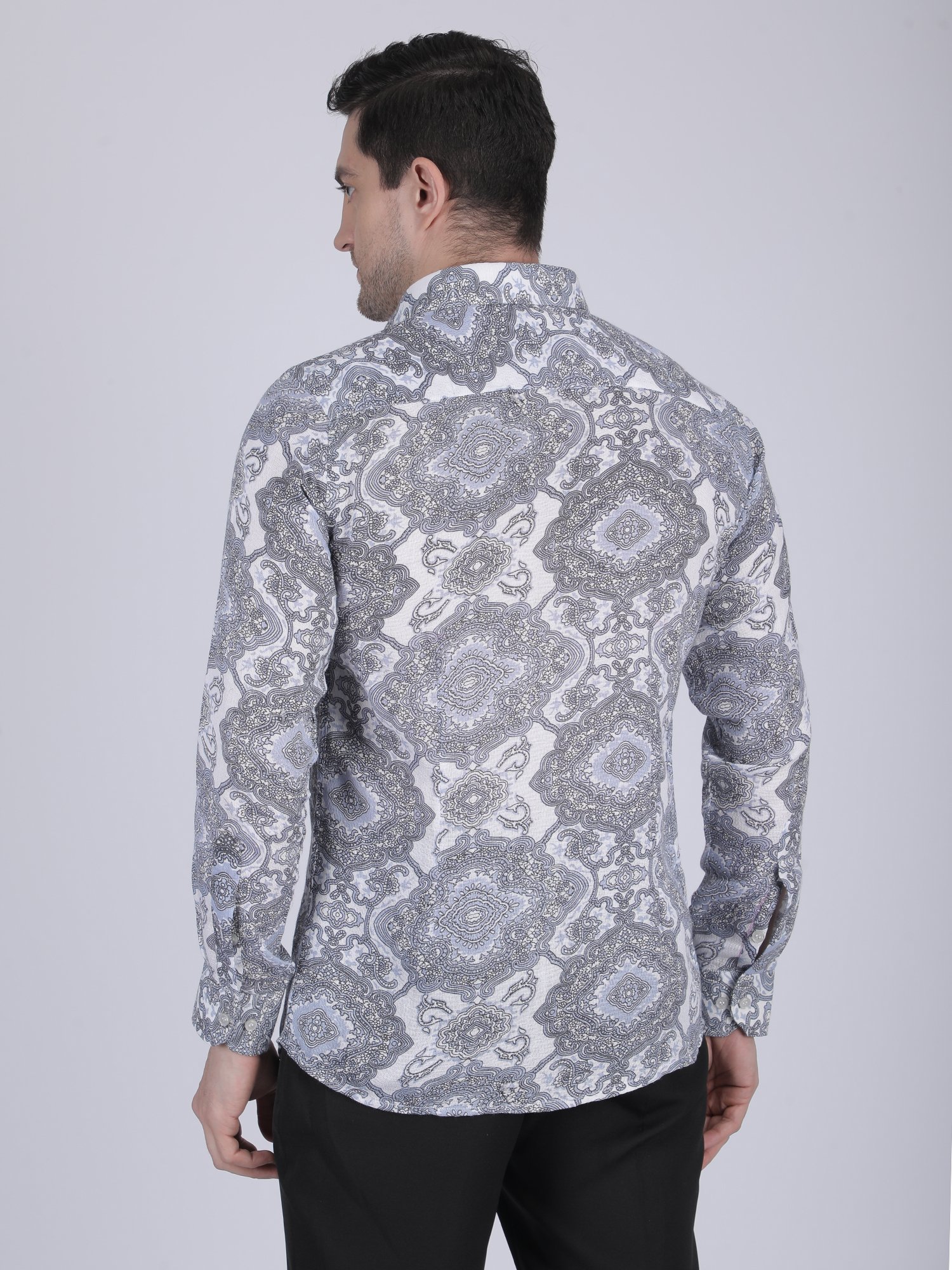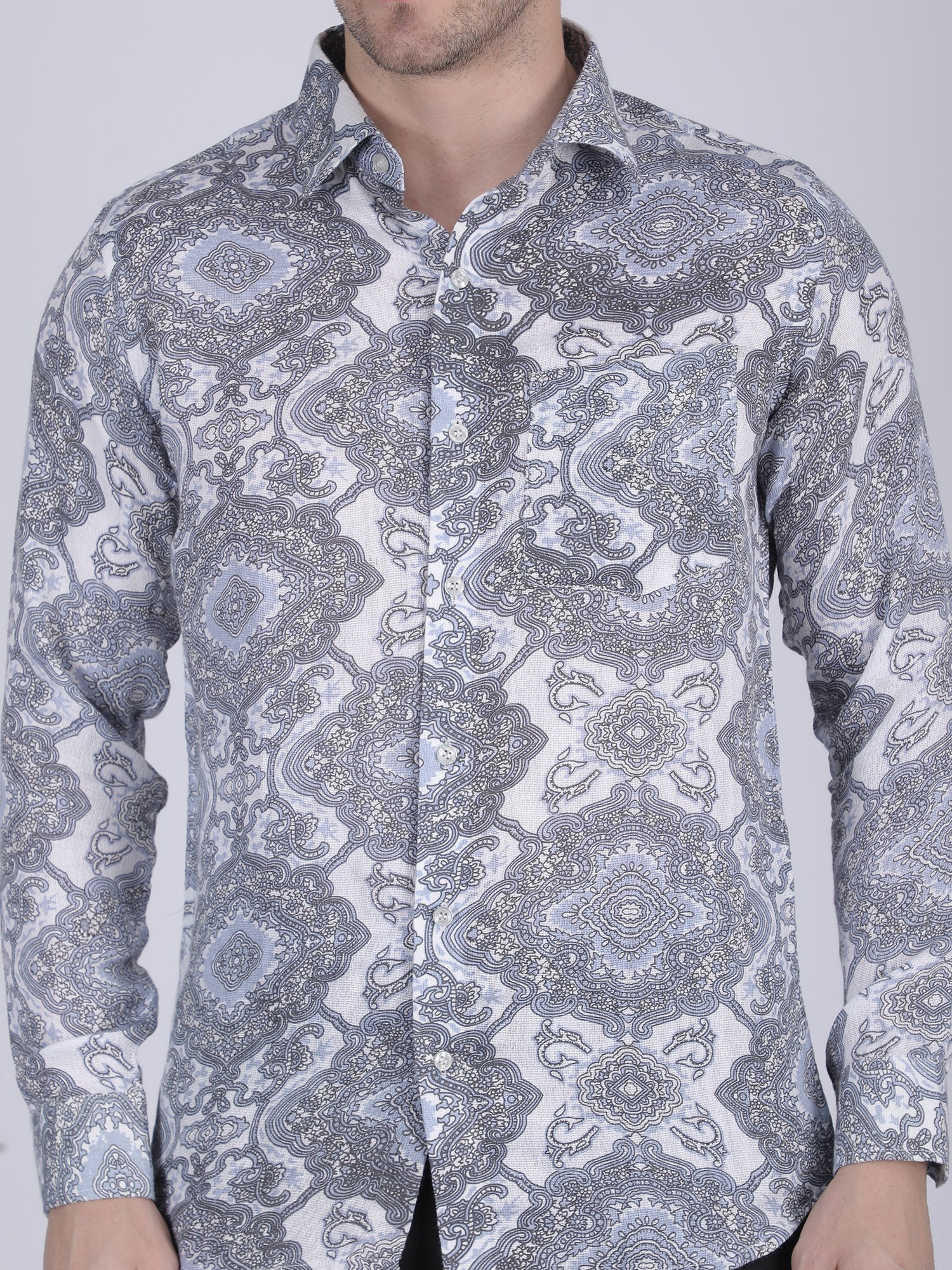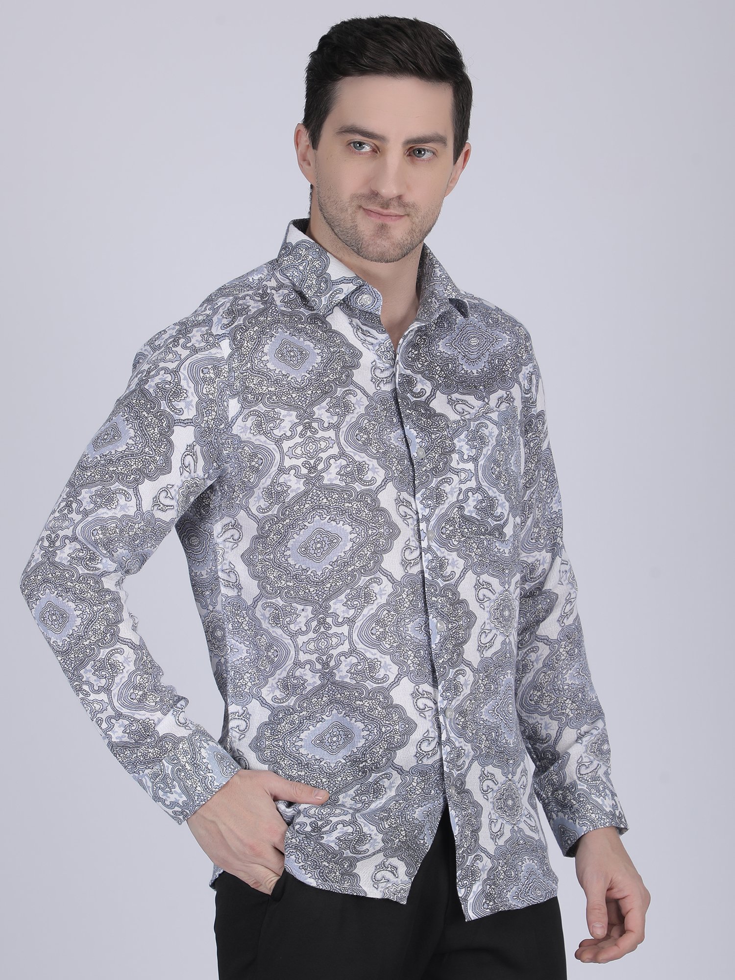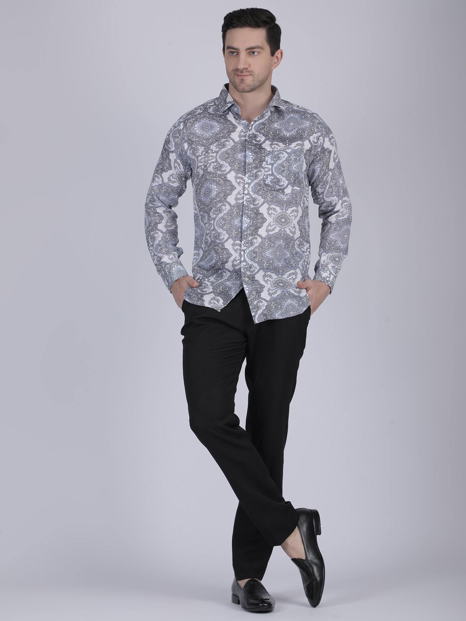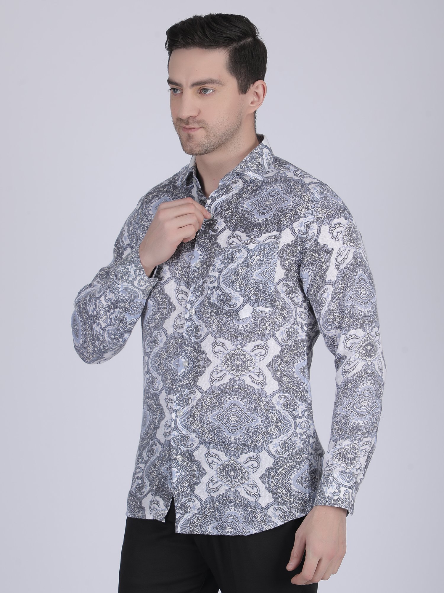 This Designer Printed Shirt in grey is crafted for evening occasions, smart casual styling, and refined modern wear. It offers a balanced and sophisticated look, while the intricate ornamental pattern adds depth and visual elegance. The shirt features a structured silhouette along with a sharp collar and clean front placket, so it delivers a confident and polished appearance.