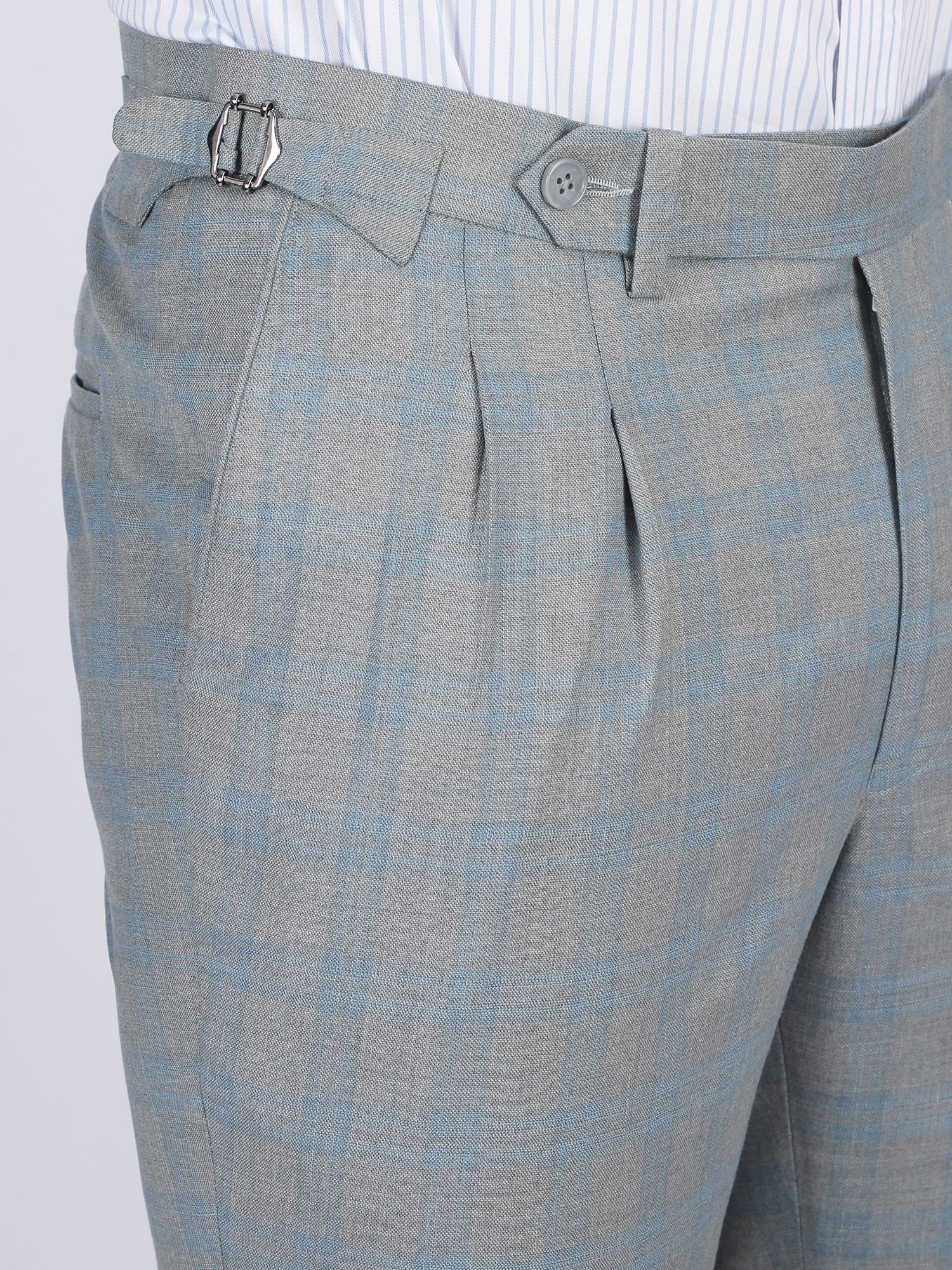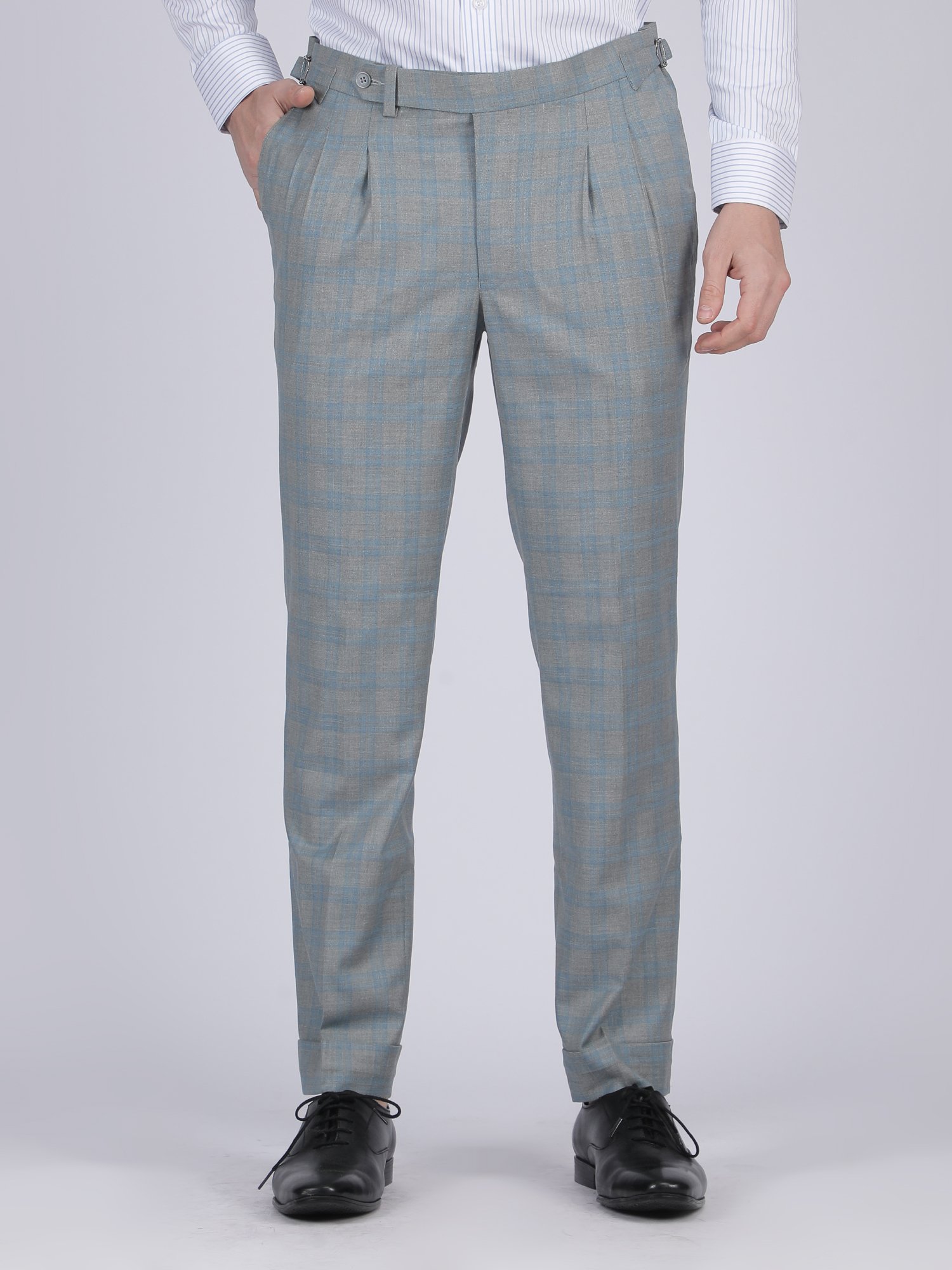 These Formal Trousers are designed for summer office wear and refined formal occasions where lightweight tailoring meets modern elegance. The light blue check pattern creates a fresh and sophisticated appearance, while the double pleated front adds a classic and structured character. Therefore, these Formal Trousers deliver a perfect balance of comfort and premium styling.