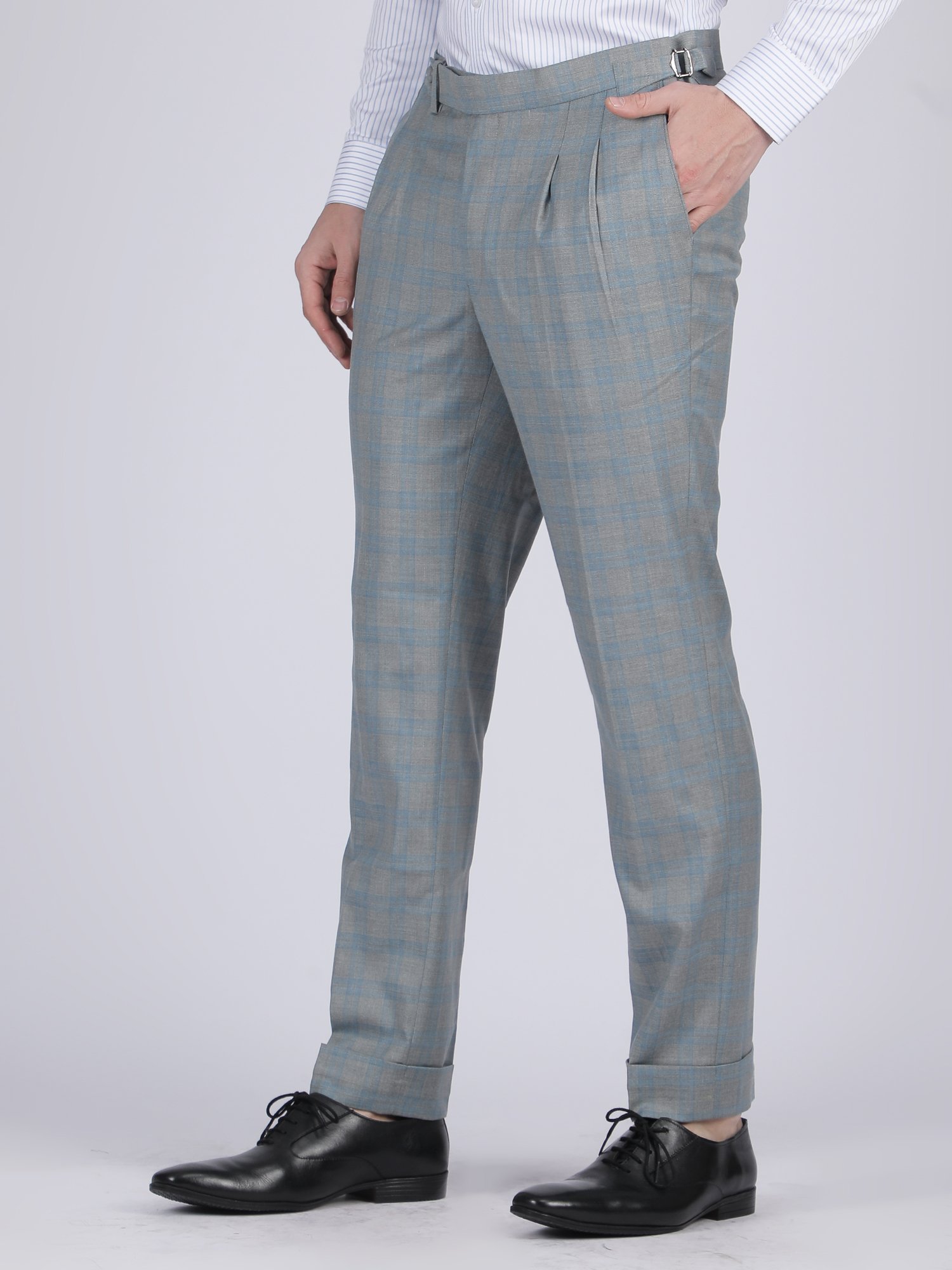 Formal Trousers Light Blue Check Double Pleated Tailored Fit