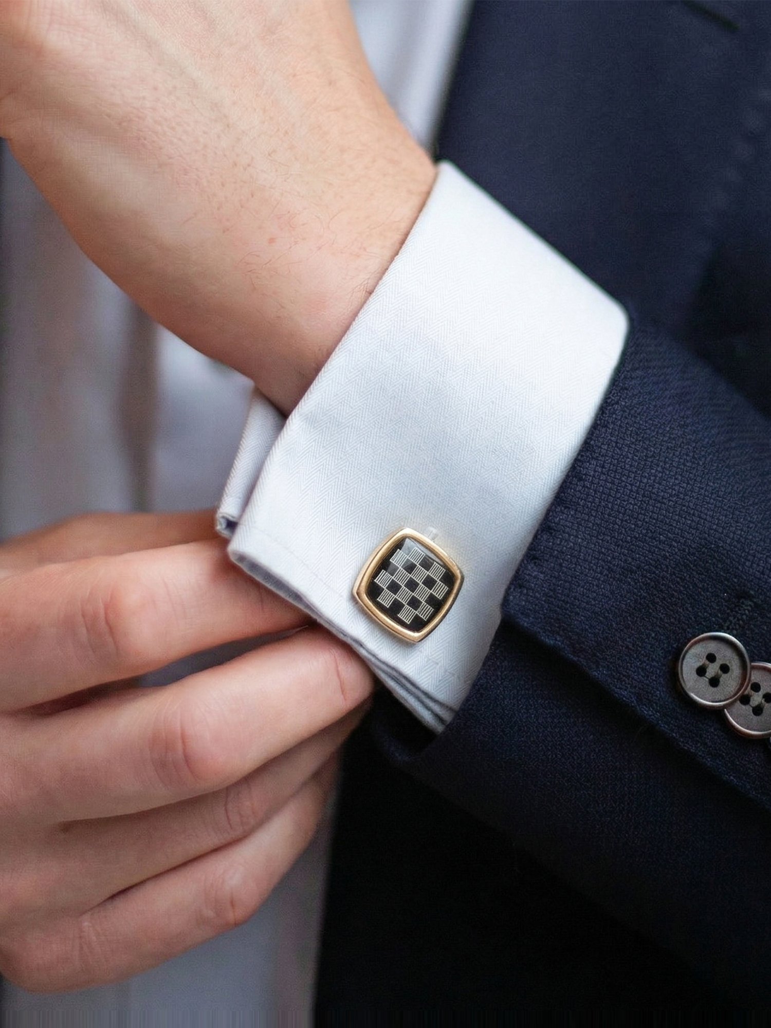 A refined touch of sophistication, these gold-tone cufflinks are designed to elevate your formal and ethnic ensembles. Featuring a sleek rectangular frame with a striking black and silver geometric stone pattern, they bring a modern edge to classic styling. Perfectly polished and crafted for durability, these cufflinks add a subtle yet powerful statement to your look.