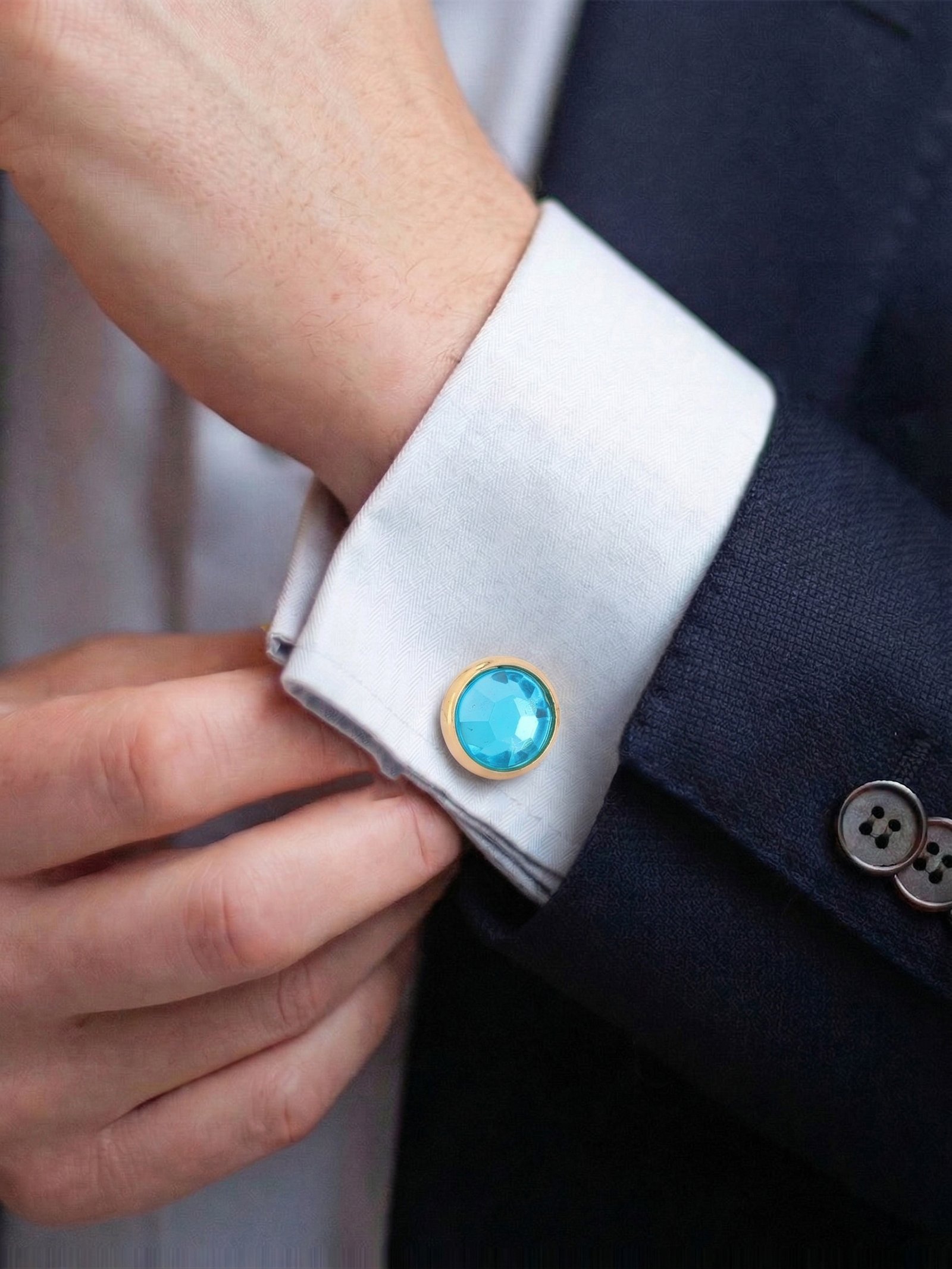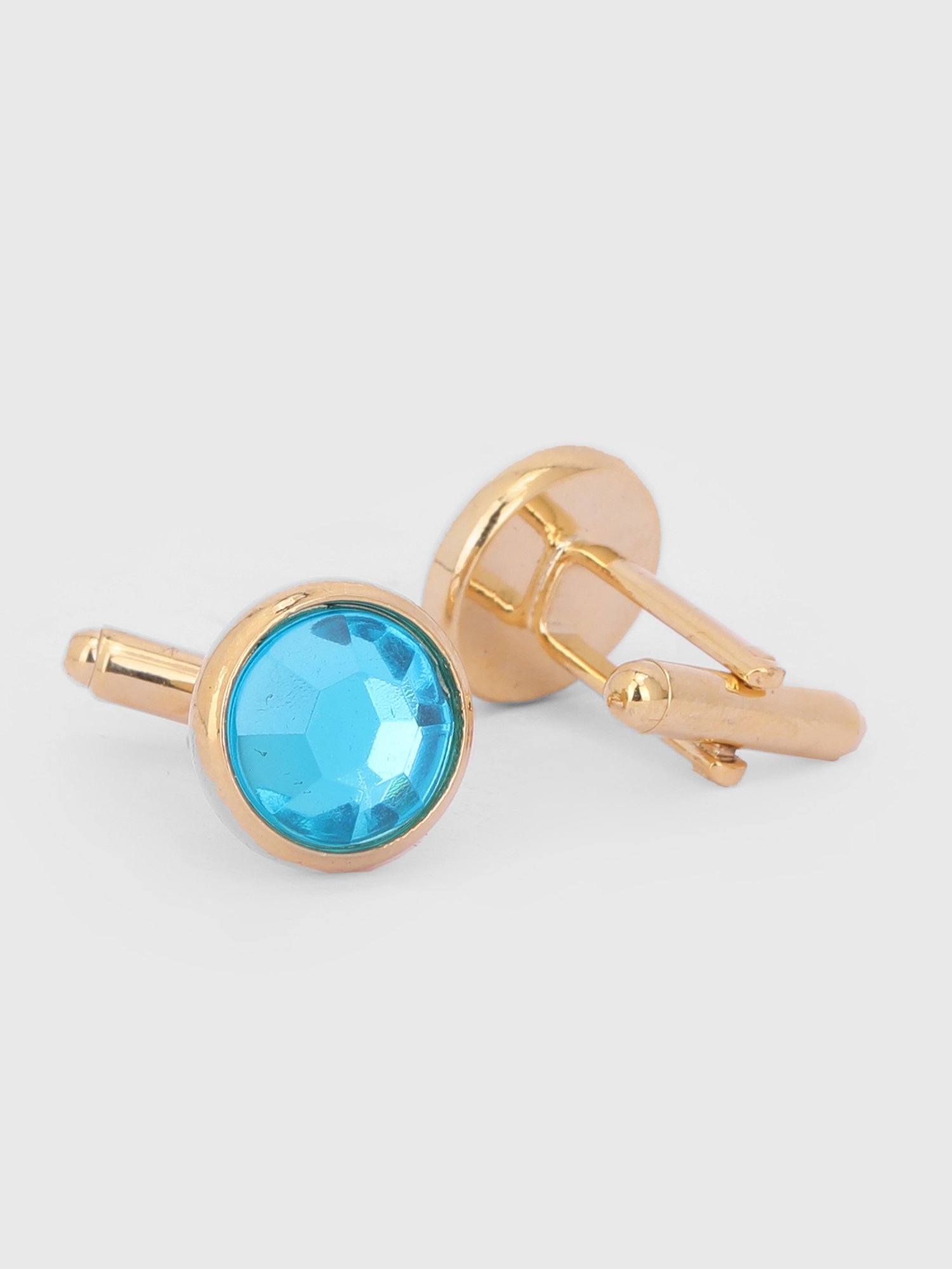 A pop of color with refined elegance, these gold-tone cufflinks are designed to add a vibrant touch to your ensemble. Featuring a striking turquoise-blue stone set within a smooth gold frame, they bring freshness and sophistication to both formal and ethnic looks. Perfect for the modern gentleman who likes subtle color accents with a premium finish.