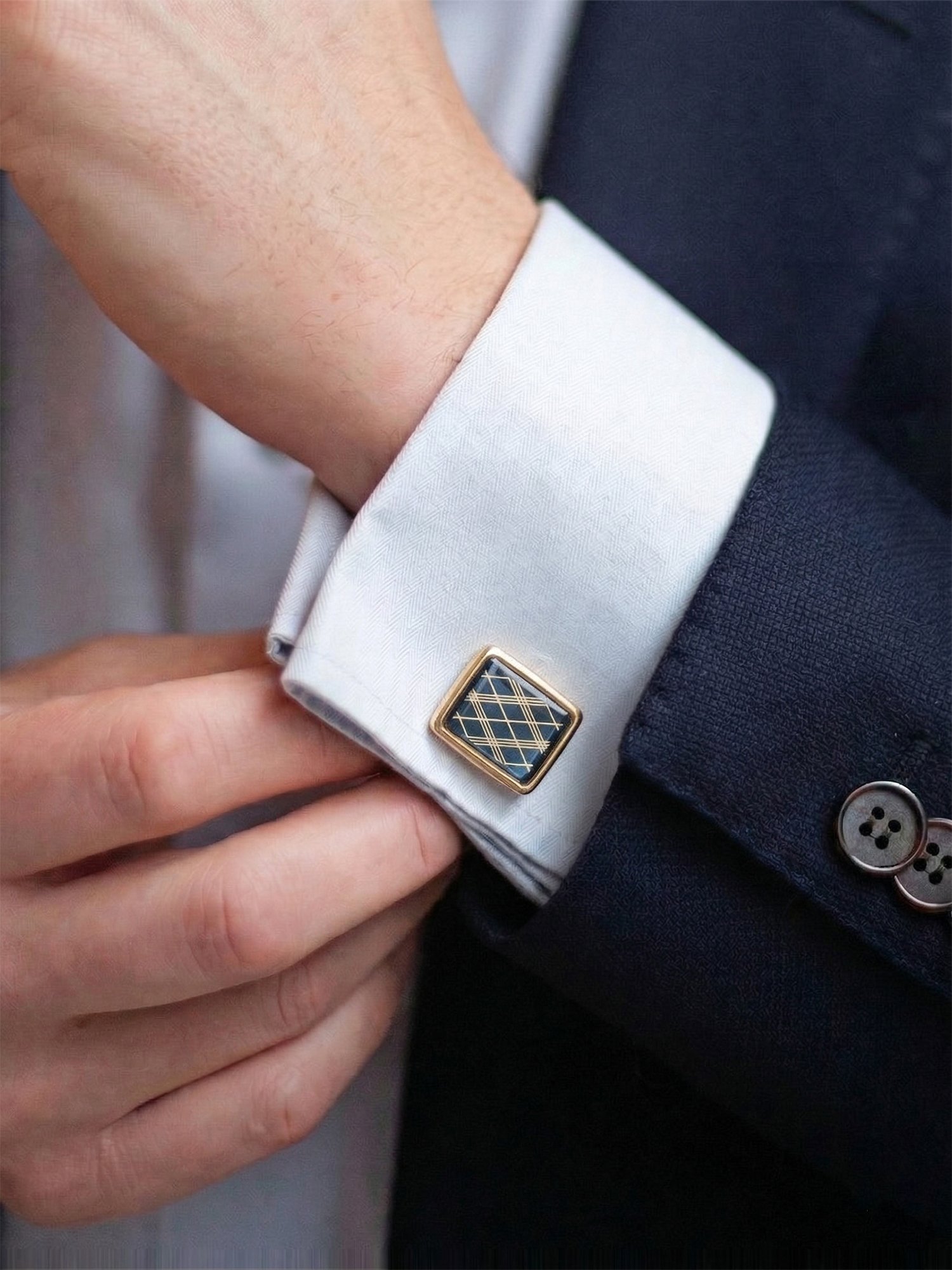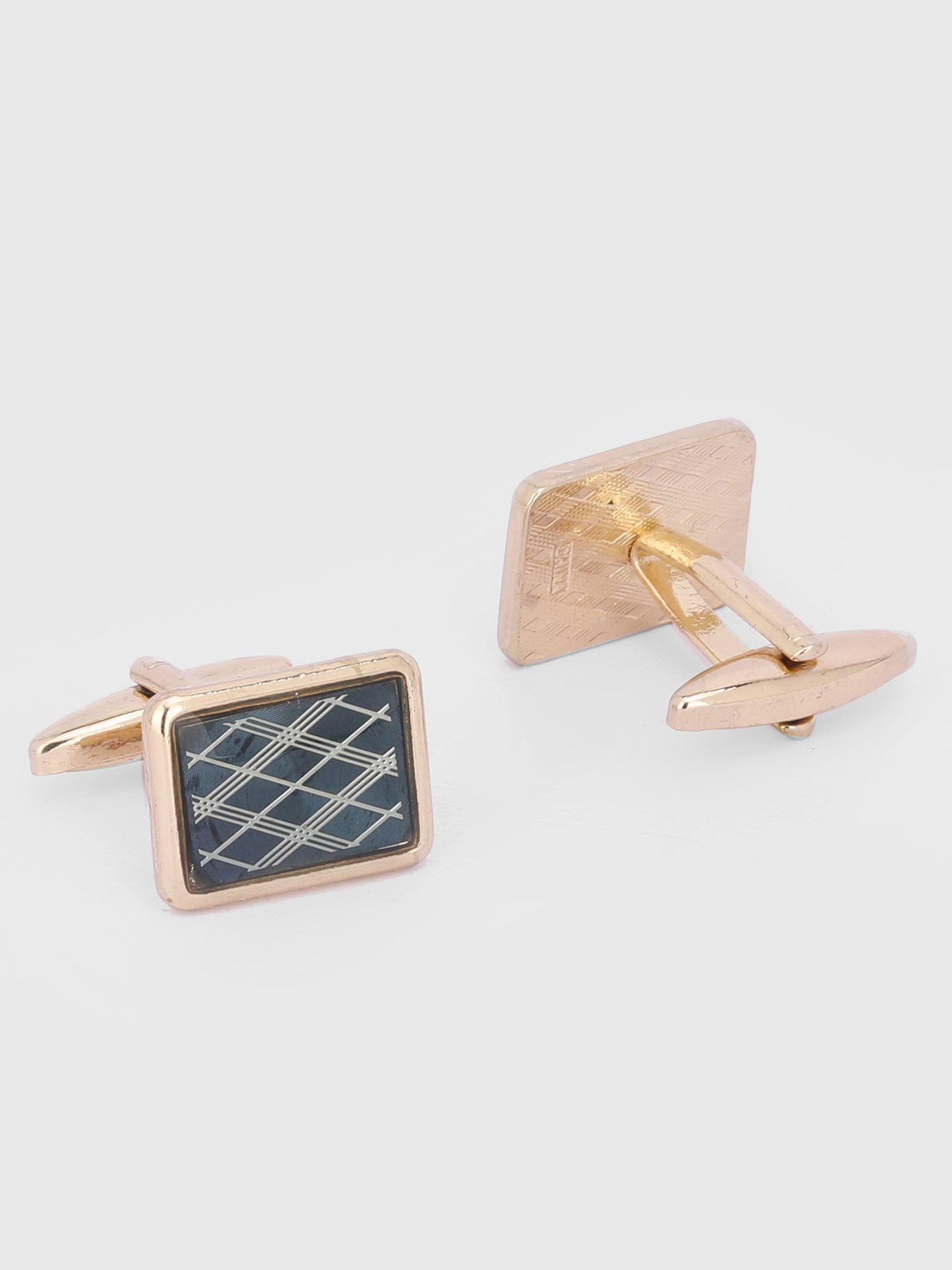 Sharp geometry meets refined elegance, these cufflinks feature a rich blue base highlighted with a sleek criss-cross lattice pattern, framed in a polished gold-tone finish. The design adds a modern, structured appeal while maintaining a luxurious feel—perfect for elevating both formal and festive looks.