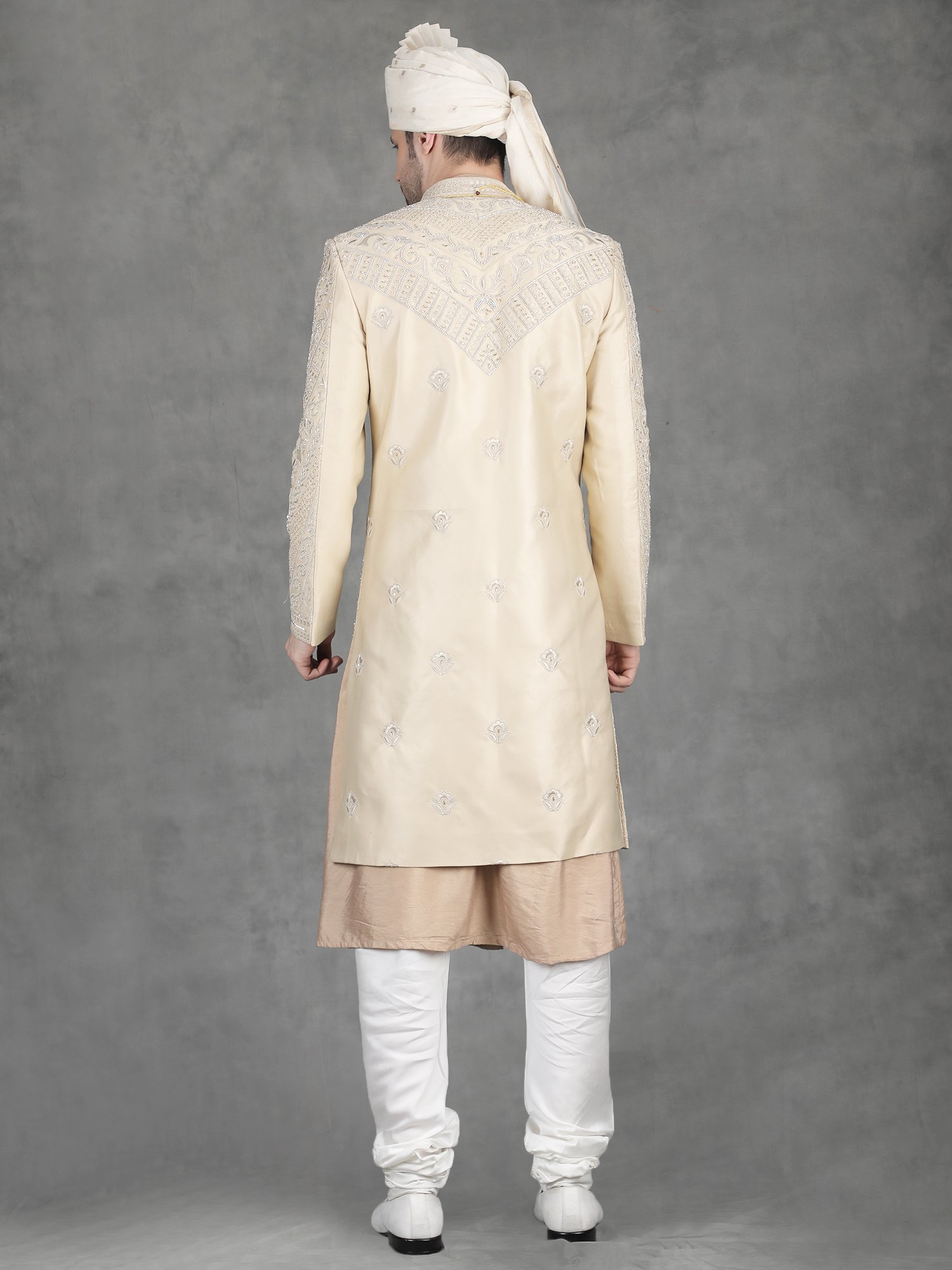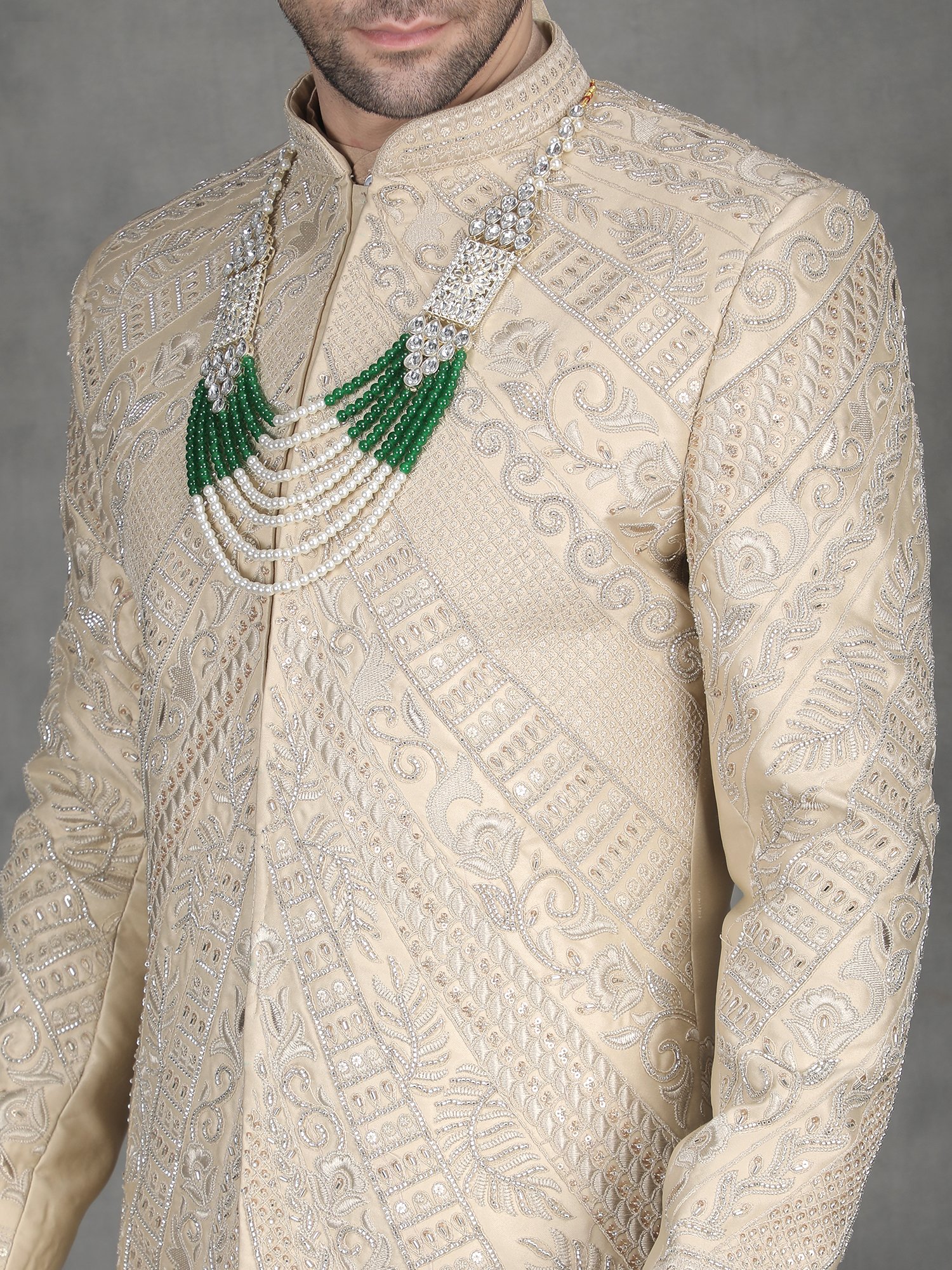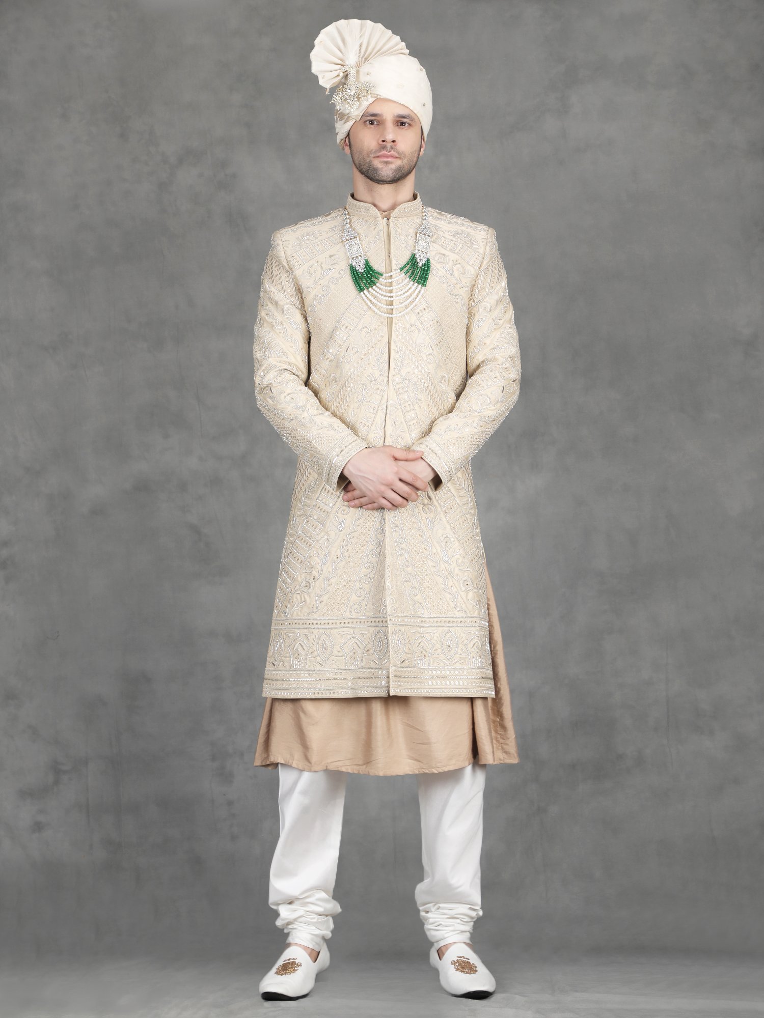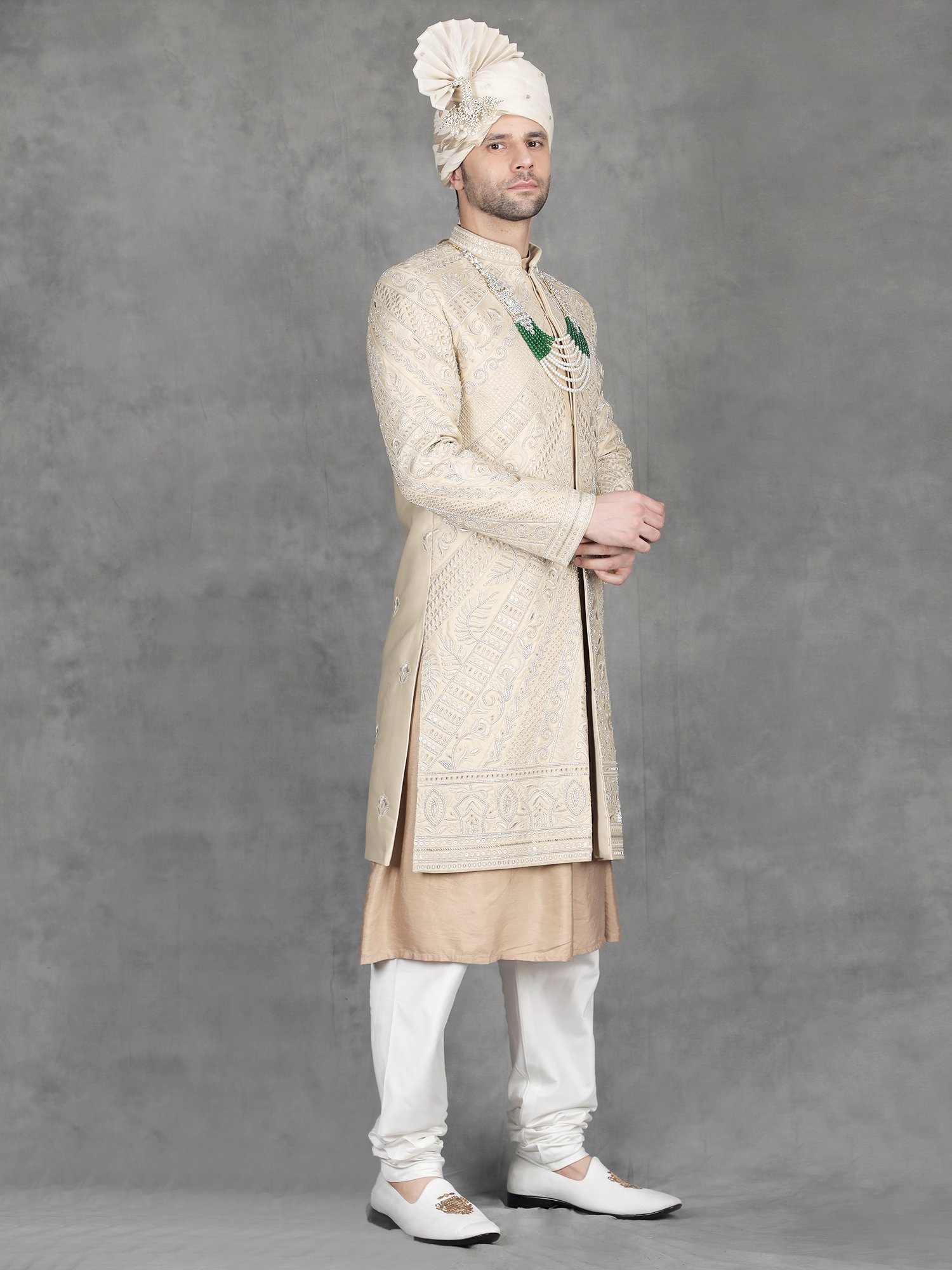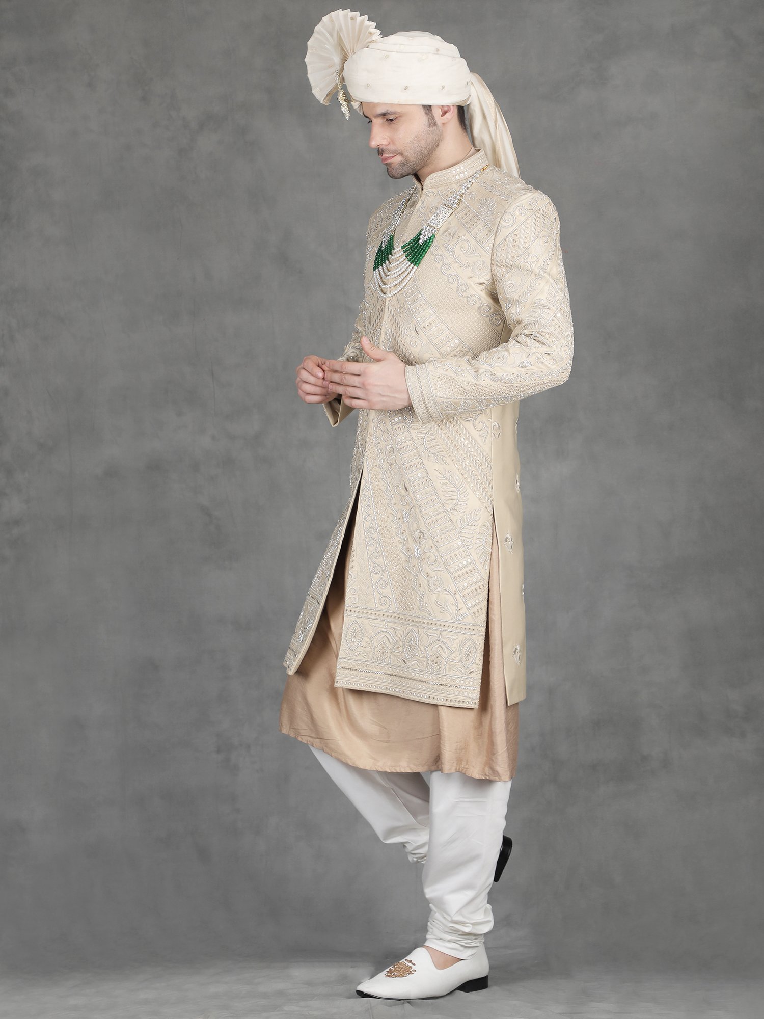 Pair this sherwani with ivory churidar or tailored trousers for a balanced traditional look. Add layered malas to enhance the richness of zari work. Complete the outfit with embroidered mojris.