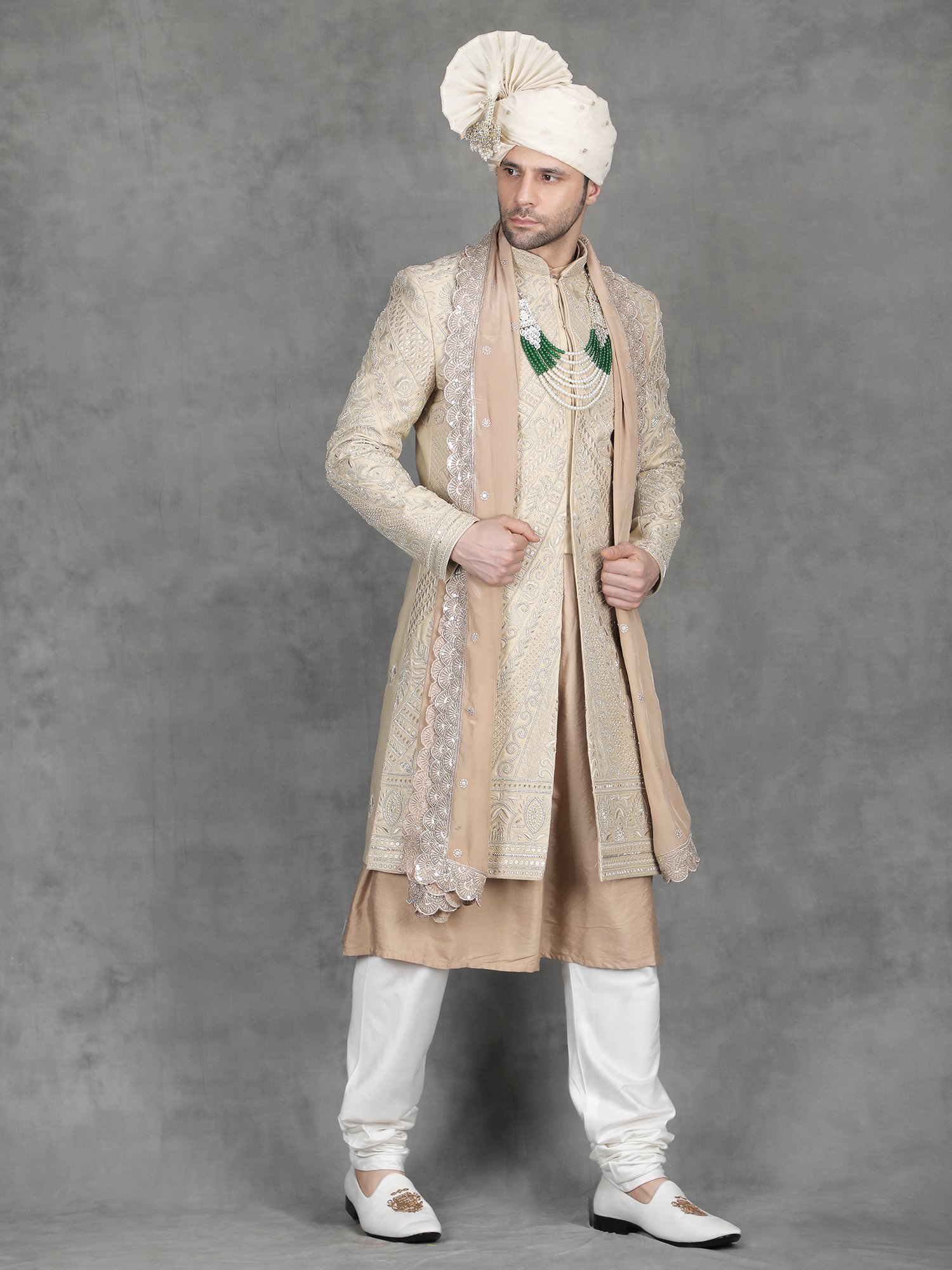 • Includes: Sherwani, Kurta, Churidar Pyjama, Stole