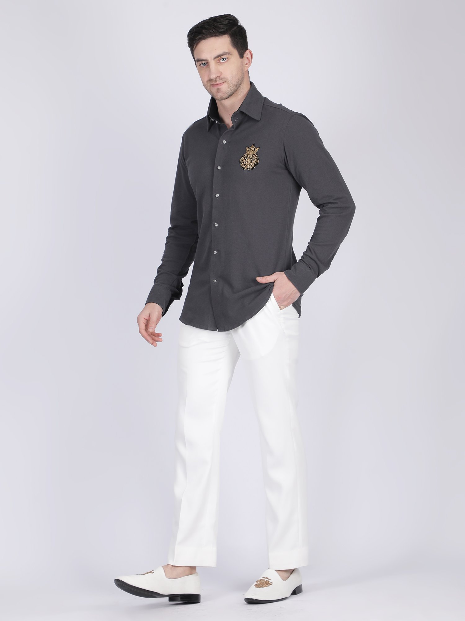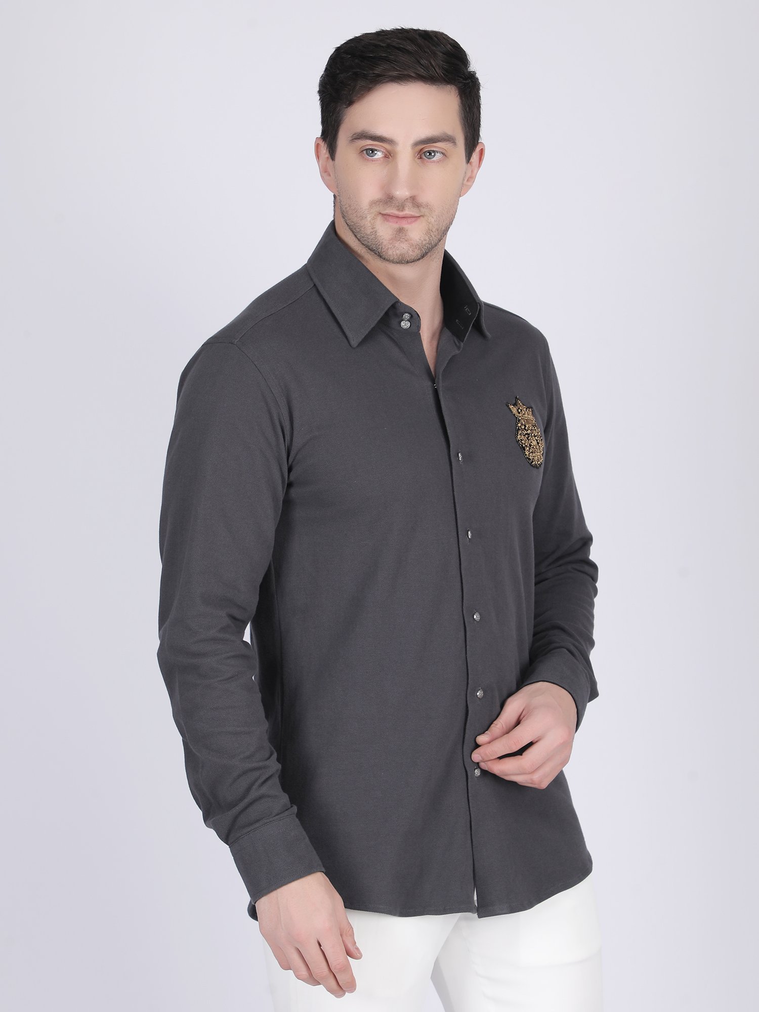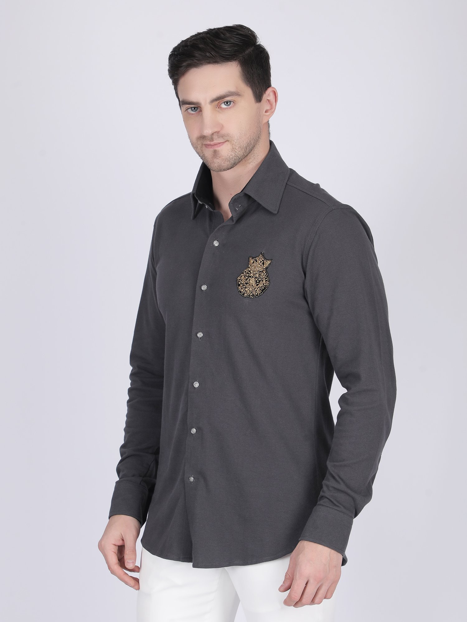 The knitted fabric feels soft, breathable, and comfortable for extended wear. At the same time, it maintains a smooth and structured fall that enhances the tailored fit. The hand embroidered chest motif adds depth and texture, which elevates the overall design. Therefore, this Grey Knit Shirt combines comfort with craftsmanship, making it ideal for men who prefer subtle luxury with strong styling presence.
