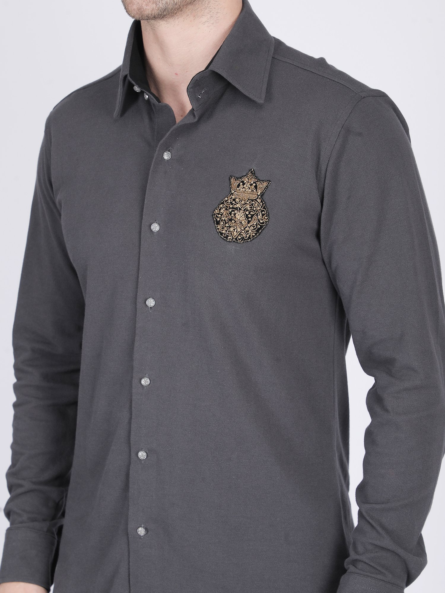 Grey Knit Shirt Hand Embroidery Tailored Fit