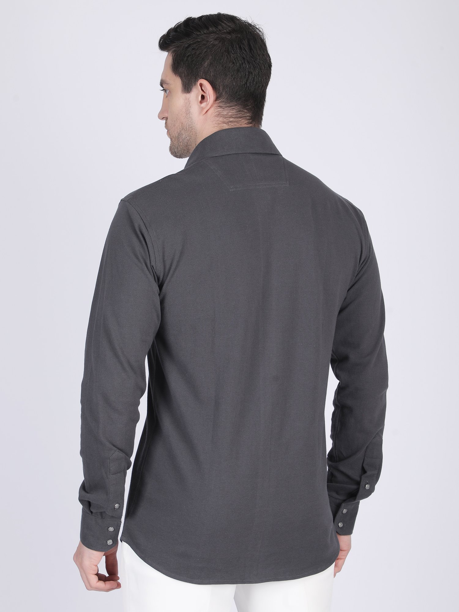 This Grey Knit Shirt with Hand Embroidery is designed for evening occasions, receptions, and refined daily styling. It offers a clean and modern look, while the chest embroidery adds a premium and distinctive highlight. The shirt features a structured silhouette along with a sharp collar and clean front placket, so it delivers a confident and polished appearance.