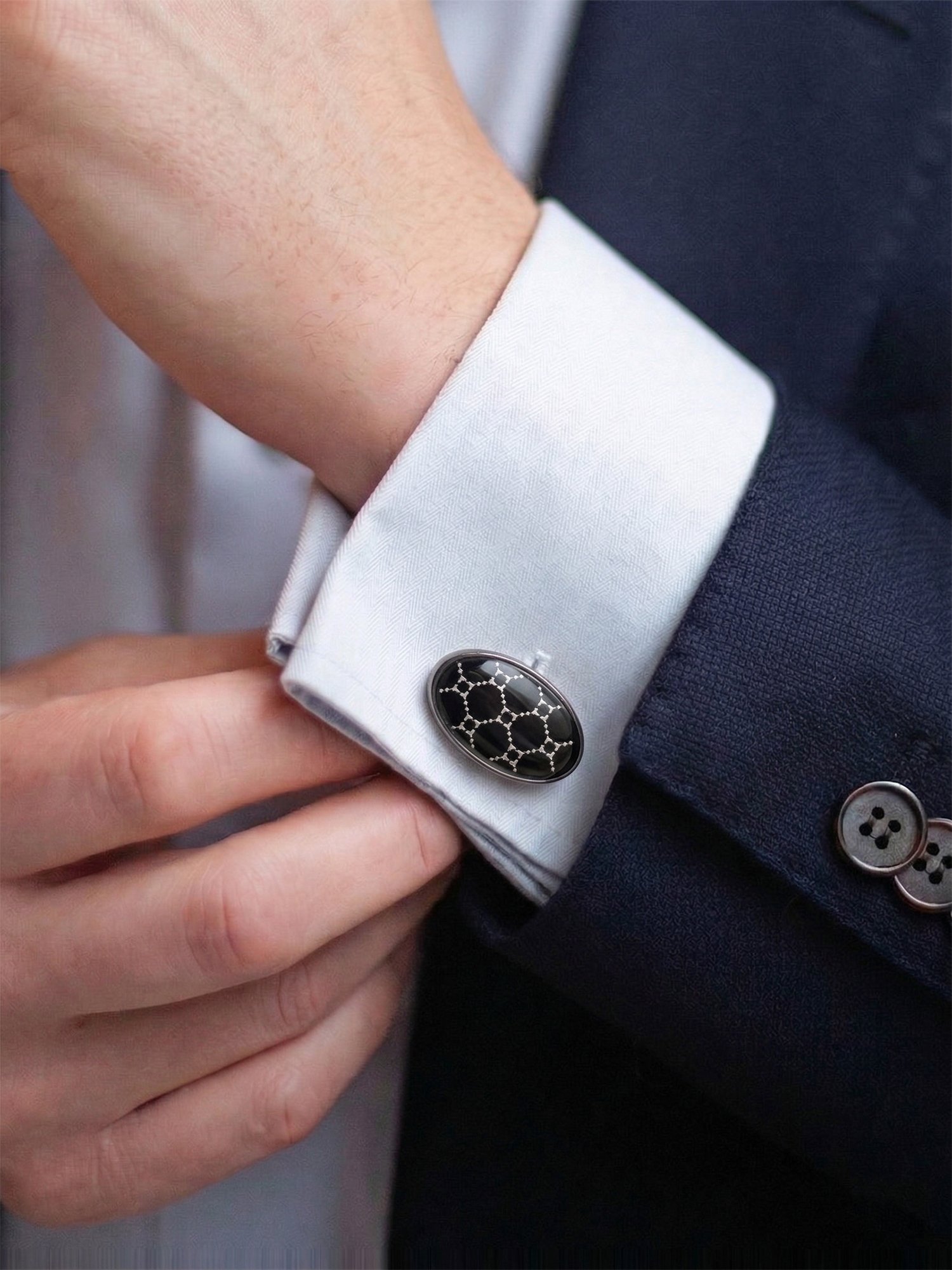 Geometry meets modern sophistication, these cufflinks feature a striking black base detailed with a subtle honeycomb pattern, set within a sleek gunmetal frame. The structured design adds depth and a contemporary edge, making them perfect for sharp, modern styling.