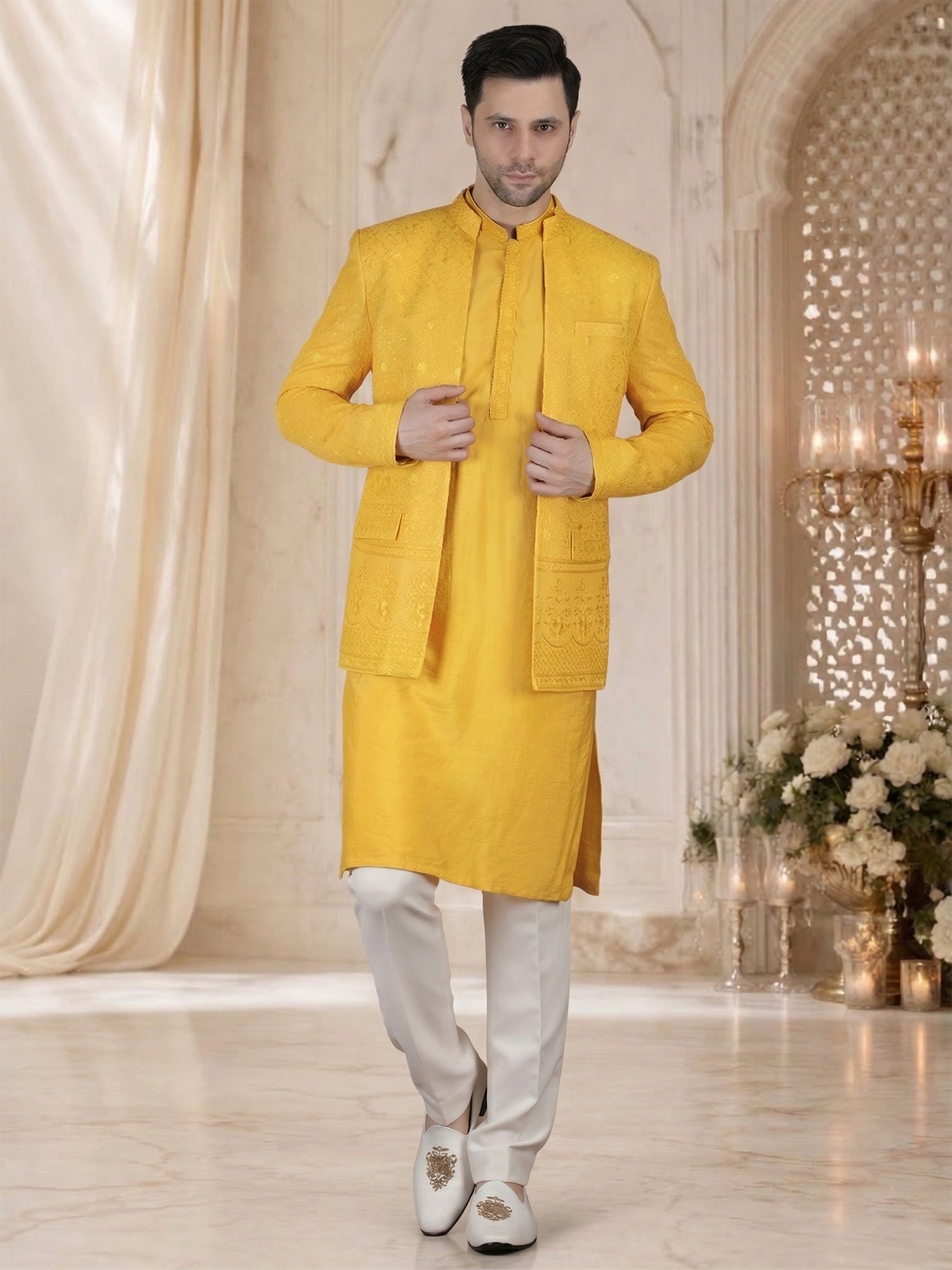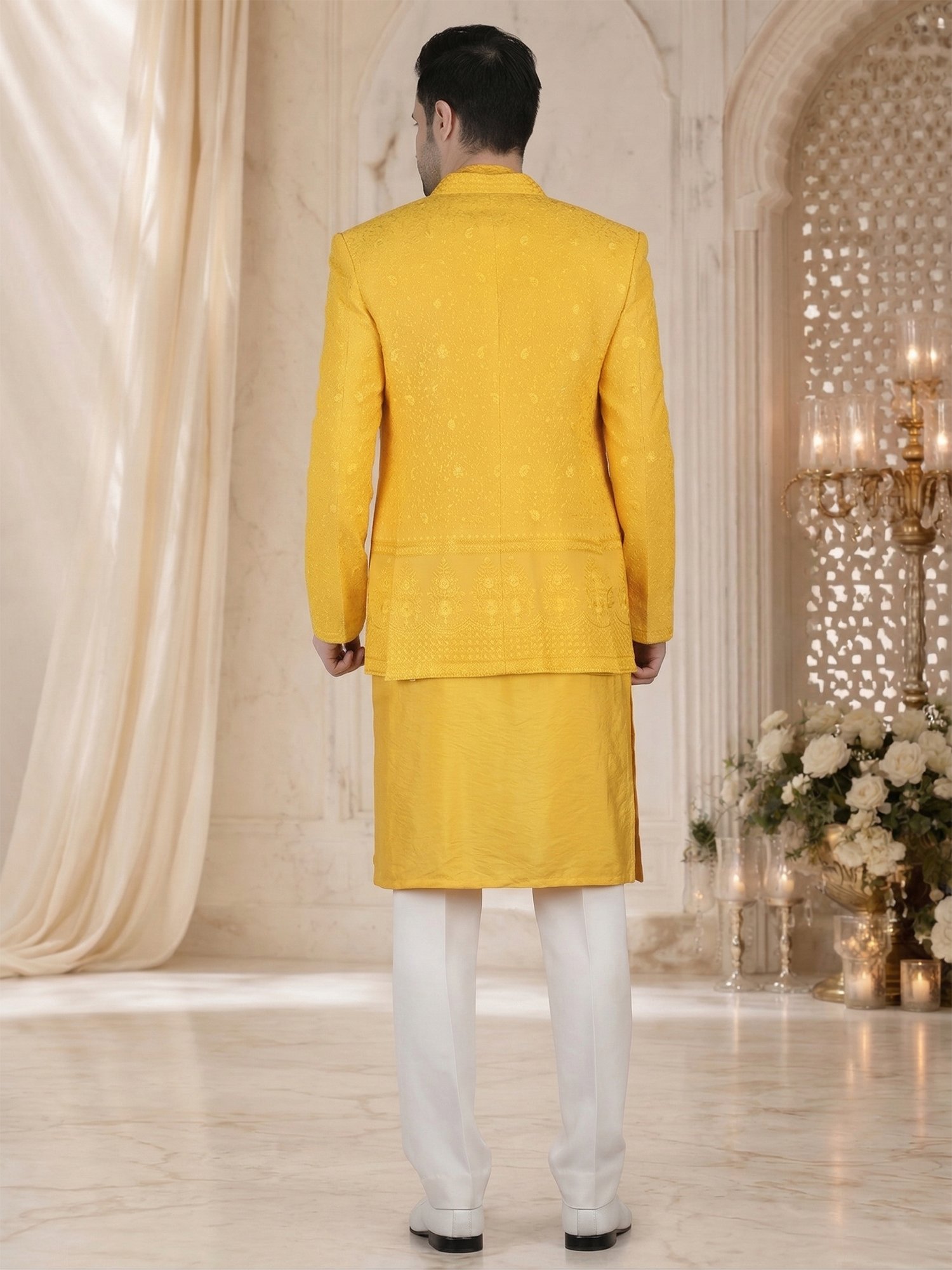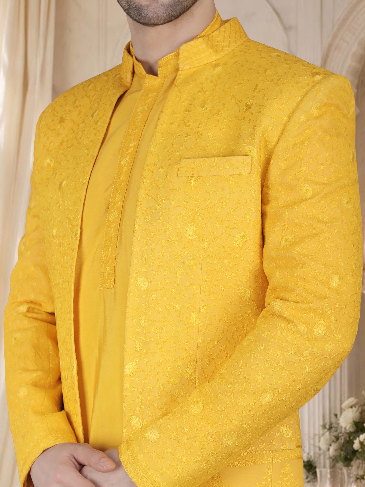 Yellow Thread Embroidery Bandhgala Set for Haldi Ceremony