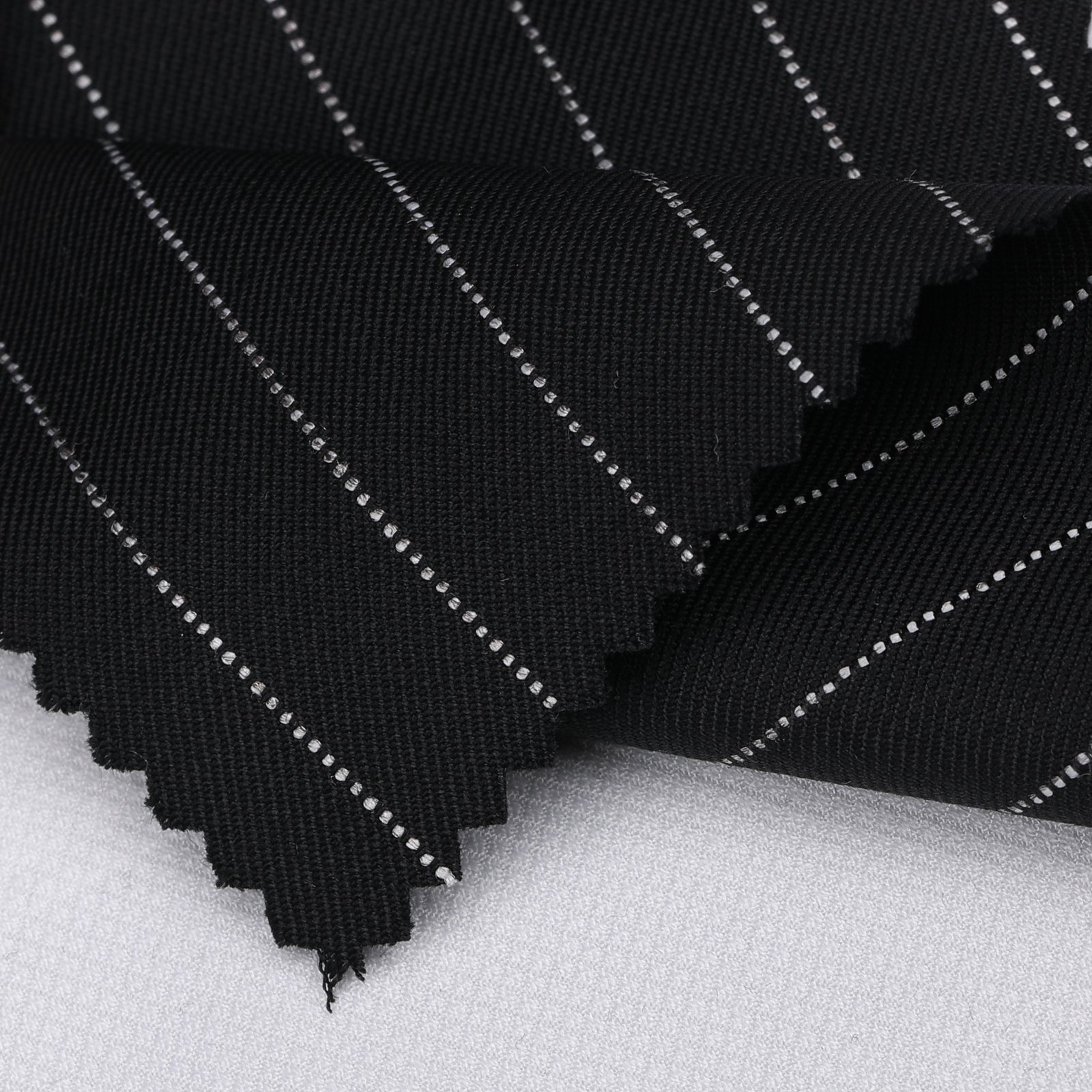 A bold statement of power and precision, this deep black fabric is elevated with striking white pinstripes that create a sharp and elongated visual impact. Crafted for elite tailoring, its rich tone and superior drape deliver a commanding silhouette, making it an exceptional choice for executive power suits and high-end formal occasions.