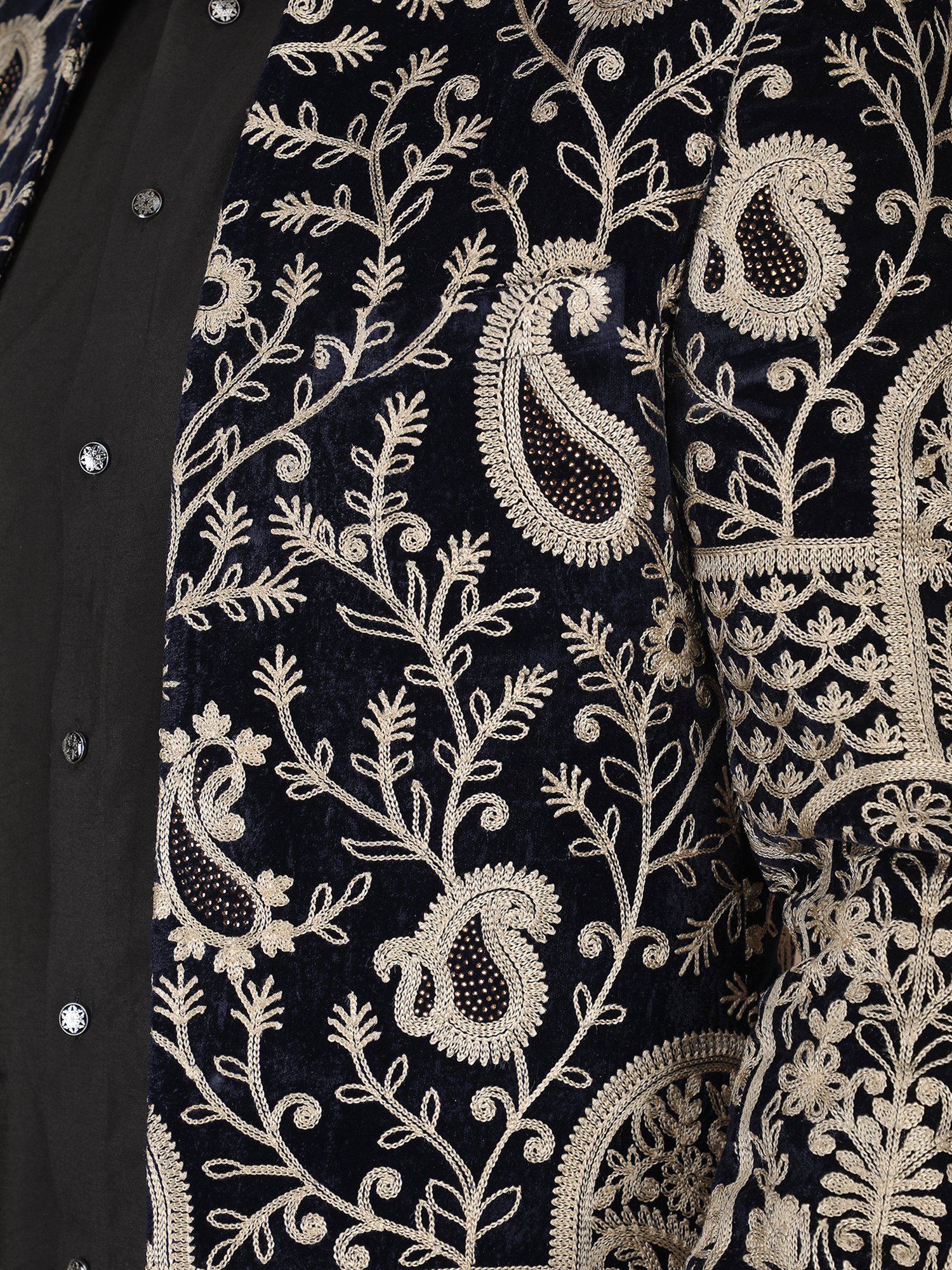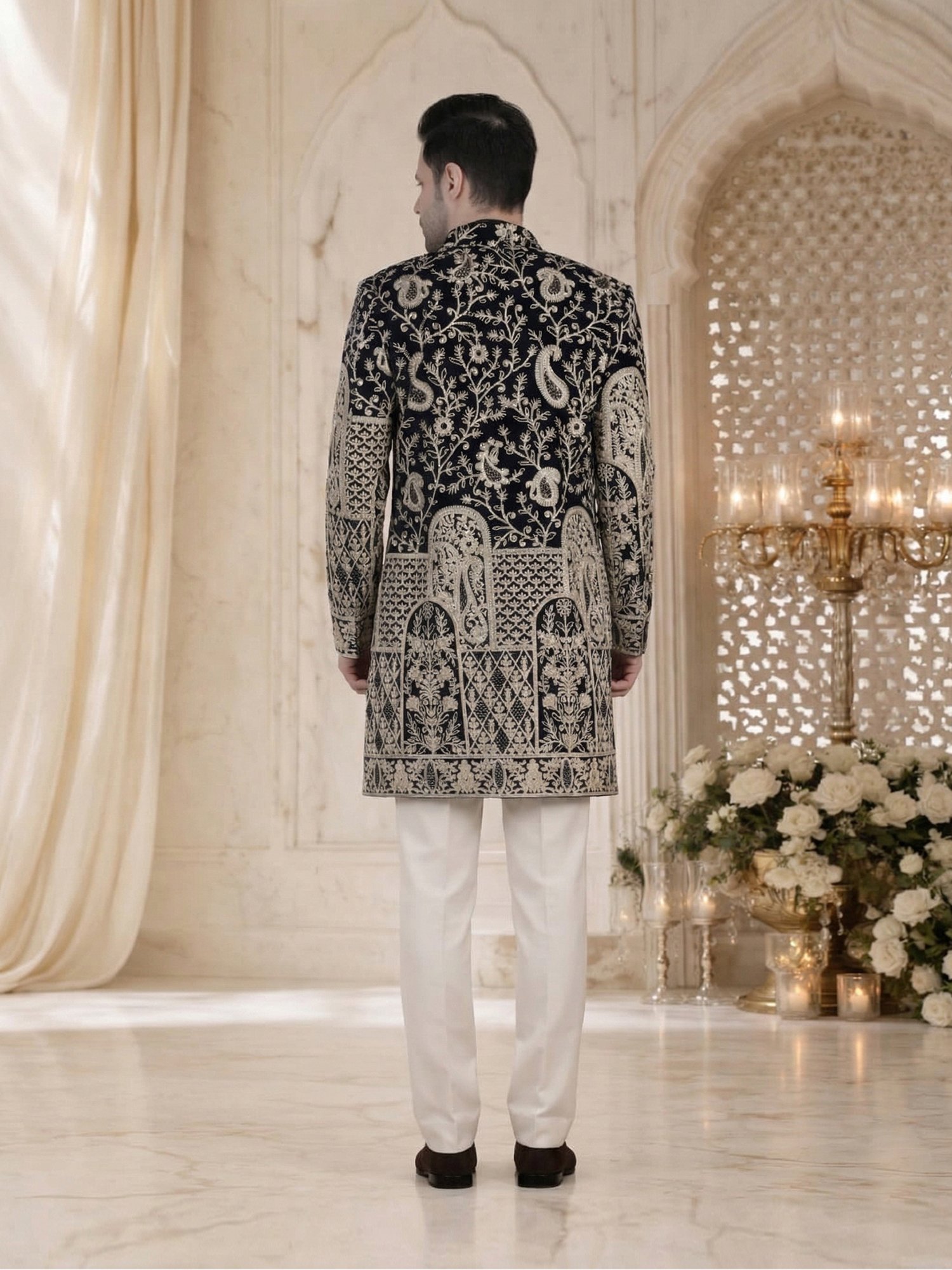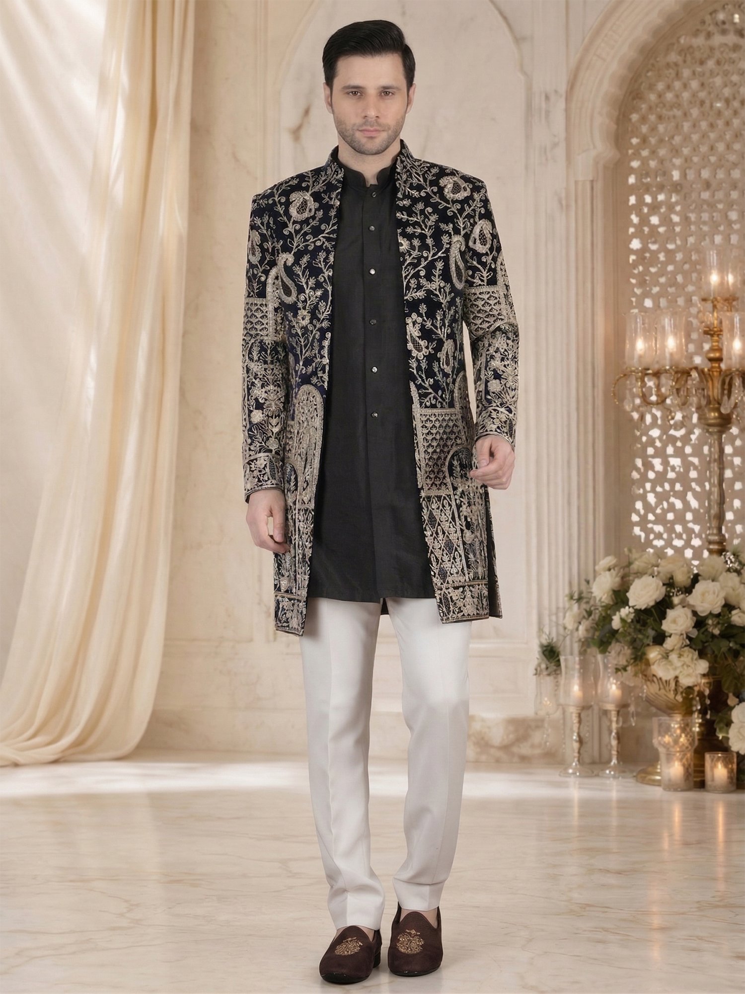 Crafted from premium velvet base fabric, this sherwani offers a rich texture and luxurious feel. The surface is enhanced with heavy zari and thread embroidery arranged in heritage-inspired patterns. Also, the detailed motifs are evenly spread across the fabric, creating a dense and regal look. Moreover, the fine finishing and precision stitching reflect high-quality craftsmanship.