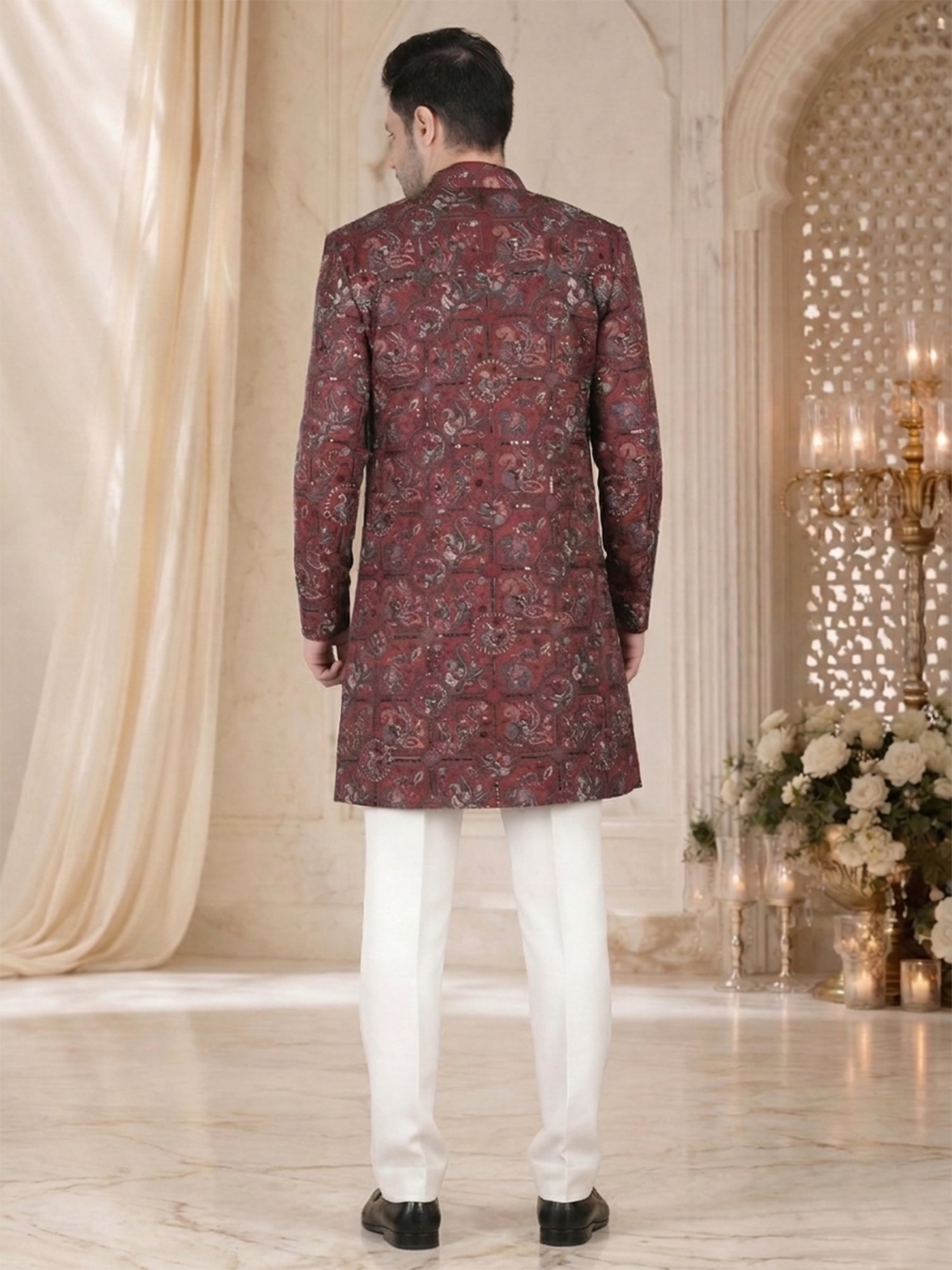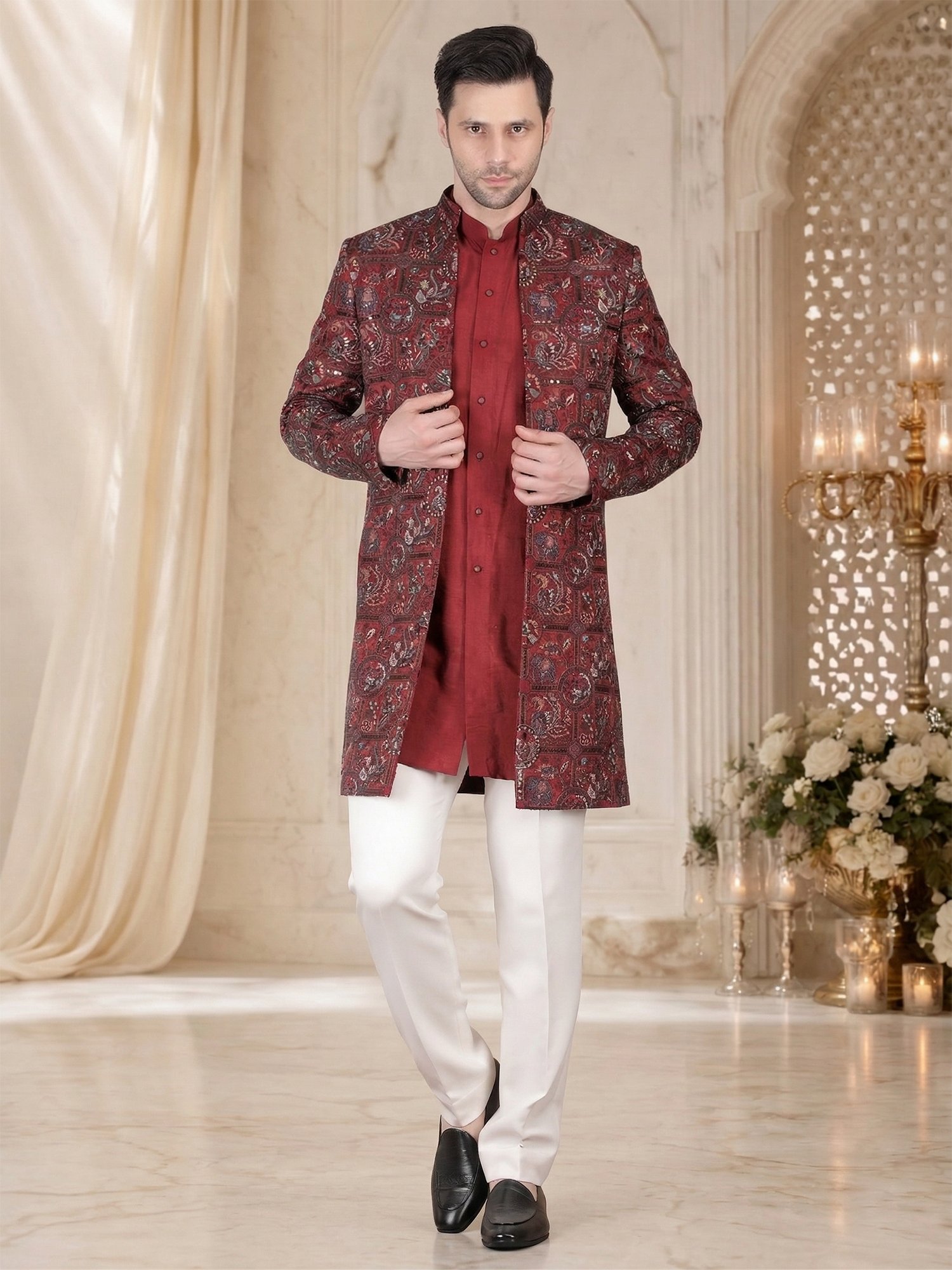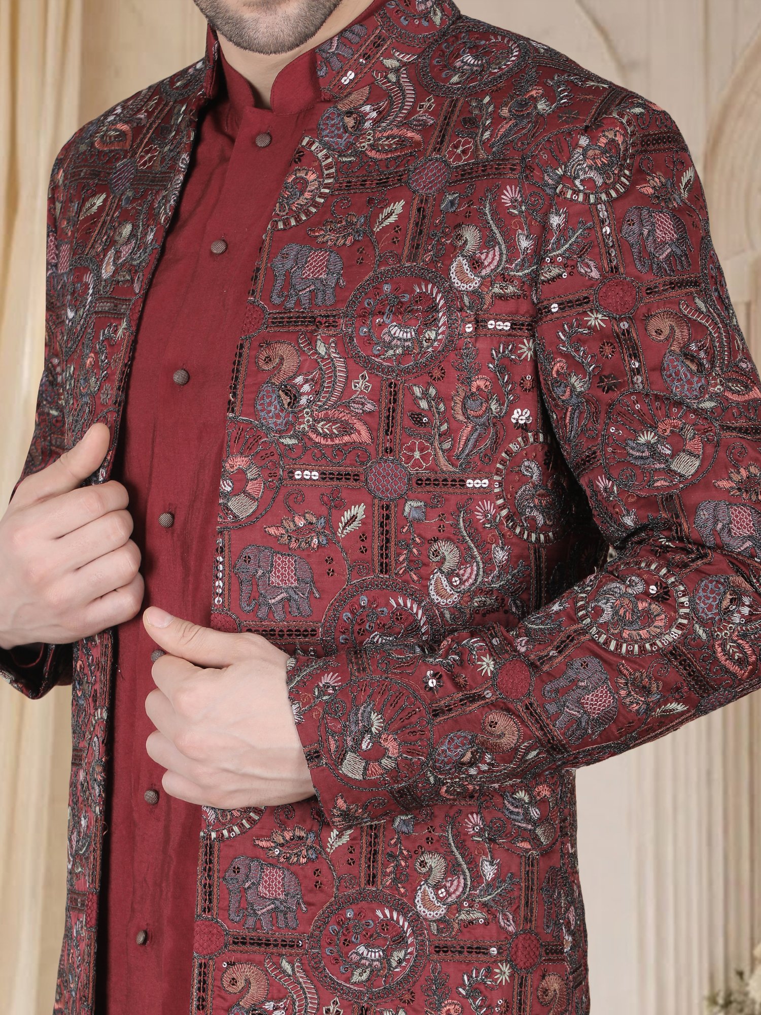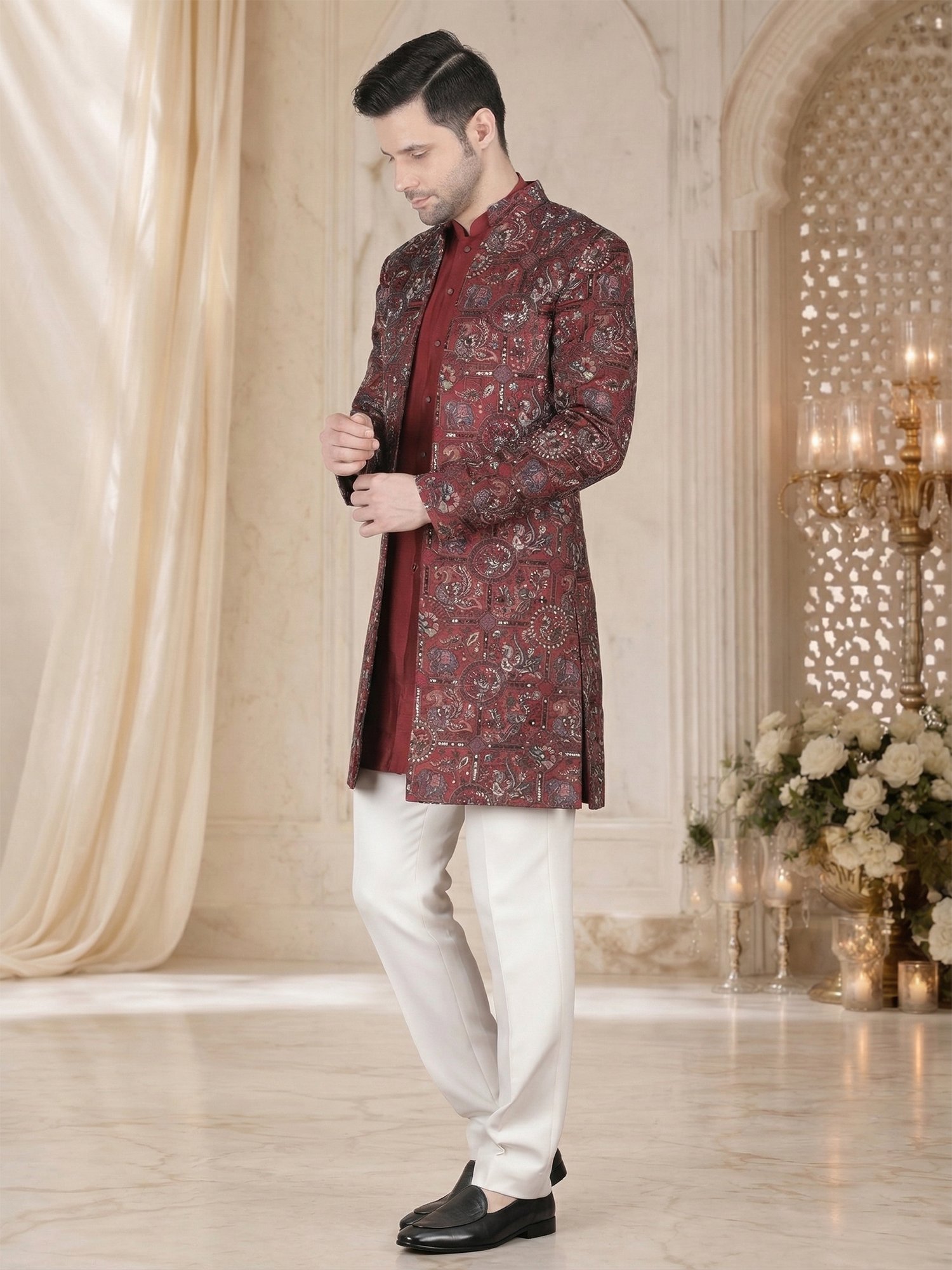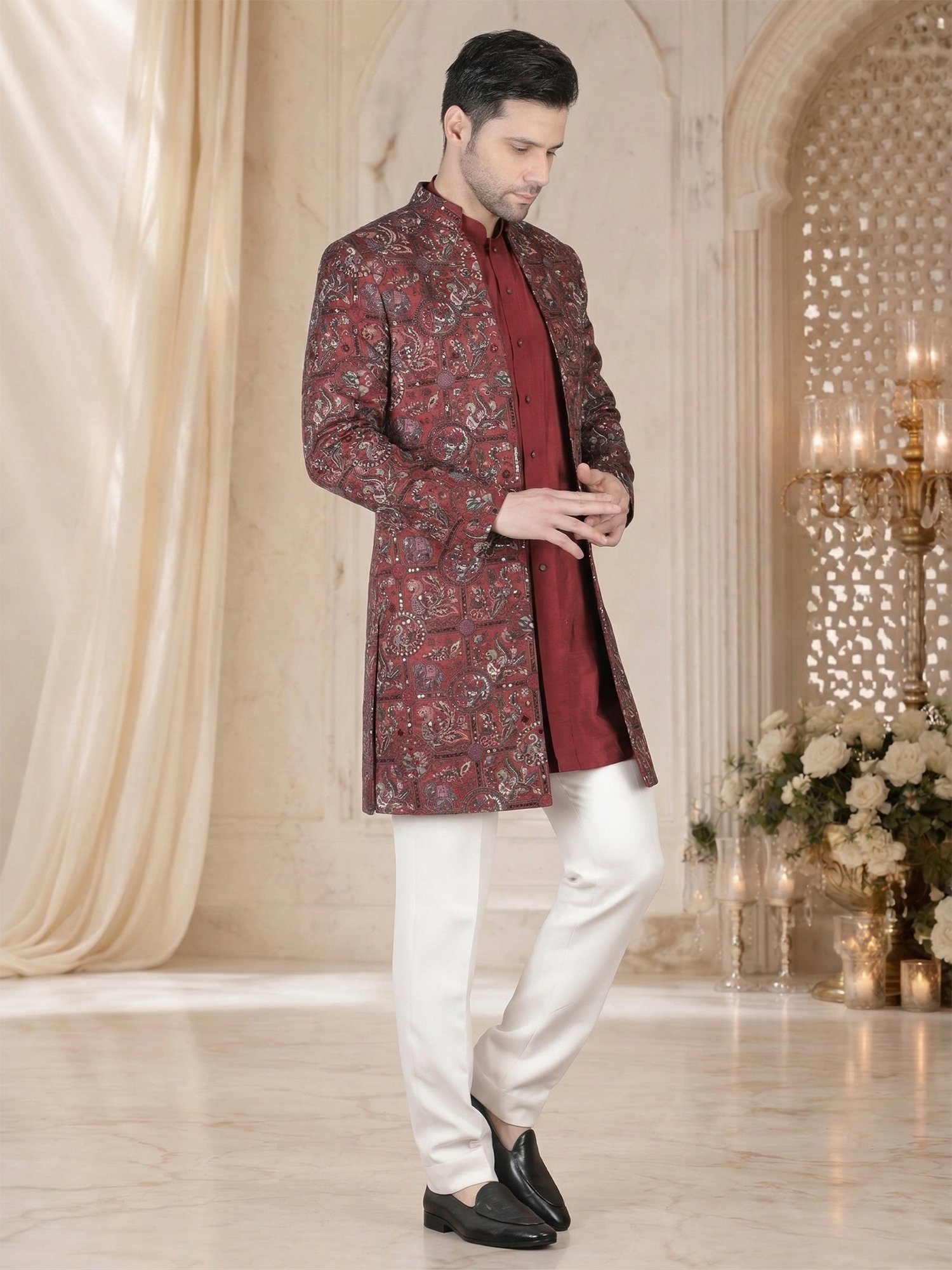Maroon Heritage Embroidered Indo Western Sherwani for Men