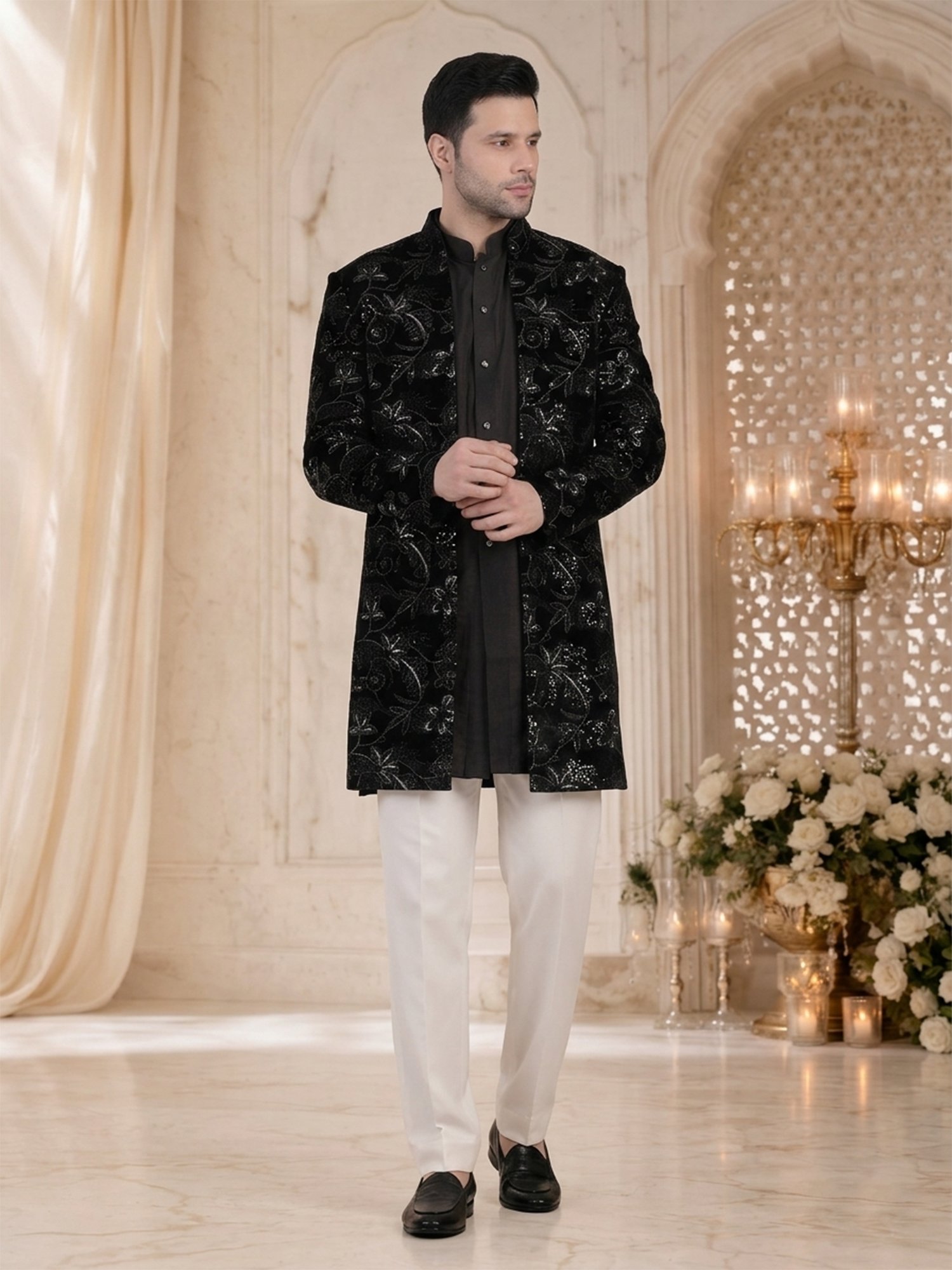 Pair this sherwani with black or ivory trousers for a classic and sophisticated contrast. You can keep accessories minimal to highlight the texture of the outfit. Complete the look with sleek loafers or traditional mojris.