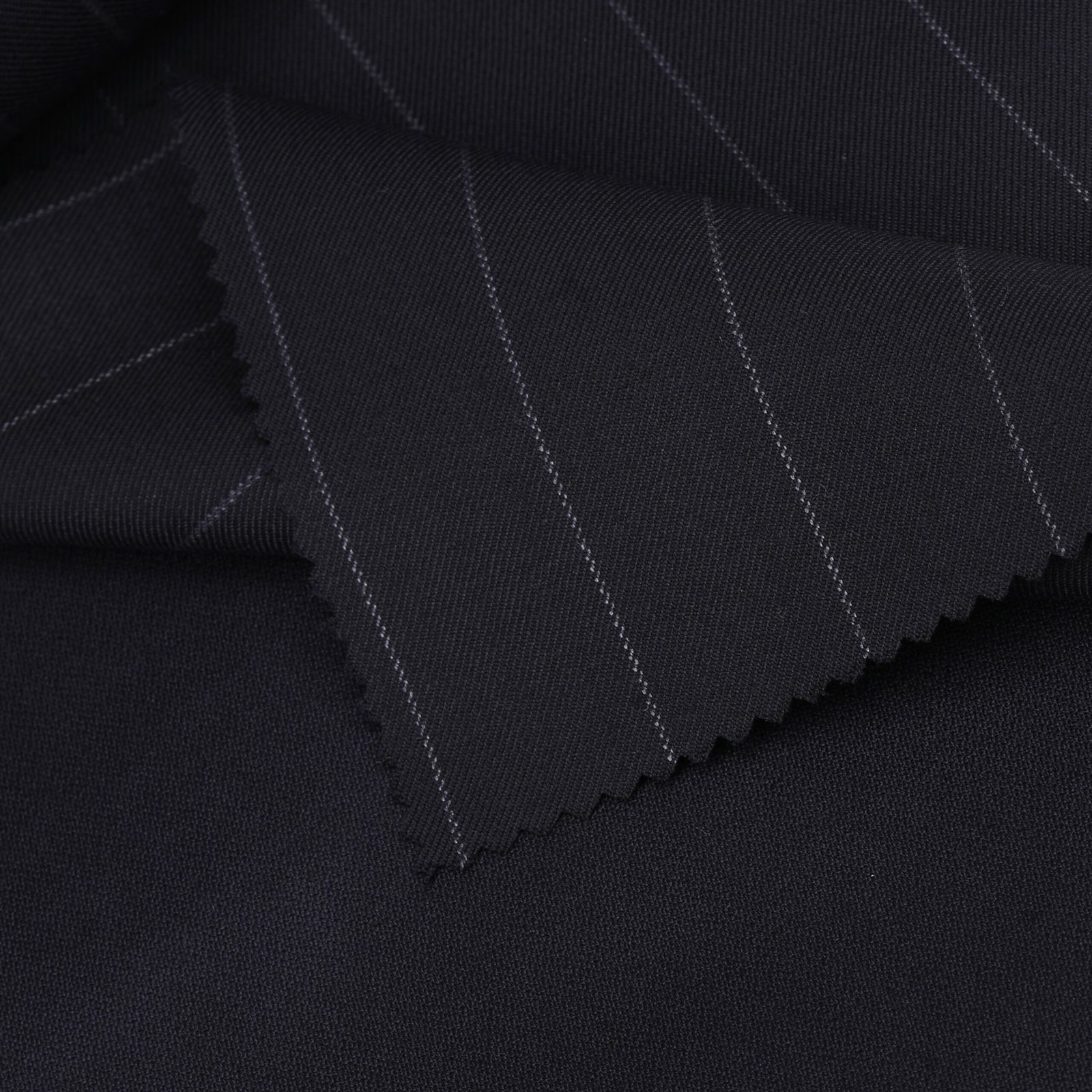 A commanding expression of Italian sartorial excellence, this fabric is presented in a deep navy tone, defined by bold, well-spaced pinstripes that introduce strong vertical structure and a confident visual rhythm. The sharp linear detailing enhances the depth of the fabric while maintaining a refined and disciplined aesthetic, creating a perfect balance between classic elegance and modern authority. Woven from premium high-twist fibers, the fabric delivers exceptional smoothness, breathability, and a naturally fluid drape that responds seamlessly to bespoke tailoring. Its structured composition ensures a sharp, elongated silhouette, enhancing presence and confidence in formal and professional settings. The richness of its tone combined with its pronounced stripe pattern makes it an ideal choice for power dressing, executive wear, and evening sophistication. This fabric embodies precision, strength, and timeless luxury, crafted for individuals who lead with confidence and refined style.