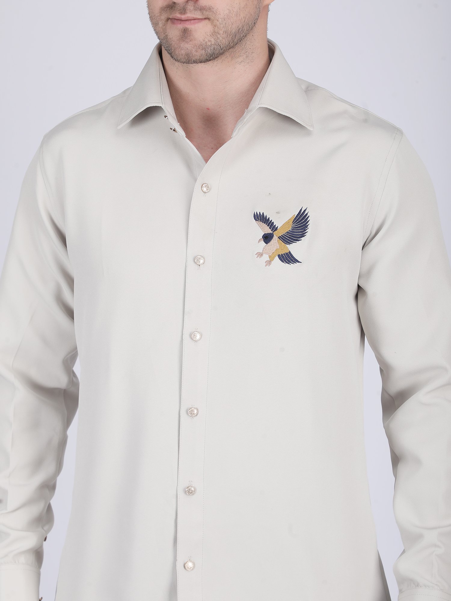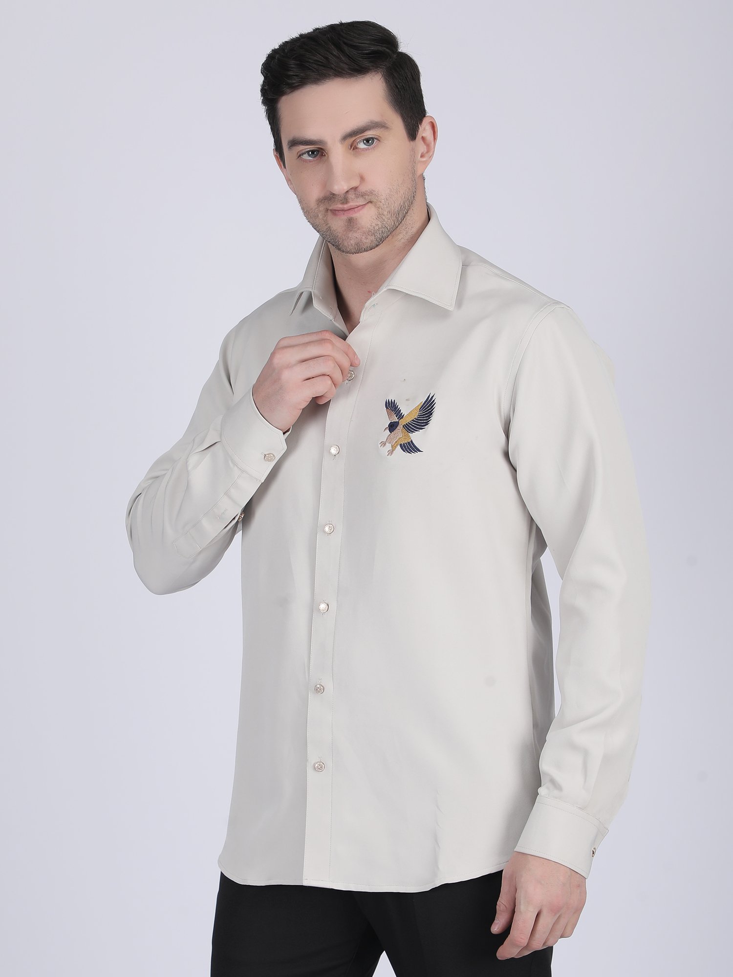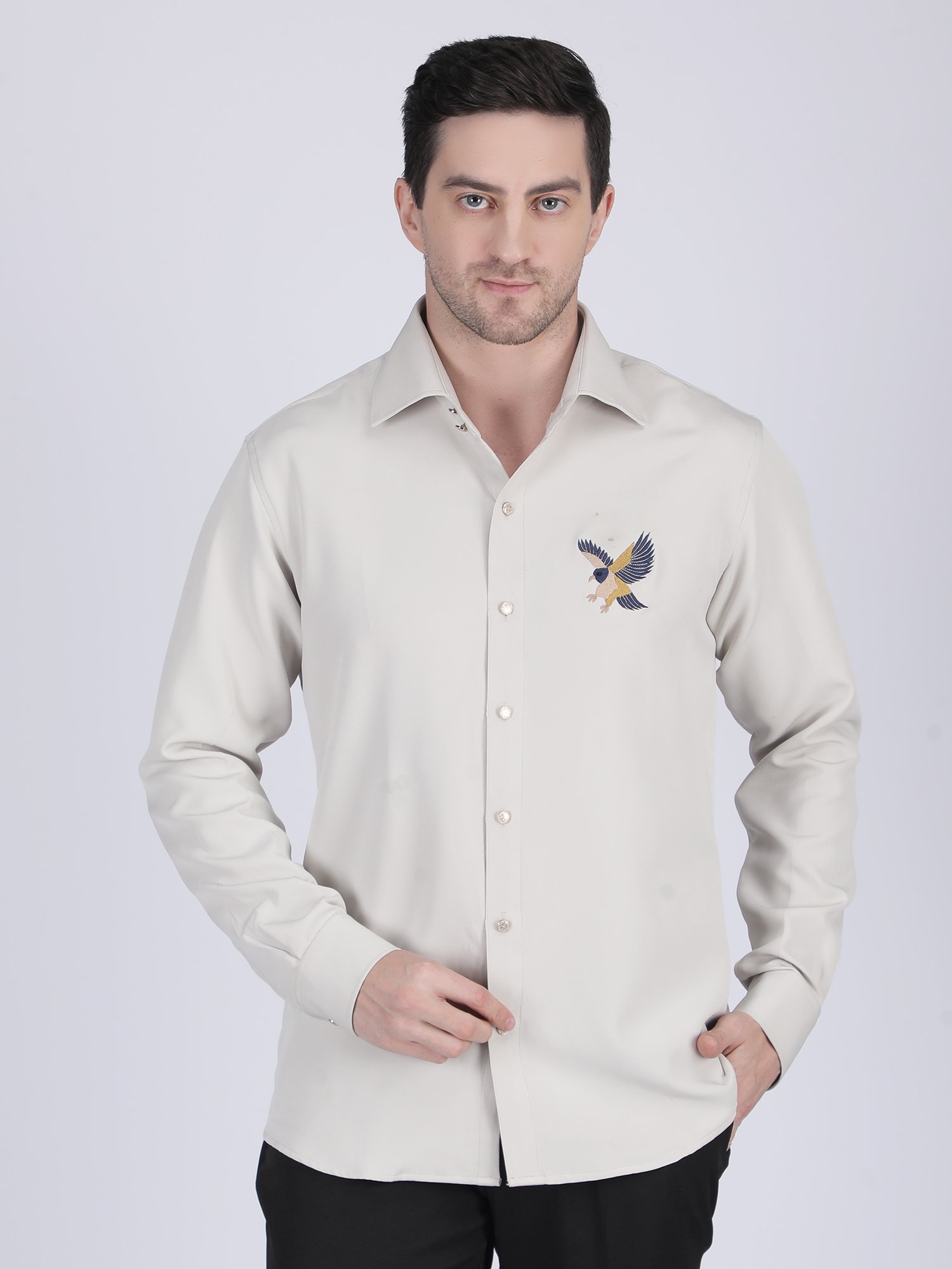 This Ivory Embroidered Shirt is designed for evening occasions, refined gatherings, and premium styling where subtle detailing defines elegance. The soft ivory tone creates a sophisticated and clean appearance, while the chest embroidery motif adds a distinctive and luxurious touch. The structured collar and sharp front placket enhance the overall finish, so it delivers a polished and modern look.