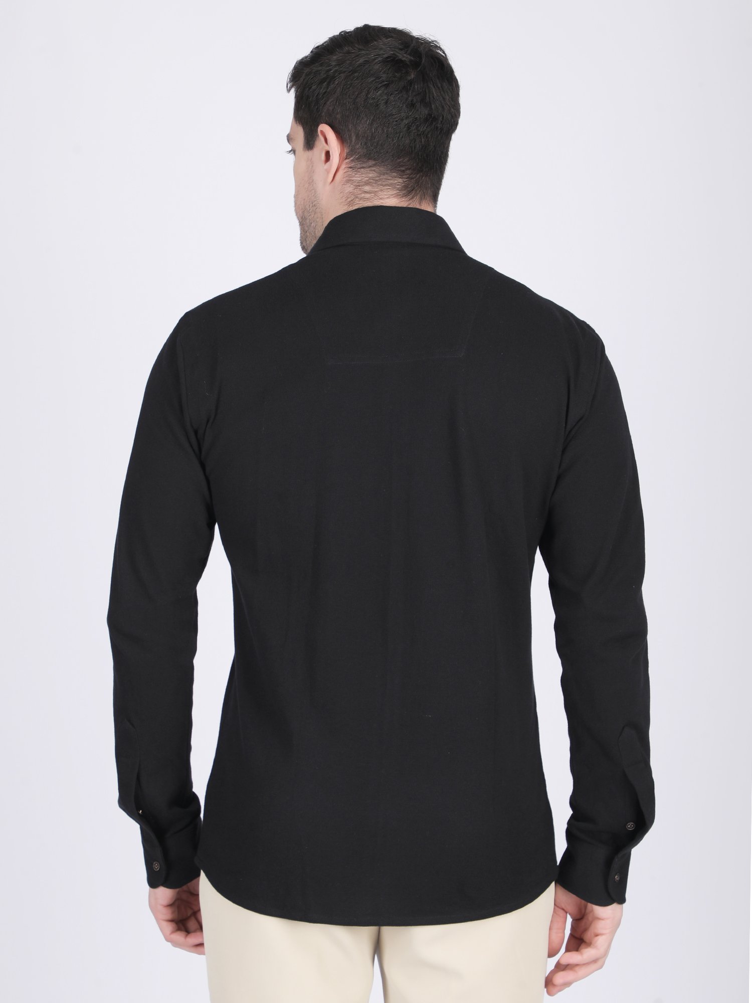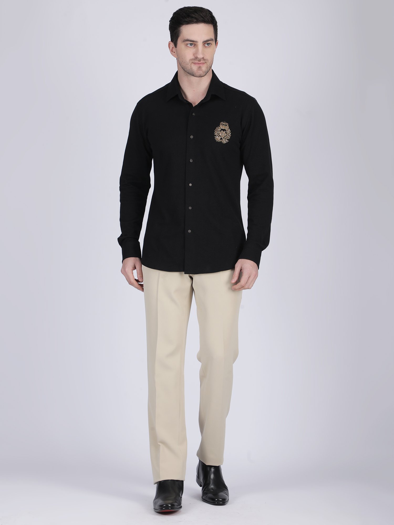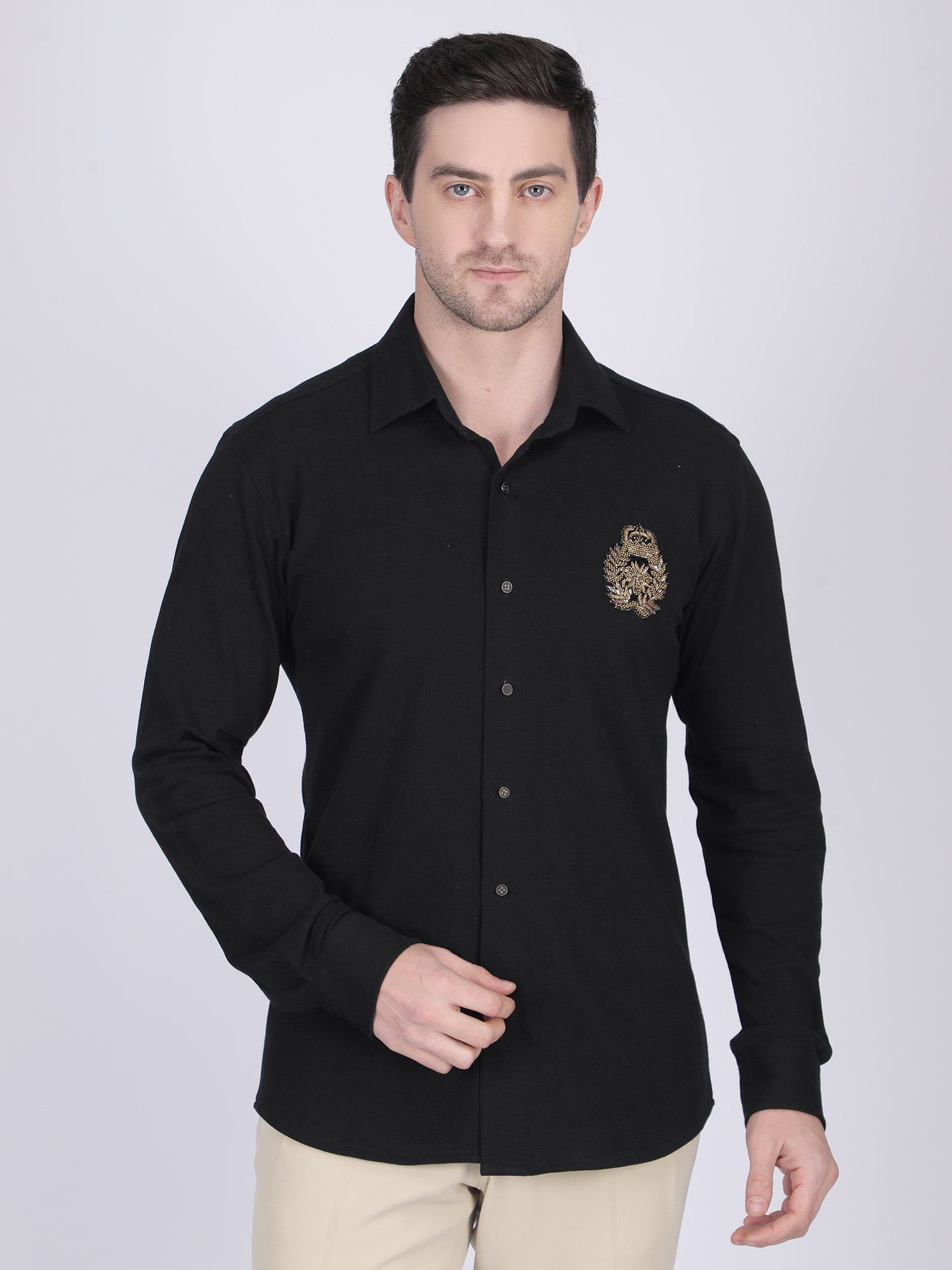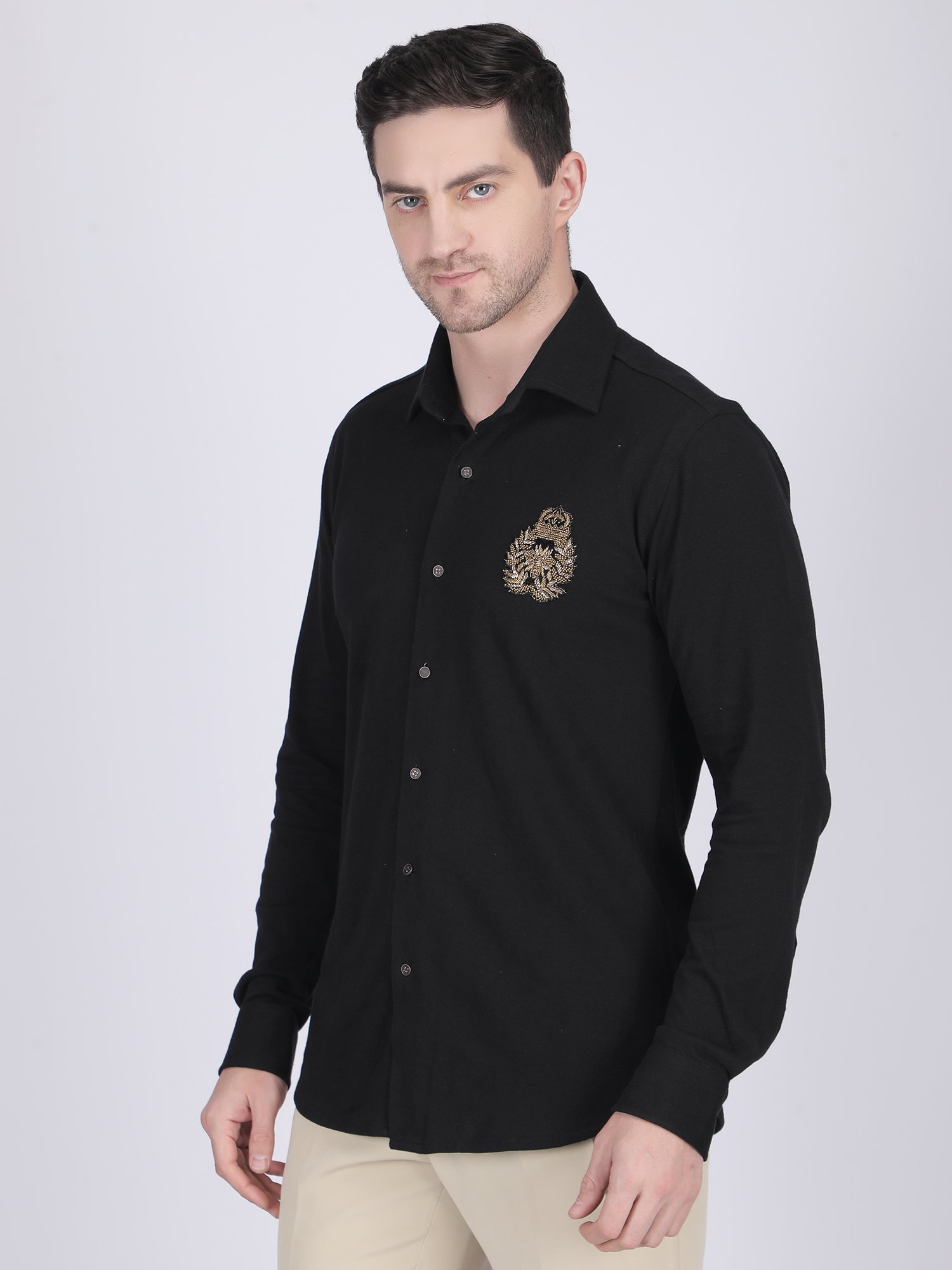 This Black Knitted Shirt with Hand Embroidered Motif is designed for evening occasions, receptions, and refined styling. It offers a clean and modern look, while the chest embroidery adds a distinctive and premium touch. The shirt features a structured silhouette along with a sharp collar and clean front placket, so it delivers a confident and polished appearance.