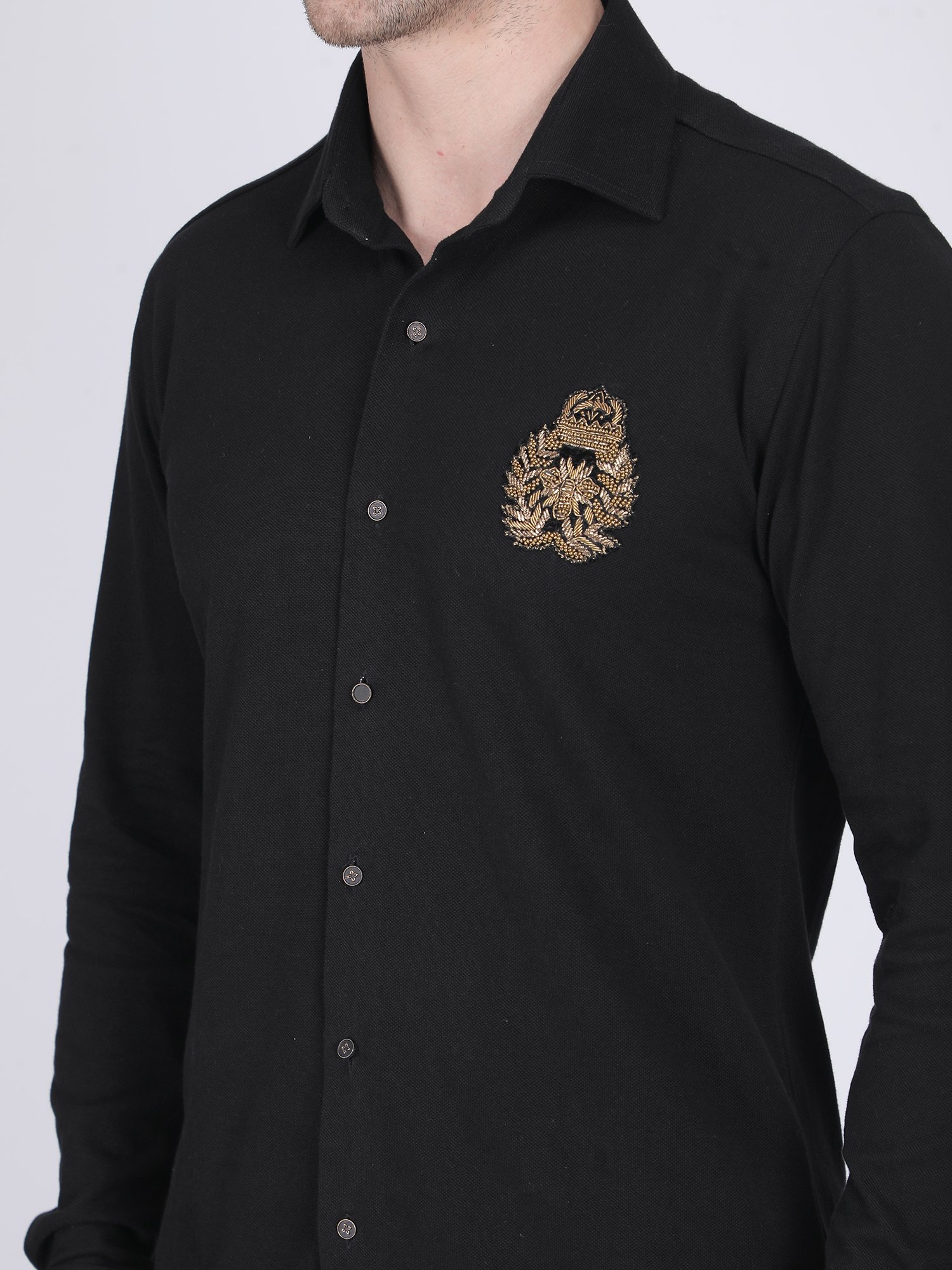 Knitted Shirt Black Hand Embroidered Tailored Fit