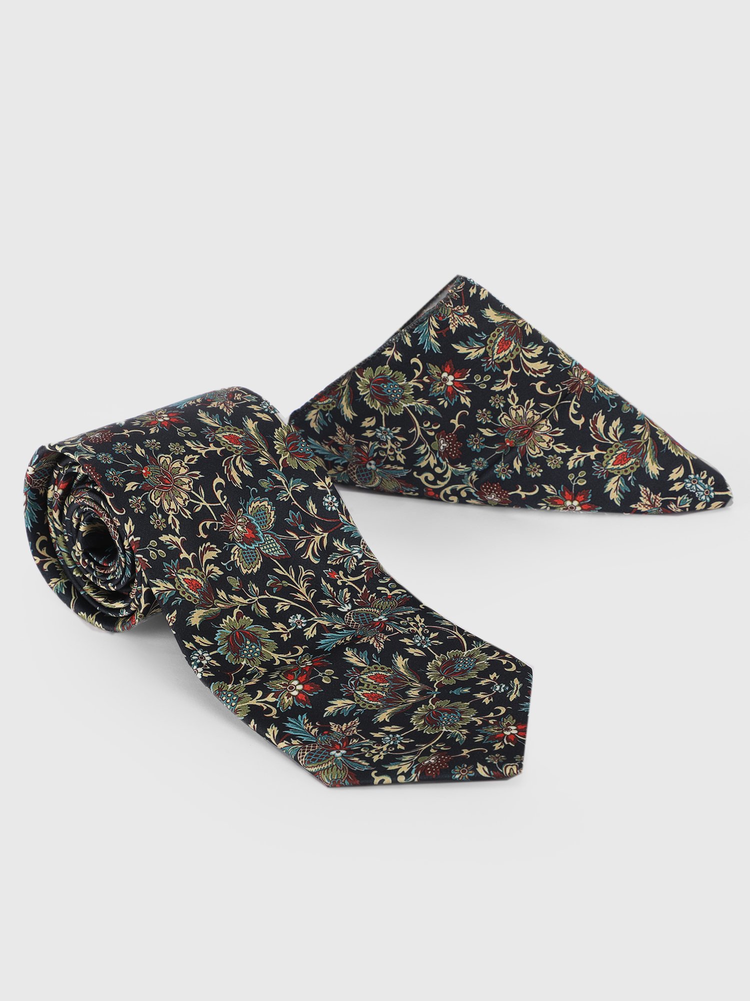 An embodiment of timeless heritage and refined luxury, this premium tie and pocket square set features an intricate floral jacquard pattern inspired by classic royal motifs. The deep, rich base complemented by subtle multicolor detailing creates a sophisticated and elegant appeal, perfect for weddings, formal occasions, and evening wear.