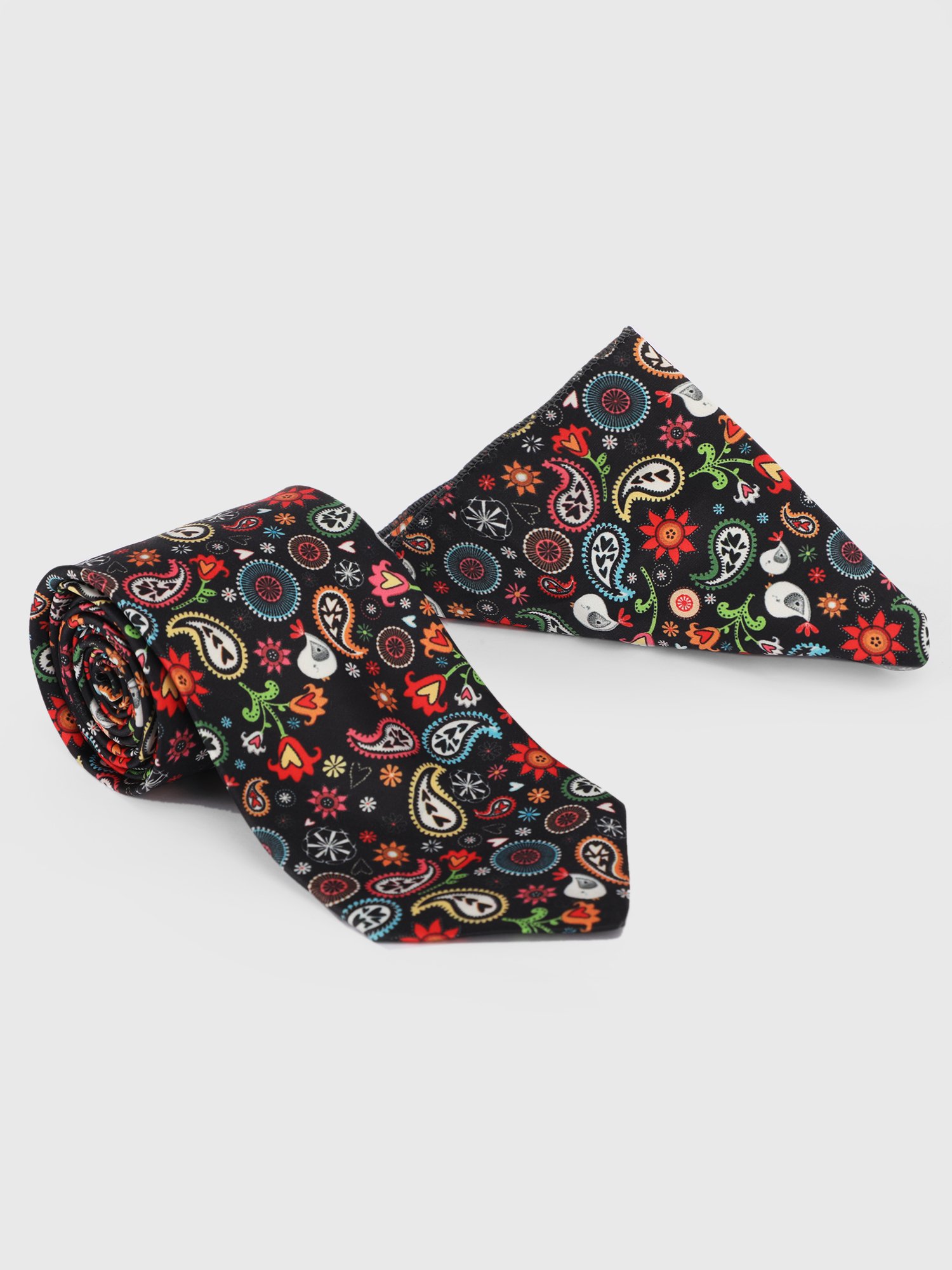 A vibrant celebration of artistry and elegance, this luxury tie and pocket square set features a richly detailed multicolor floral jacquard pattern set against a deep base. The lively blend of colors and intricate motifs creates a striking visual appeal, making it a perfect choice for weddings, festive occasions, and statement formal wear.