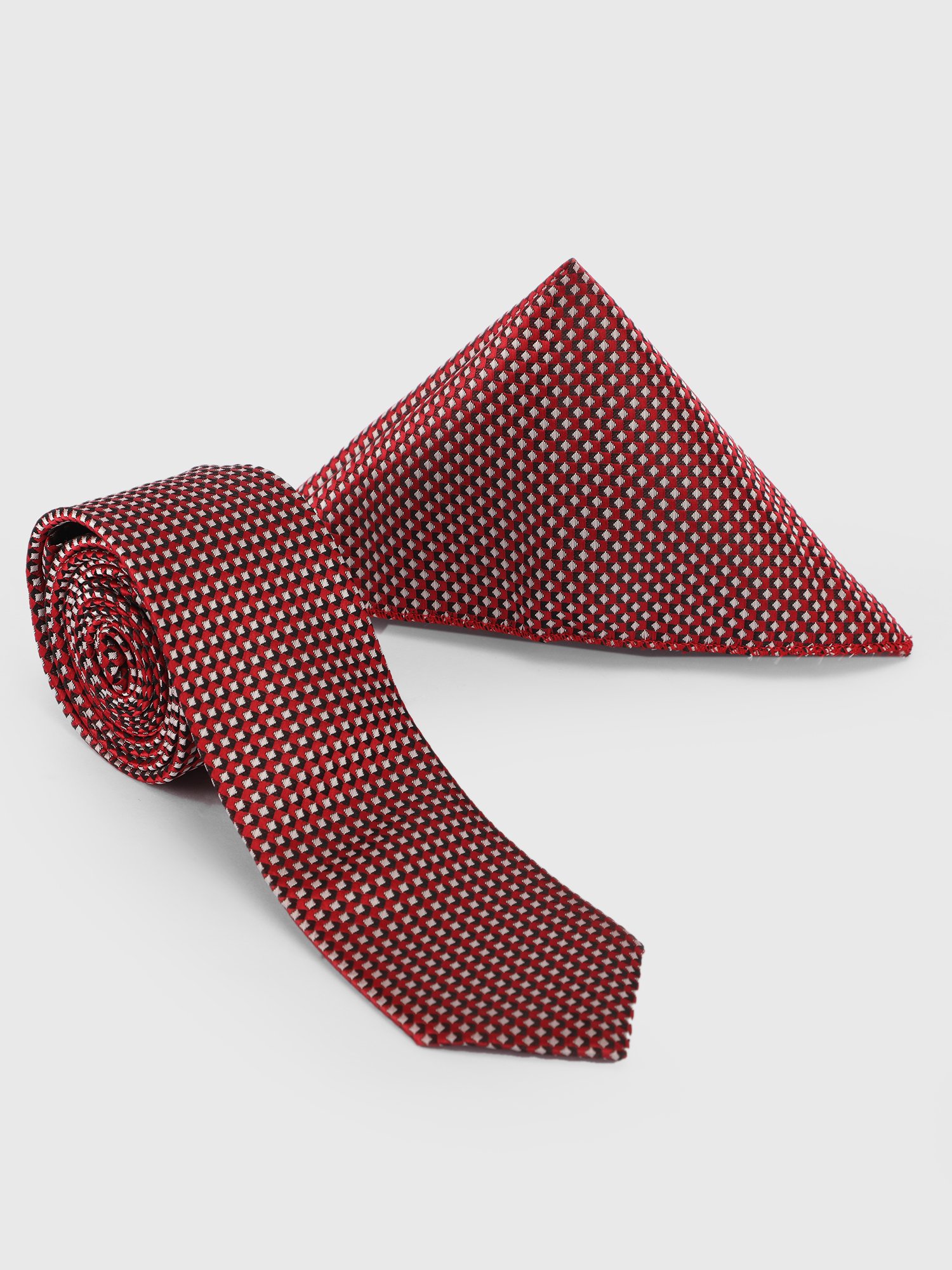 A refined expression of modern sophistication, this luxury tie and pocket square set features a finely detailed micro-pattern jacquard design on a rich red base. The subtle geometric texture adds depth and elegance without being overpowering, making it a versatile choice for both formal and business occasions.