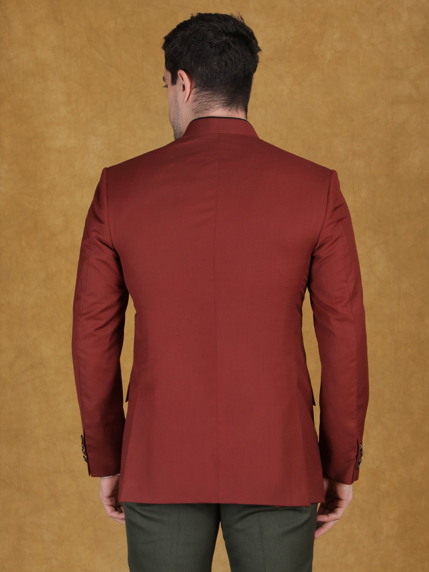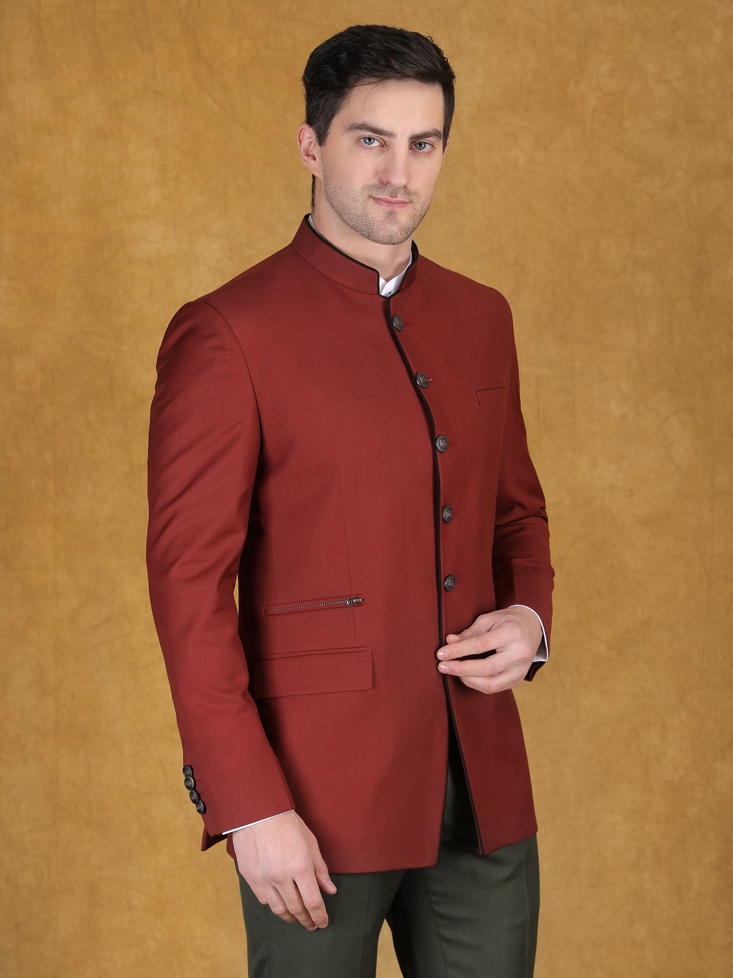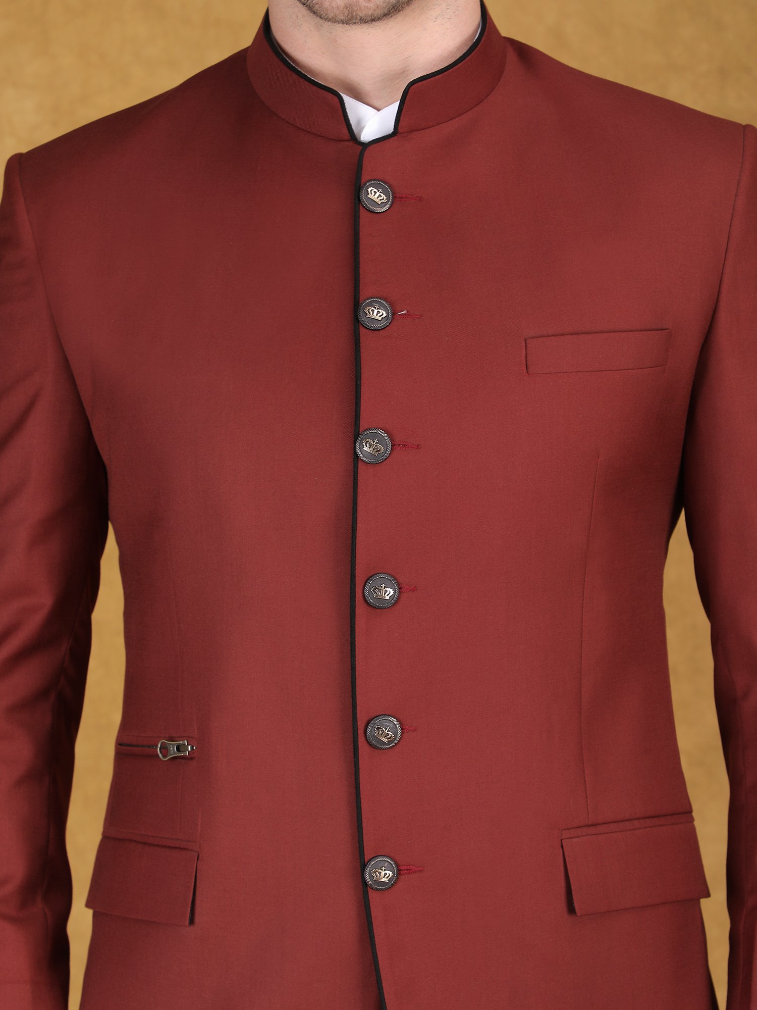 This Maroon Suiting Bandhgala is designed for men who prefer a refined and structured reception look with a strong yet sophisticated presence. The deep maroon tone, with its subtle brown undertone, creates a rich and mature appearance that stands apart from brighter reds. The design focuses on clean tailoring and fabric quality rather than heavy embroidery, making it ideal for modern styling. The smooth surface highlights the precision of the cut and the sharpness of the silhouette. Therefore, this Maroon Suiting Bandhgala becomes an ideal choice for reception events where elegance is defined through simplicity and structure. Moreover, the bandhgala fit enhances the personality, offering a confident and polished look.