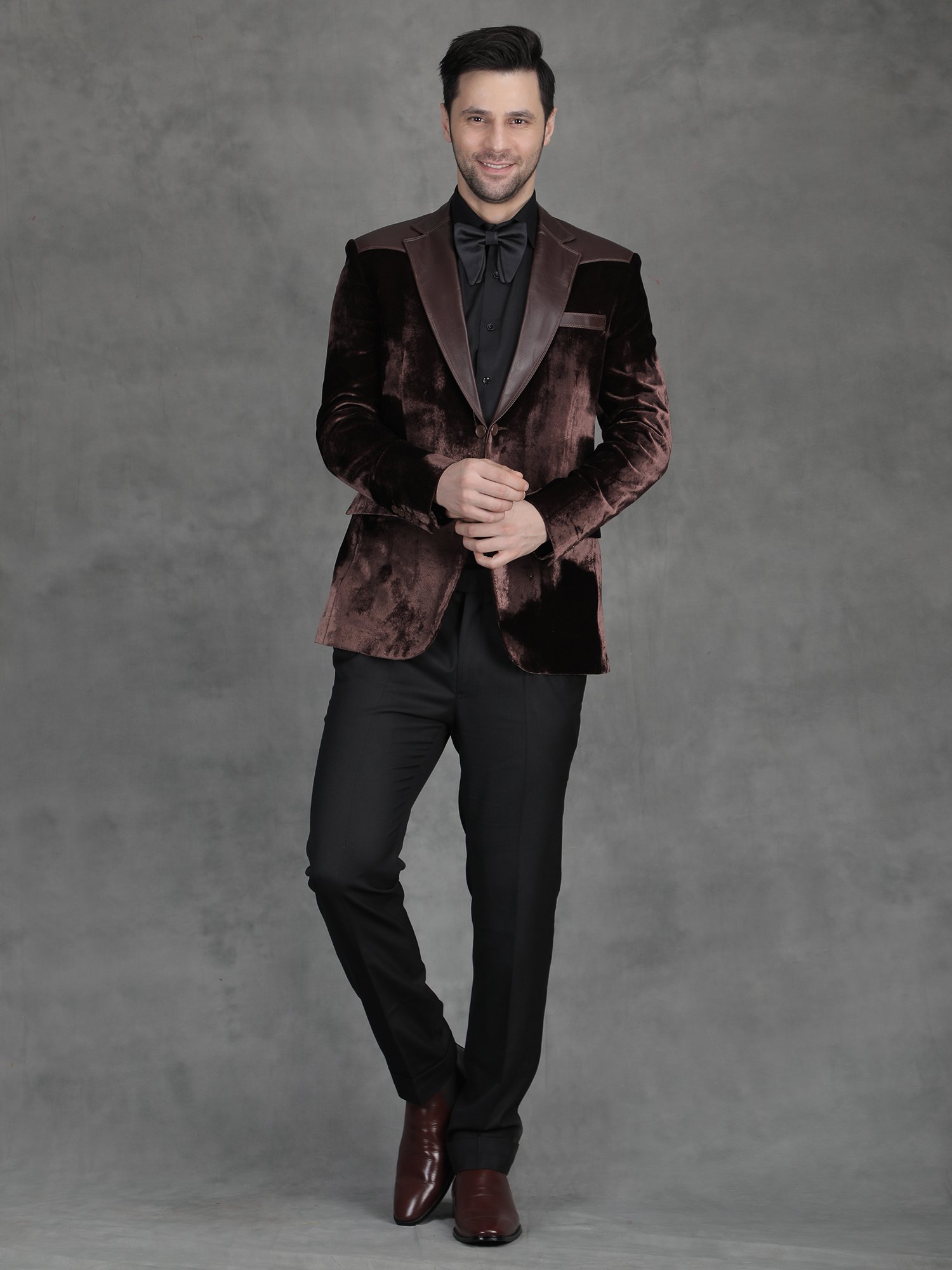 This Brown Reception Blazer suits receptions, cocktail parties, and evening celebrations. The silk velvet texture combined with leather accents creates a bold yet sophisticated appearance under lighting. Therefore, it allows you to stand out with confidence and elegance.