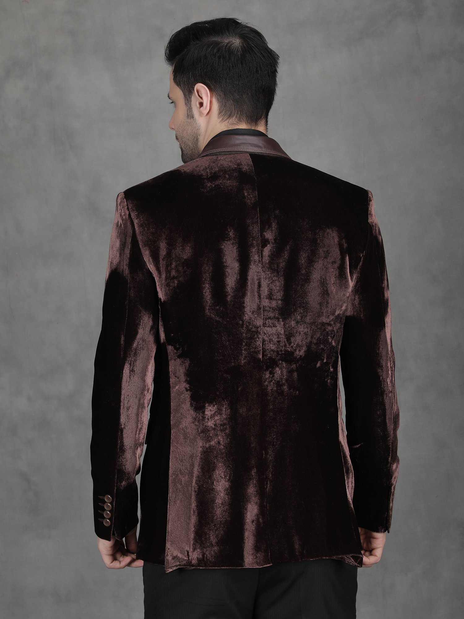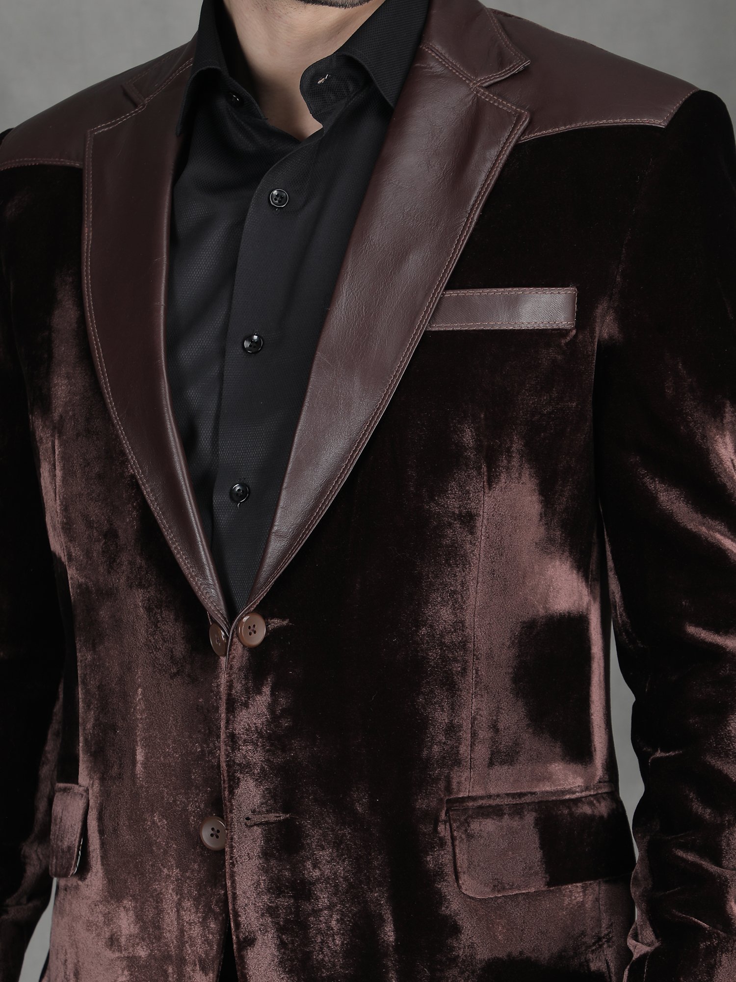 Brown Silk Velvet Blazer with Leather Trim for Reception