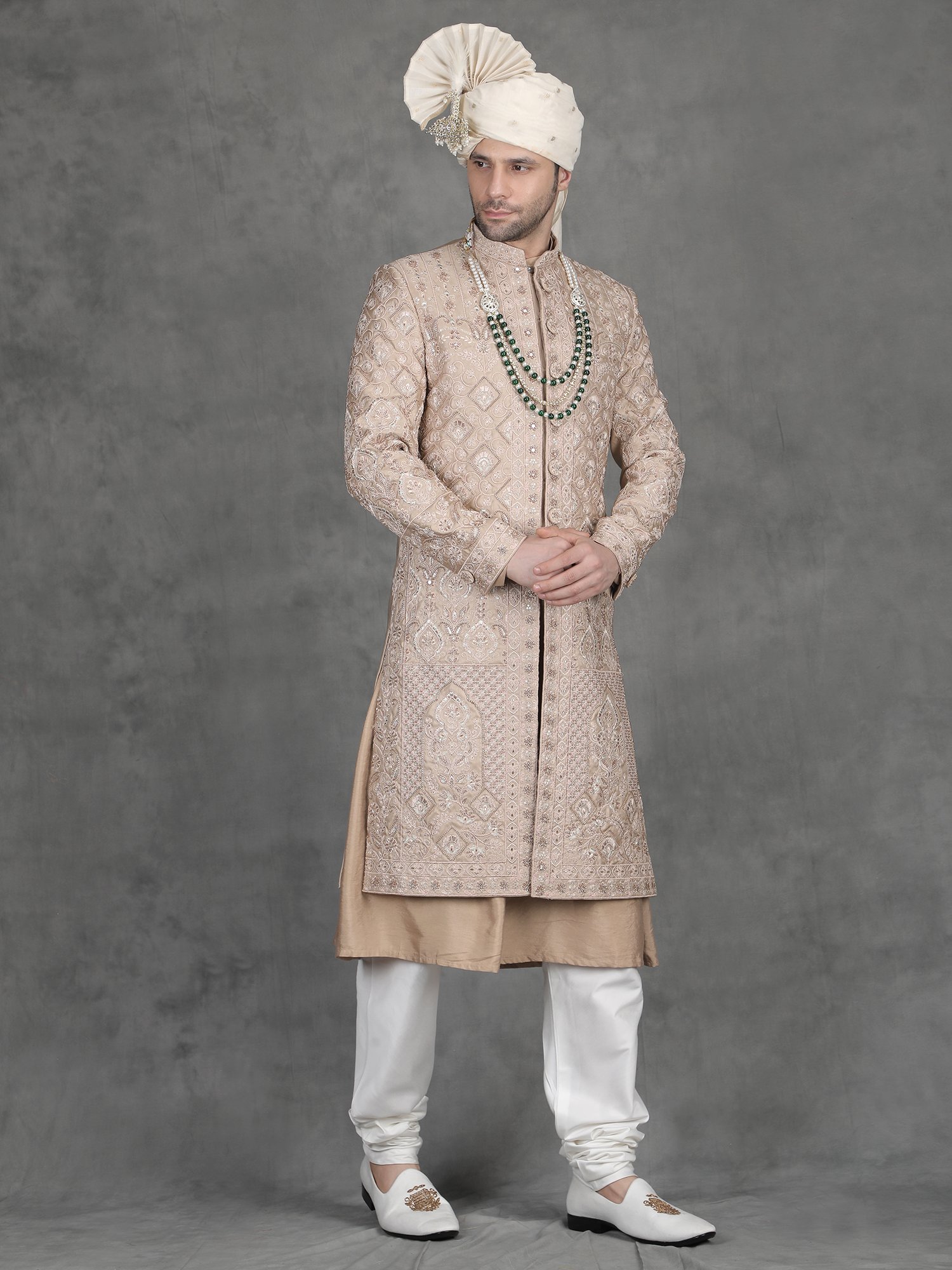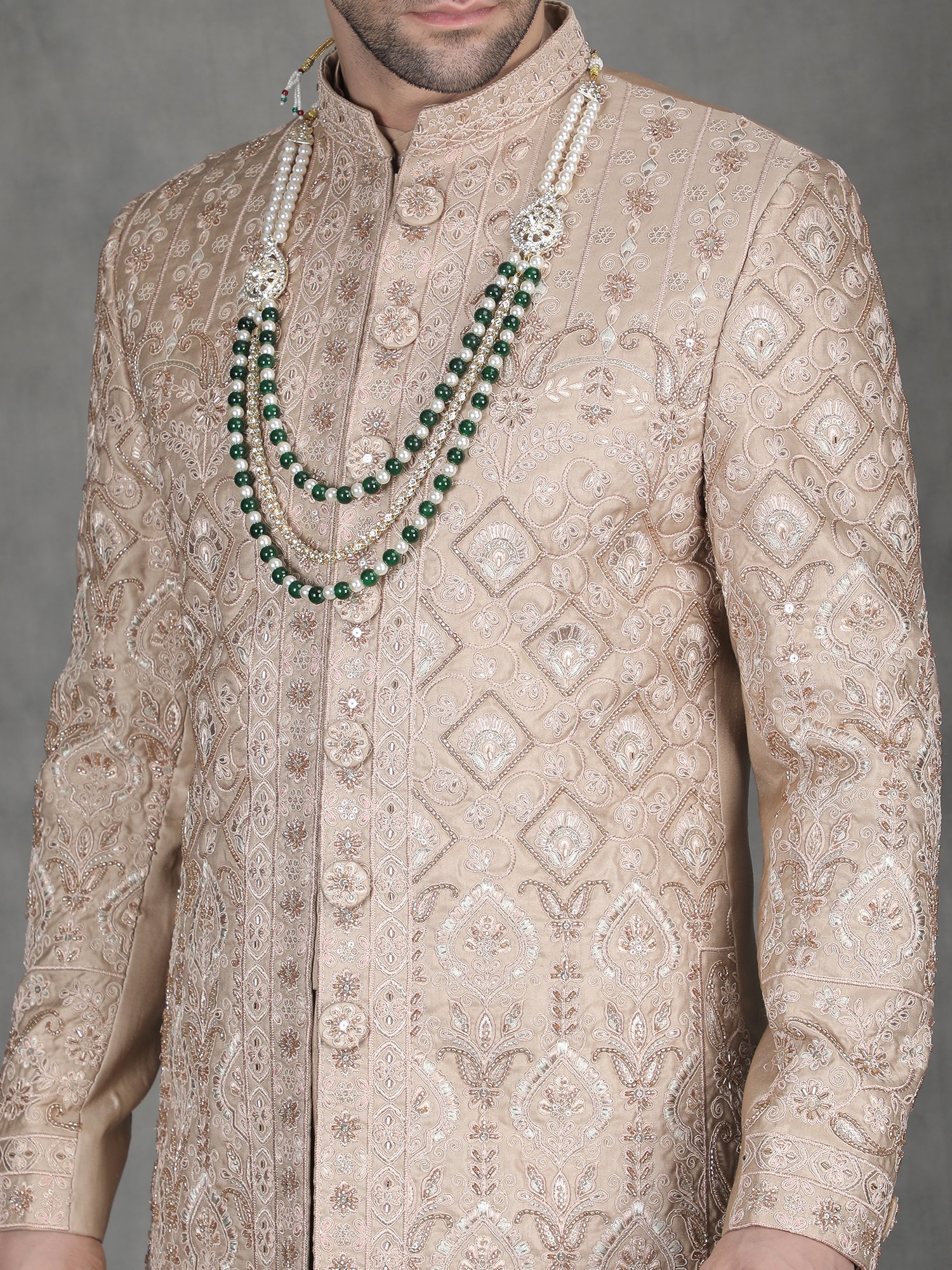 This Peach Thread Embroidery Sherwani is designed for men who want a soft yet richly detailed wedding look with visible craftsmanship. The warm peach tone creates a refined and elegant base, while dense thread embroidery builds a luxurious surface across the outfit. The embroidery is highly detailed, featuring symmetrical patterns, floral motifs, and structured panel work that give depth and dimension. Each motif is carefully crafted with fine thread work that creates a slightly raised texture, making the outfit visually rich and premium. Therefore, this sherwani becomes an ideal choice for weddings, receptions, and grand celebrations where detailing defines the outfit. Moreover, the structured silhouette enhances the personality, offering a confident and graceful presence.