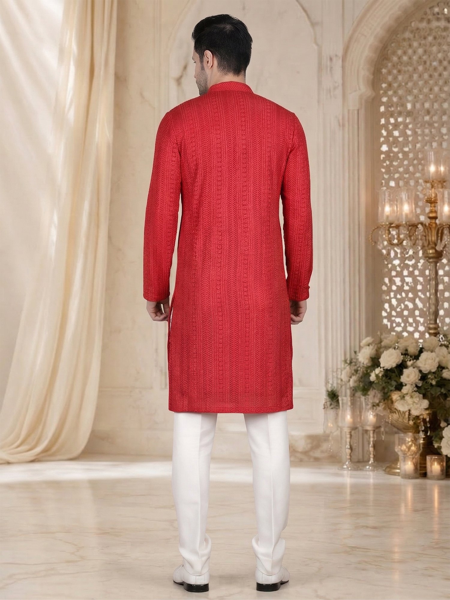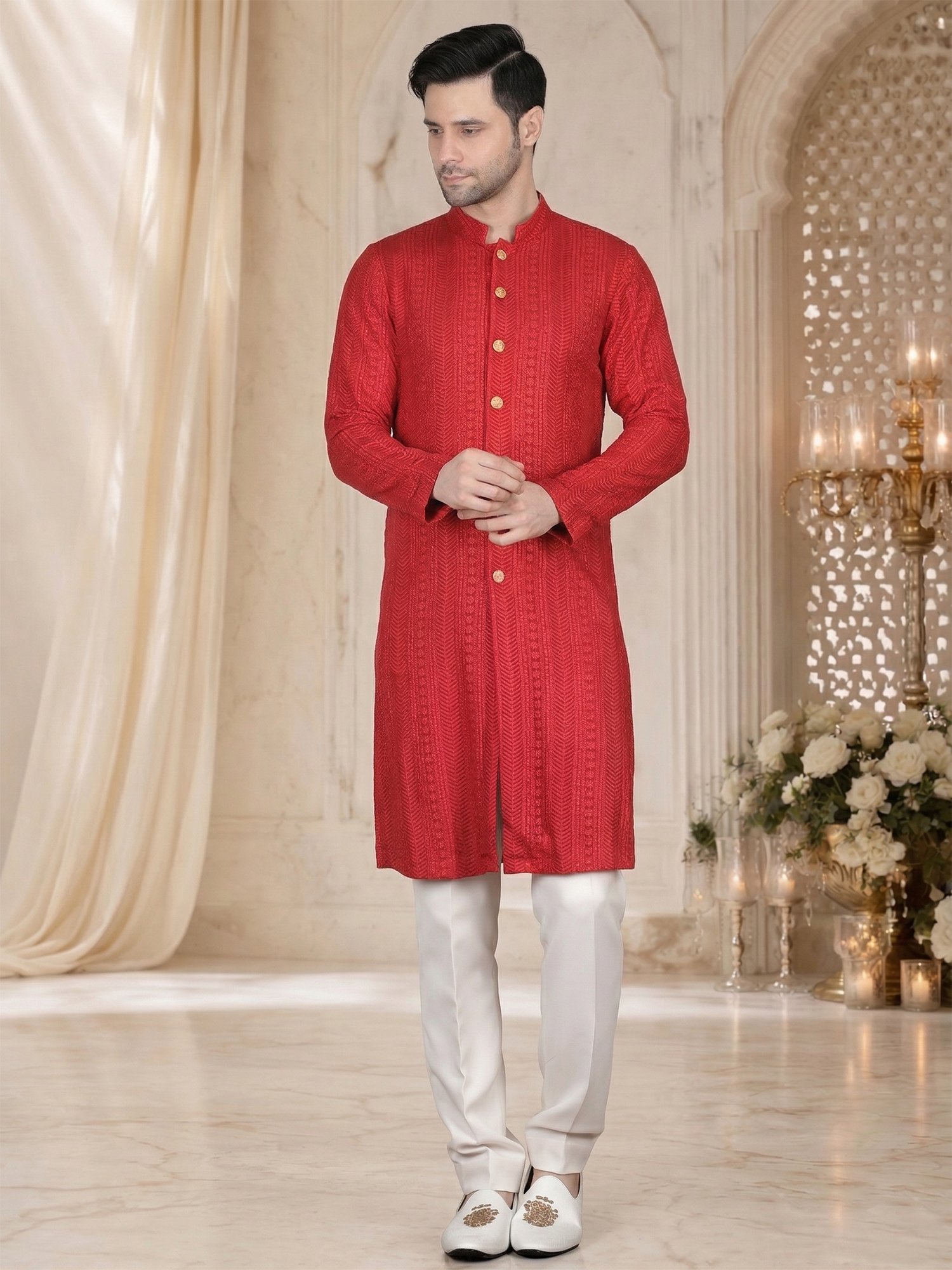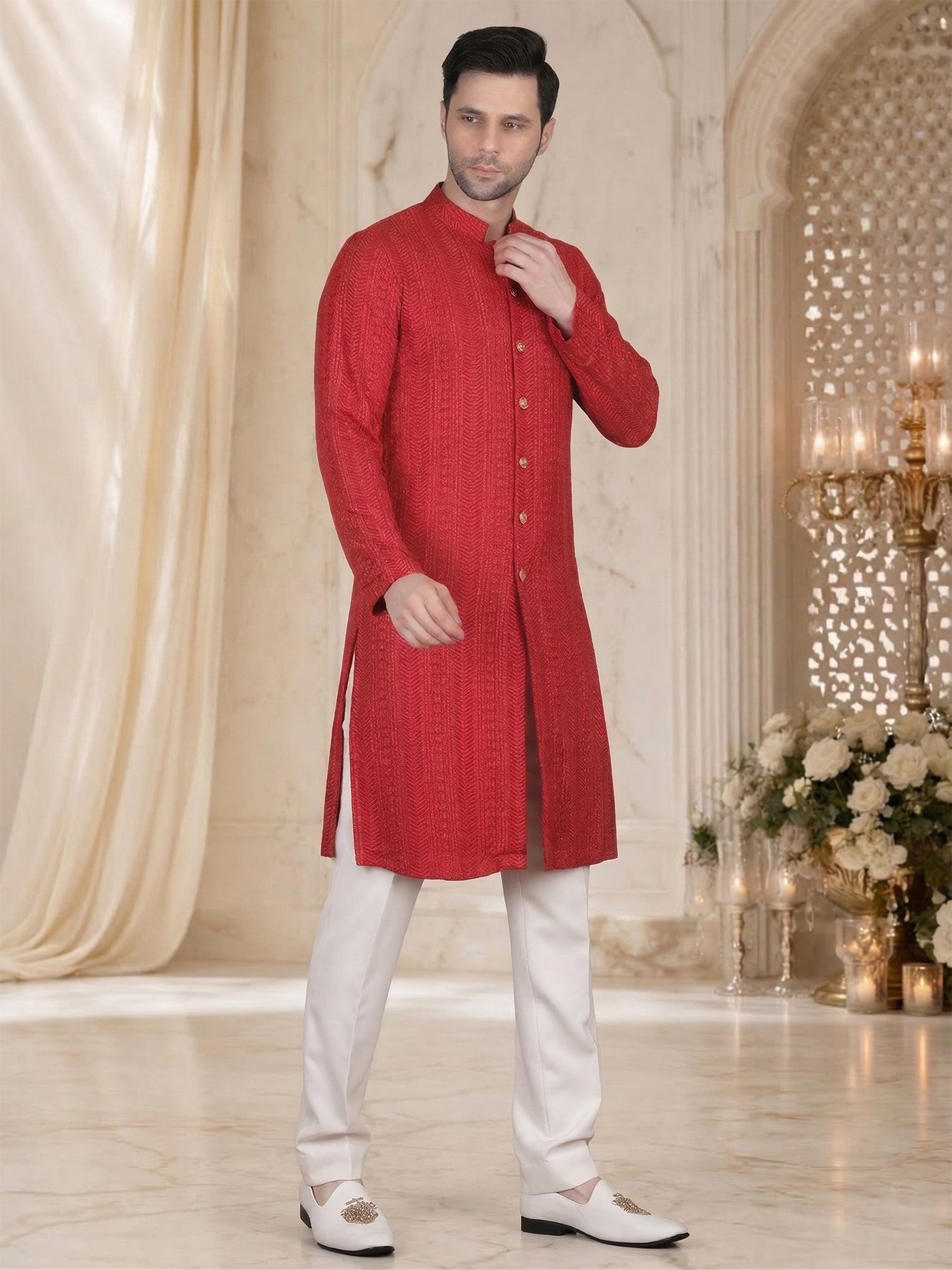 This Red Textured Embroidery Kurta Set is designed for reception occasions where bold color and subtle detailing create a strong and elegant look. The kurta features fine textured embroidery arranged in vertical patterns, which adds depth and structure to the fabric. The embroidery blends smoothly with the rich red base, so it enhances the overall design without making it heavy. Therefore, this Red Textured Embroidery Kurta Set becomes a perfect choice for men who want a clean yet stylish appearance for reception events. Moreover, the vibrant red tone creates a confident and festive presence.