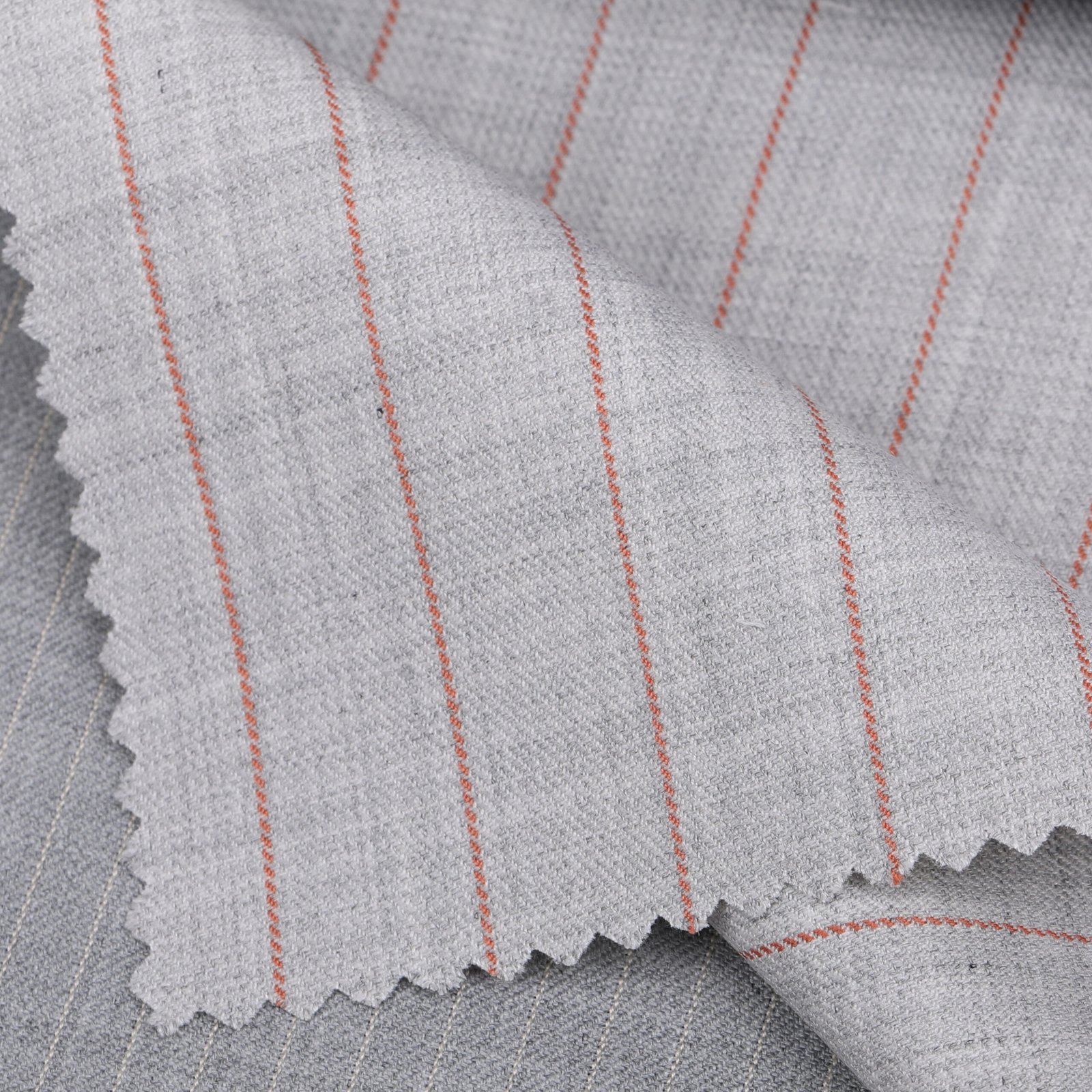 A distinctive expression of modern luxury, this silver-grey fabric is elevated with fine red pinstripes that add a bold yet refined character. Its textured surface and elegant drape create a striking visual appeal, making it an ideal choice for statement tailoring and contemporary formal wear.