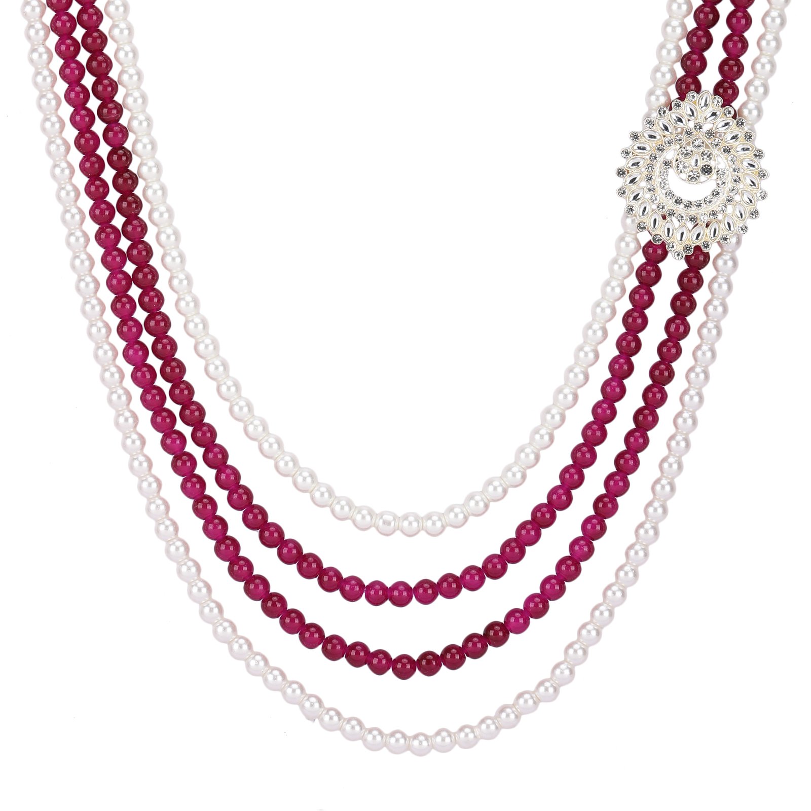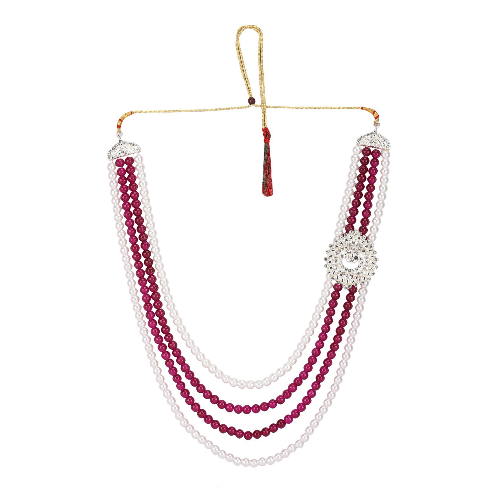 Complete your ceremonial look with this Royal Pearl & Ruby Multi-Layer Sherwani Mala, a luxurious accessory designed for weddings and special ethnic occasions. This elegant necklace features multiple cascading strands that alternate between pearl-style white beads and rich ruby/magenta beads, creating a vibrant and royal color contrast.