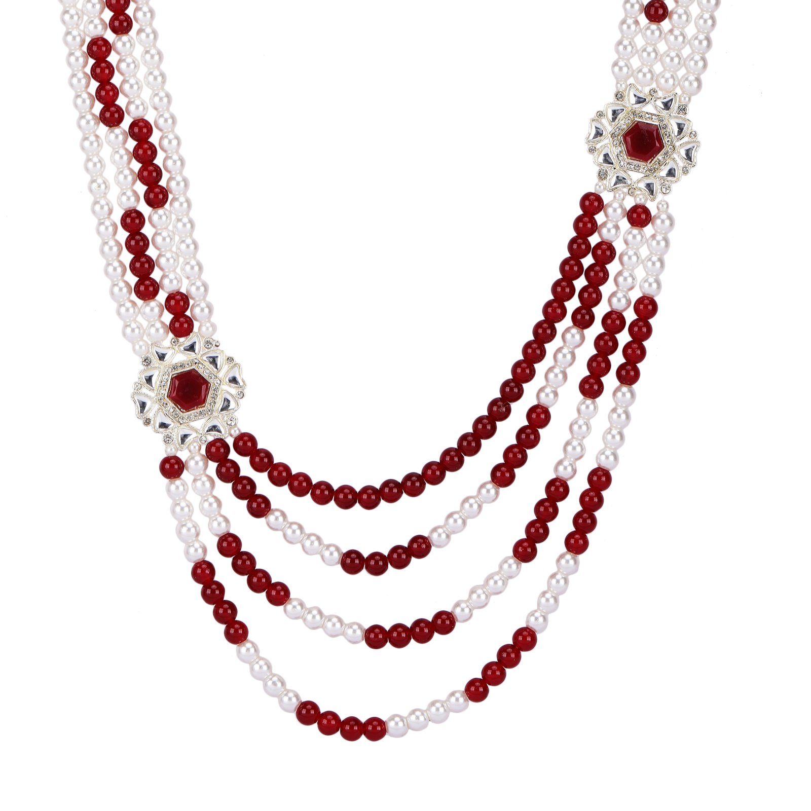 Enhance your ceremonial outfit with this Royal Pearl & Ruby Sherwani Mala, a classic piece of ethnic jewelry designed for weddings and festive celebrations. This elegant necklace features multiple cascading strands of pearl-style white beads and rich ruby-red beads, creating a luxurious layered design that drapes beautifully over sherwanis and other traditional outfits.