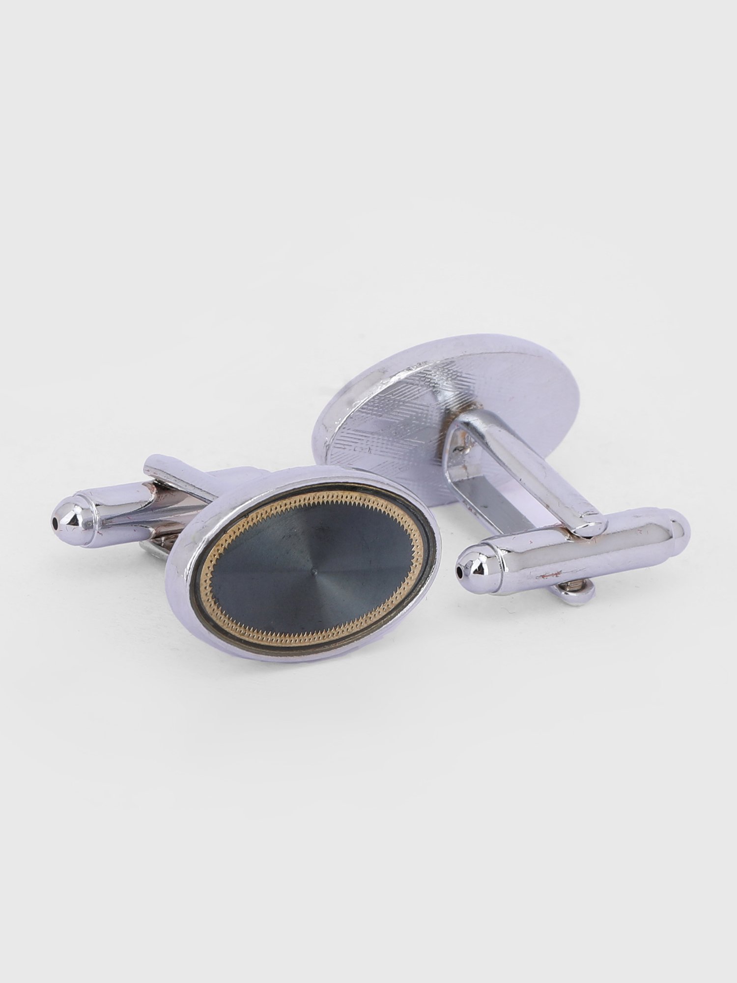 Silver-Tone Oval Black Stone Cufflinks with Gold Rim