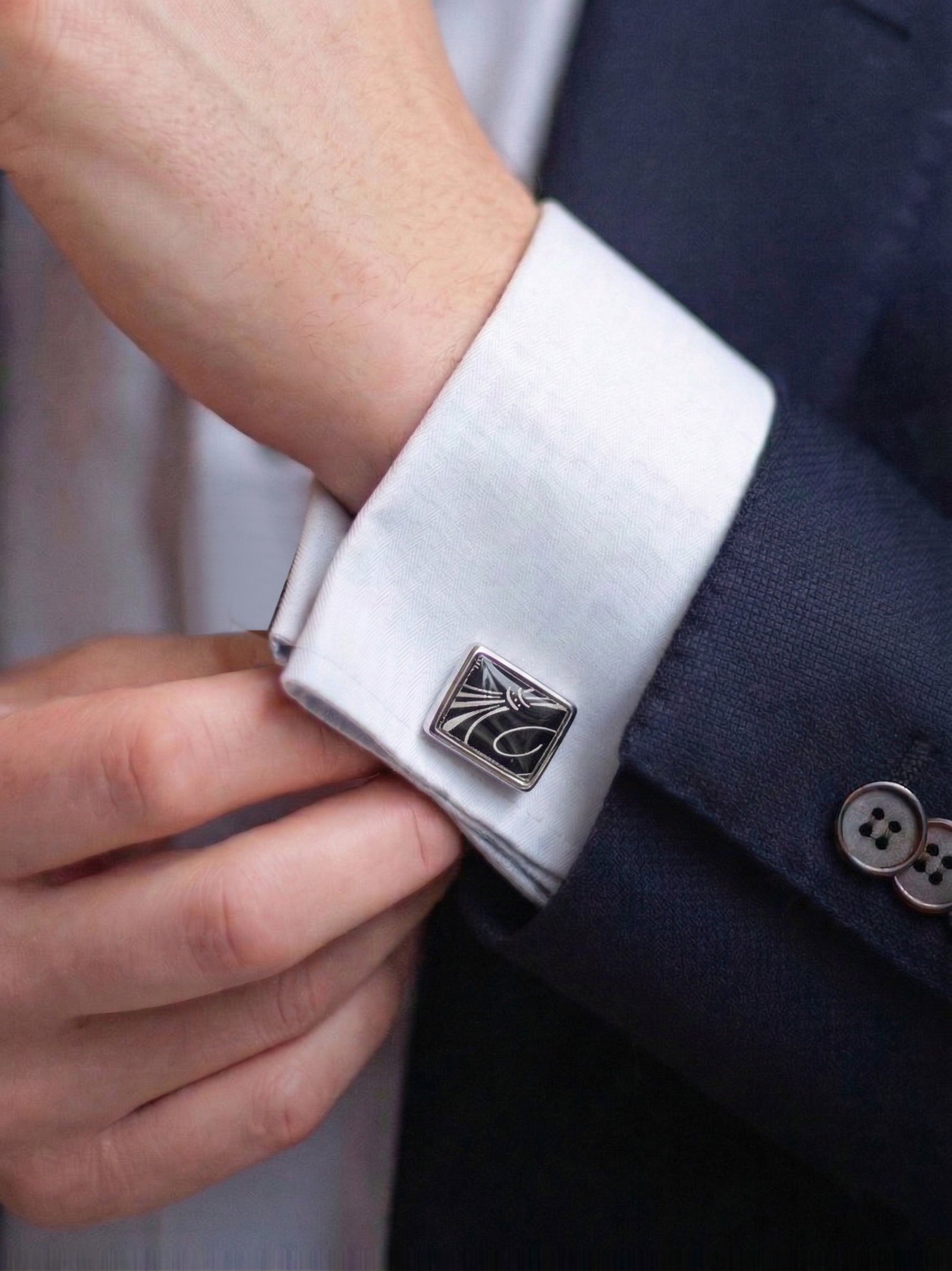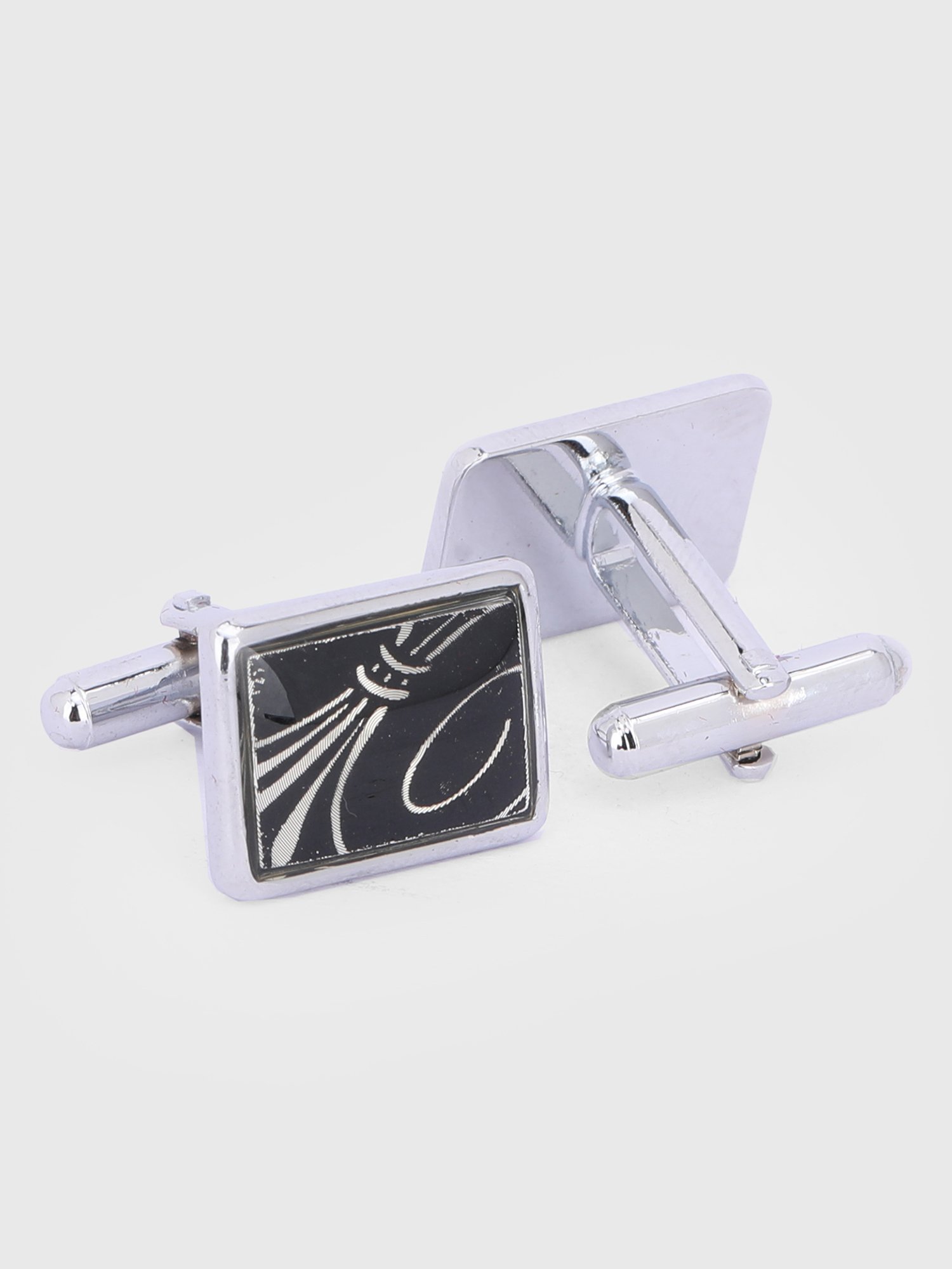 Modern design with a refined edge, these silver-tone cufflinks are crafted for the gentleman who appreciates subtle detailing. Featuring a sleek square shape with a deep black base enhanced by elegant wave-like pattern accents, they bring a contemporary yet sophisticated touch to any outfit. Perfectly balanced between minimal and stylish, these cufflinks elevate both formal and ethnic looks effortlessly.